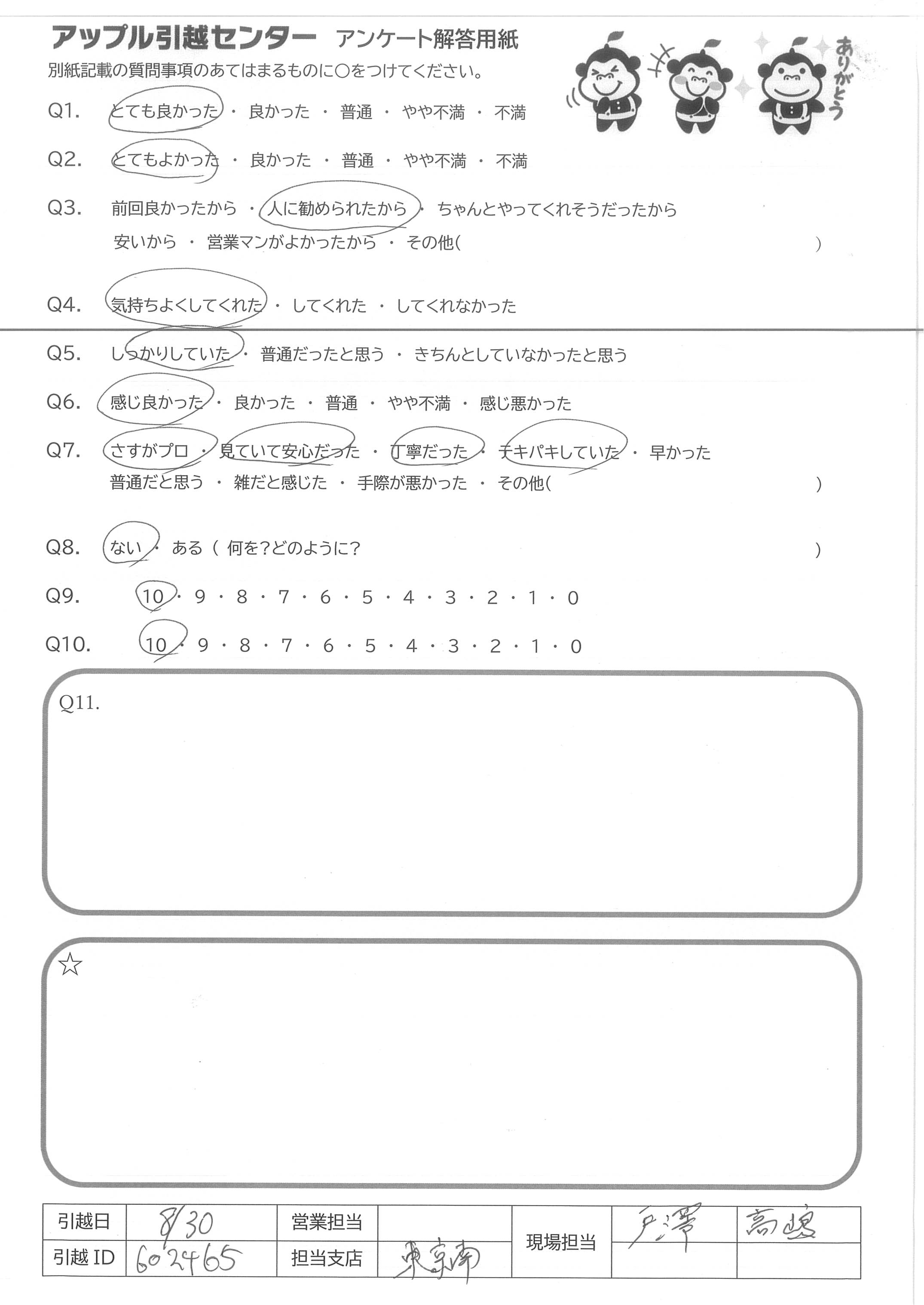 A.引っ越し前に見積書の作成をお願いした際に即座に対応して頂きとても助かりました。