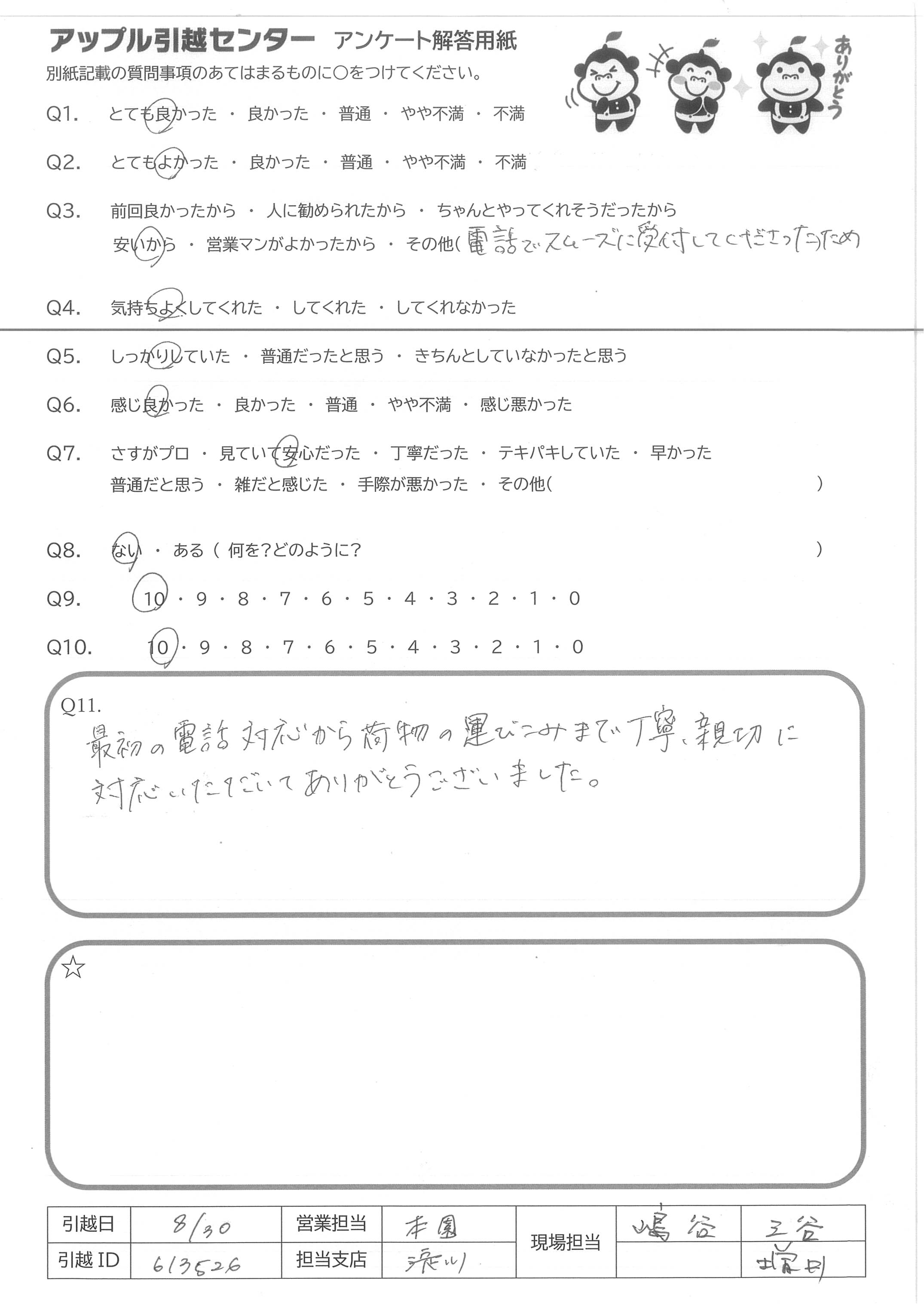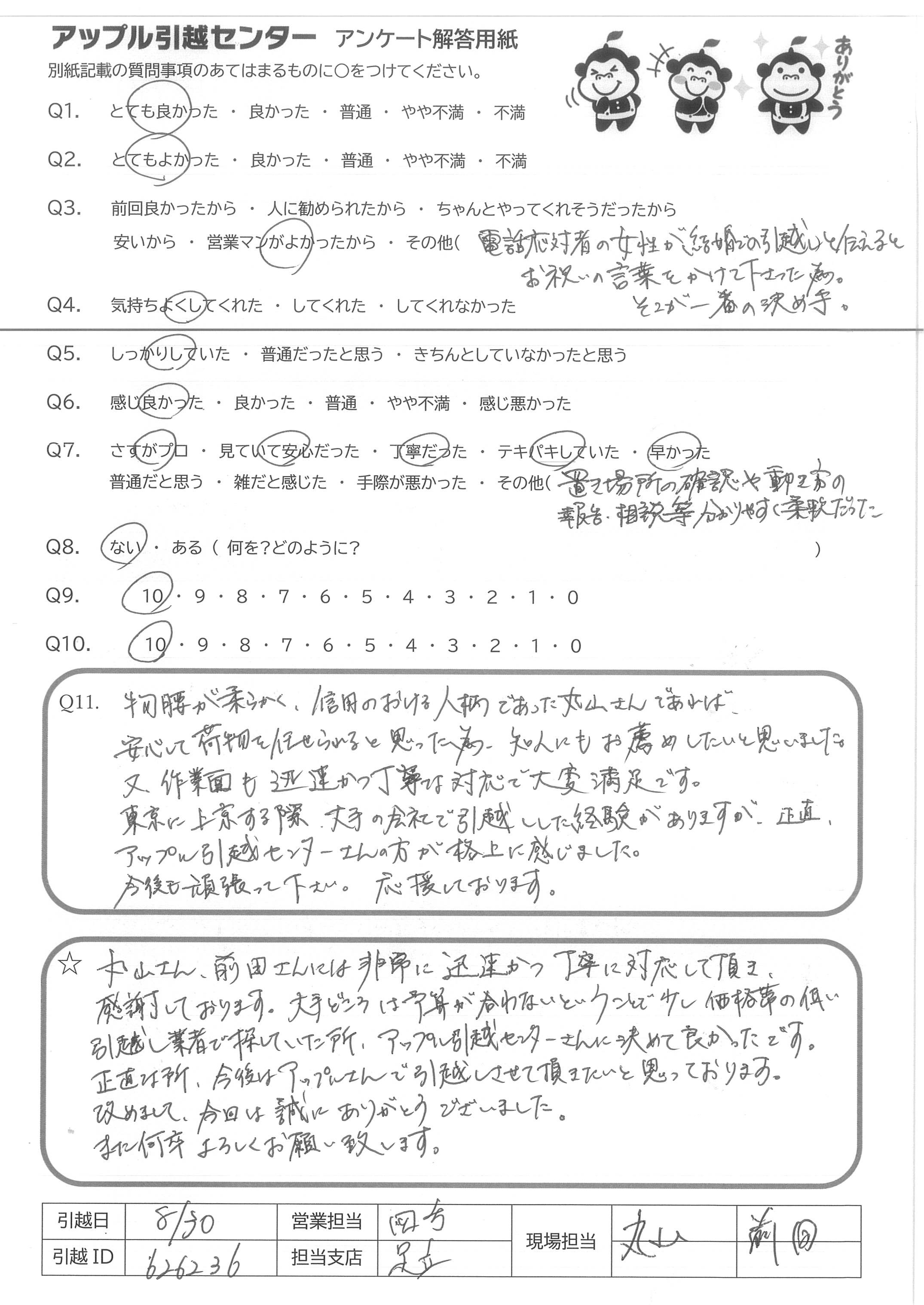A.物腰が柔らかく、信用のおける人物であった丸山さんであれば、安心して荷物を任せられると思った為、知人にもお薦めしたいと思いました。又作業面も迅速かつ丁寧な対応で大変満足です。東京に上京する際、大手の会社で引越しした経験がありますが、正直アップル引越センターさんの方が格上に感じました。今後も頑張って下さい。応援しております。