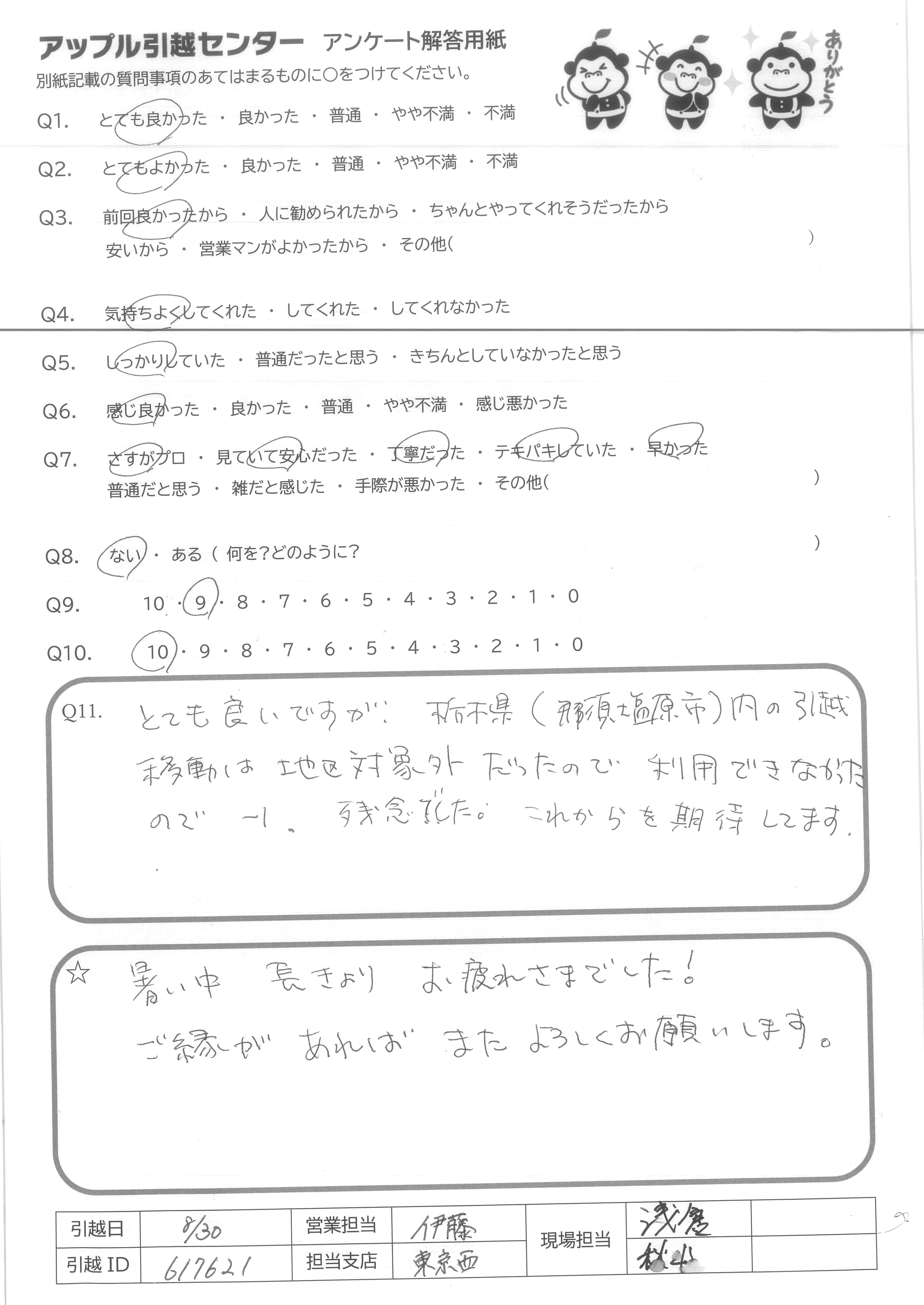 引越し日:2020年08月30日 エリア:栃木県那須塩原市