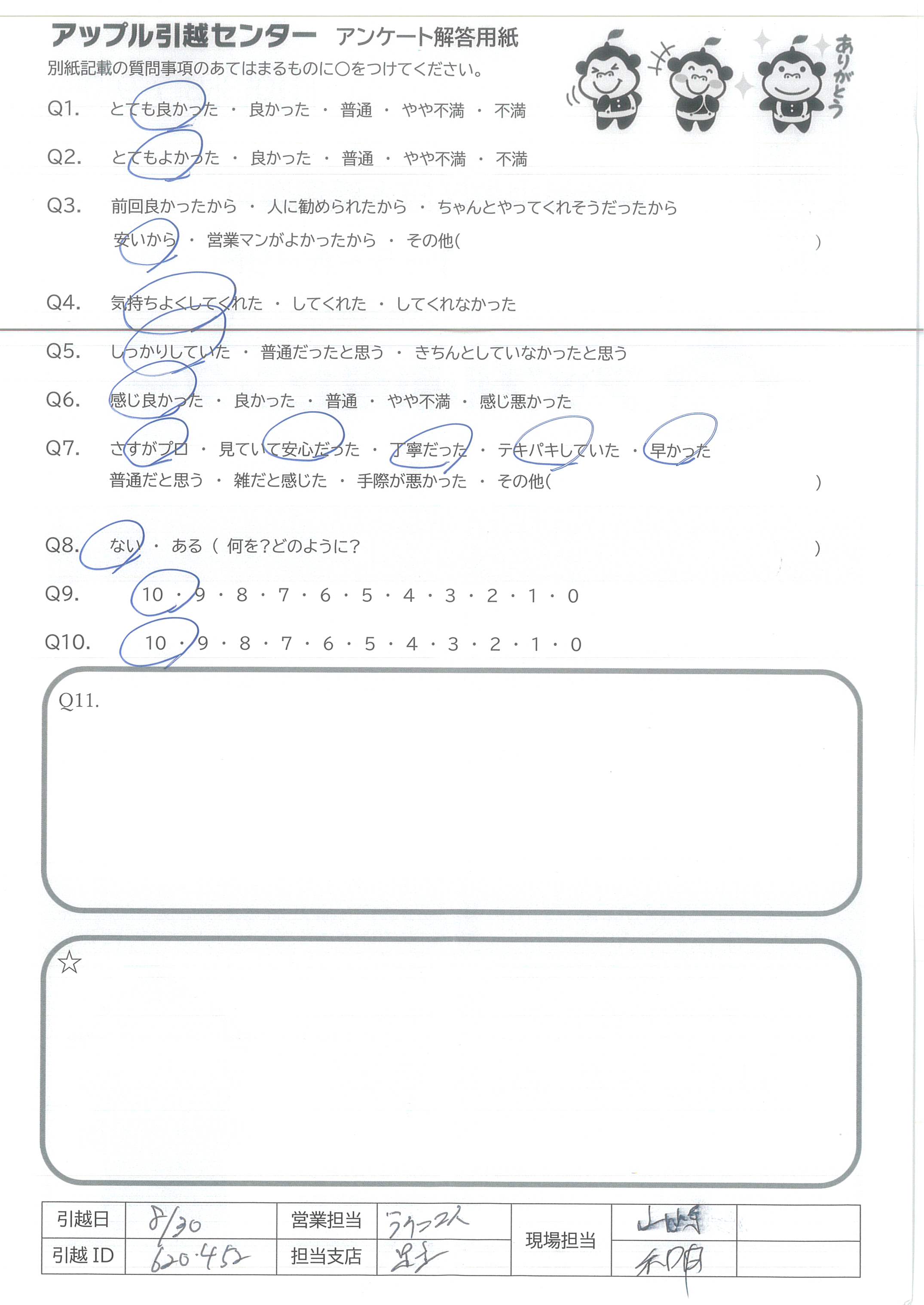 A.丸山さん、前田さんには非常に迅速かつ丁寧に対応して頂き、感謝しております。大手どころは予算が合わないということで少し価格帯の低い引越し業者で探していた所、アップル引越センターさんに決めて良かったです。正直な所、今後はアップルさんで引越しさせて頂きたいと思っております。改めまして、今回は誠にありがとうございました。また何卒よろしくお願い致します。