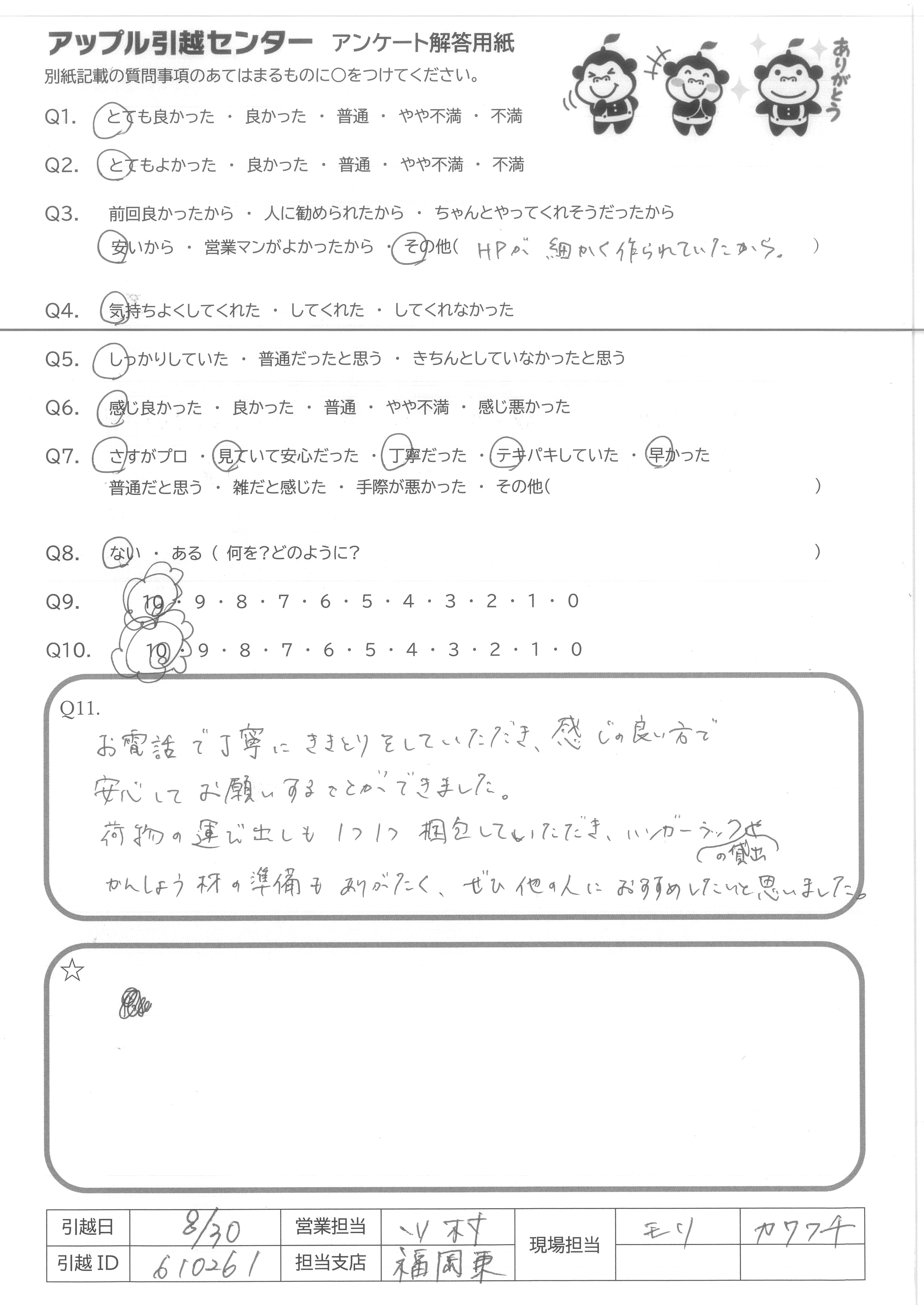 A.現場担当の方が時間よりも早く来てくださって大変助かりました。また、荷造りが終わっていなかったのですが、イヤな顔1つせずとても優しく対応して下さったこと本当に感謝しています。仕事ぶりもとても素敵でした。またご縁がありましたら是非よろしくお願いいたします。