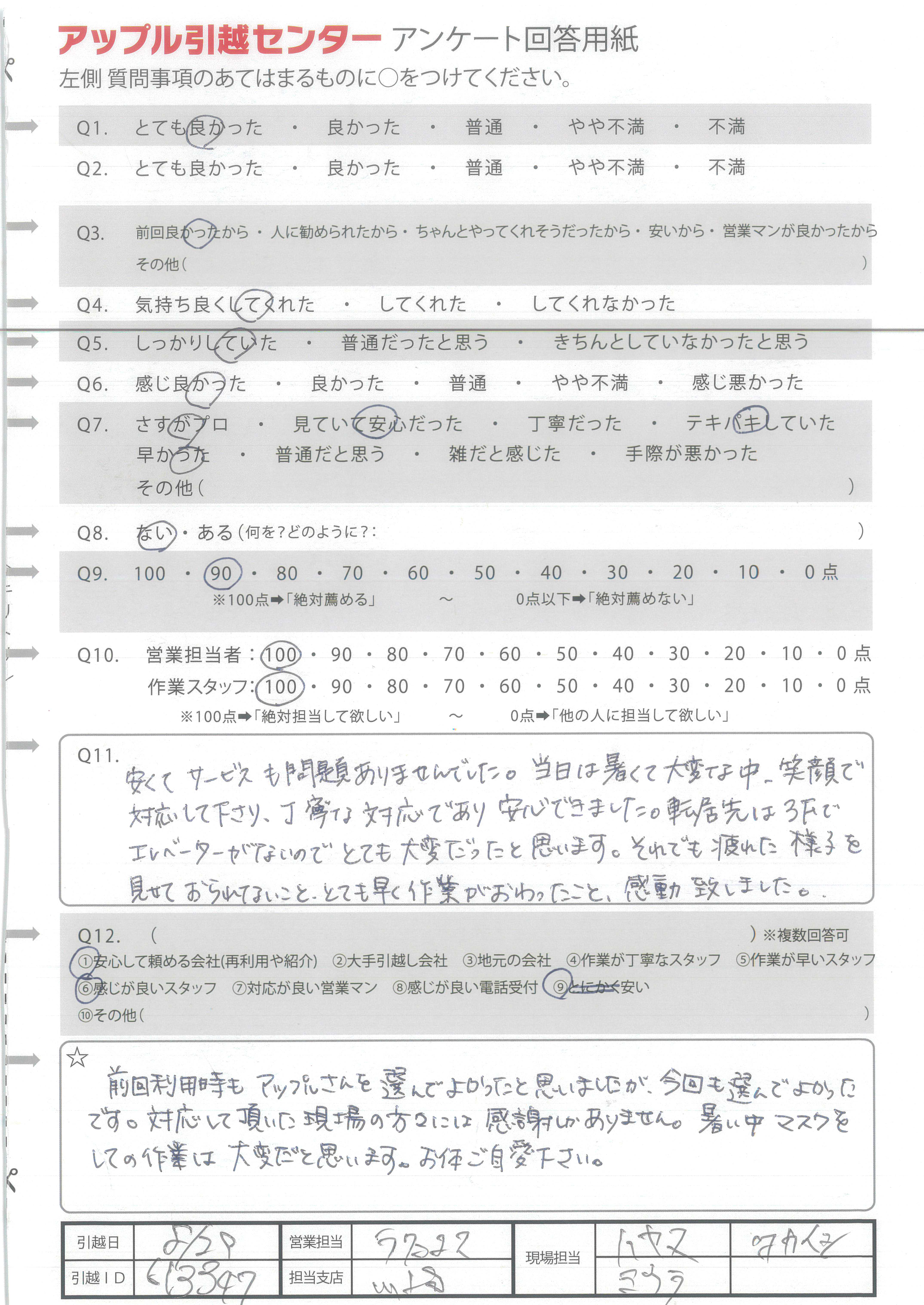 A.安くてサービスも問題ありませんでした。当日は暑くて大変な中、笑顔で対応して下さり、ていねいな対応であり安心できました。転居先は3Fでエレベーターがないのでとても大変だったと思います。それでも疲れた様子を見せておられないこと、とても早く作業が終わったこと、感動致しました。