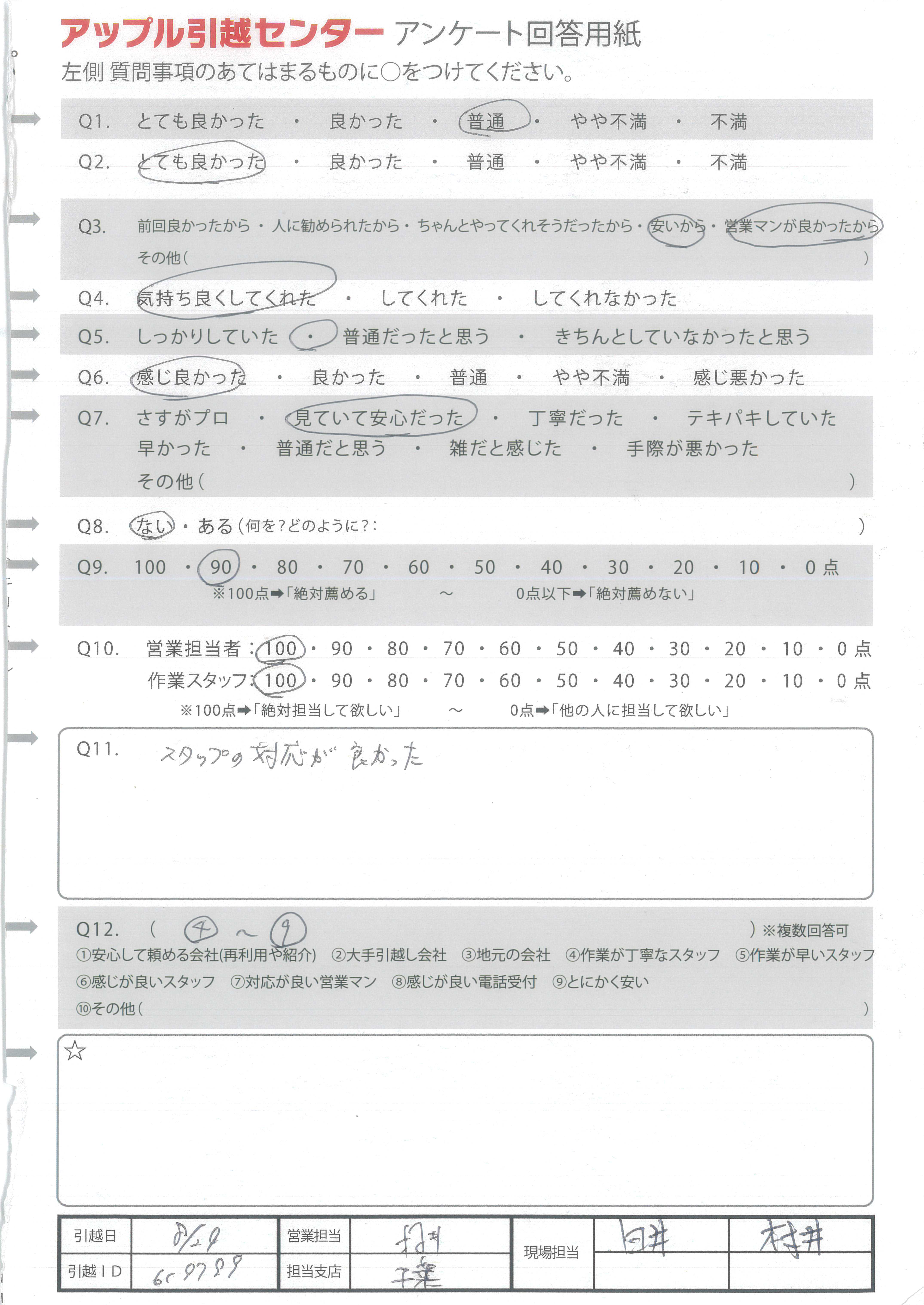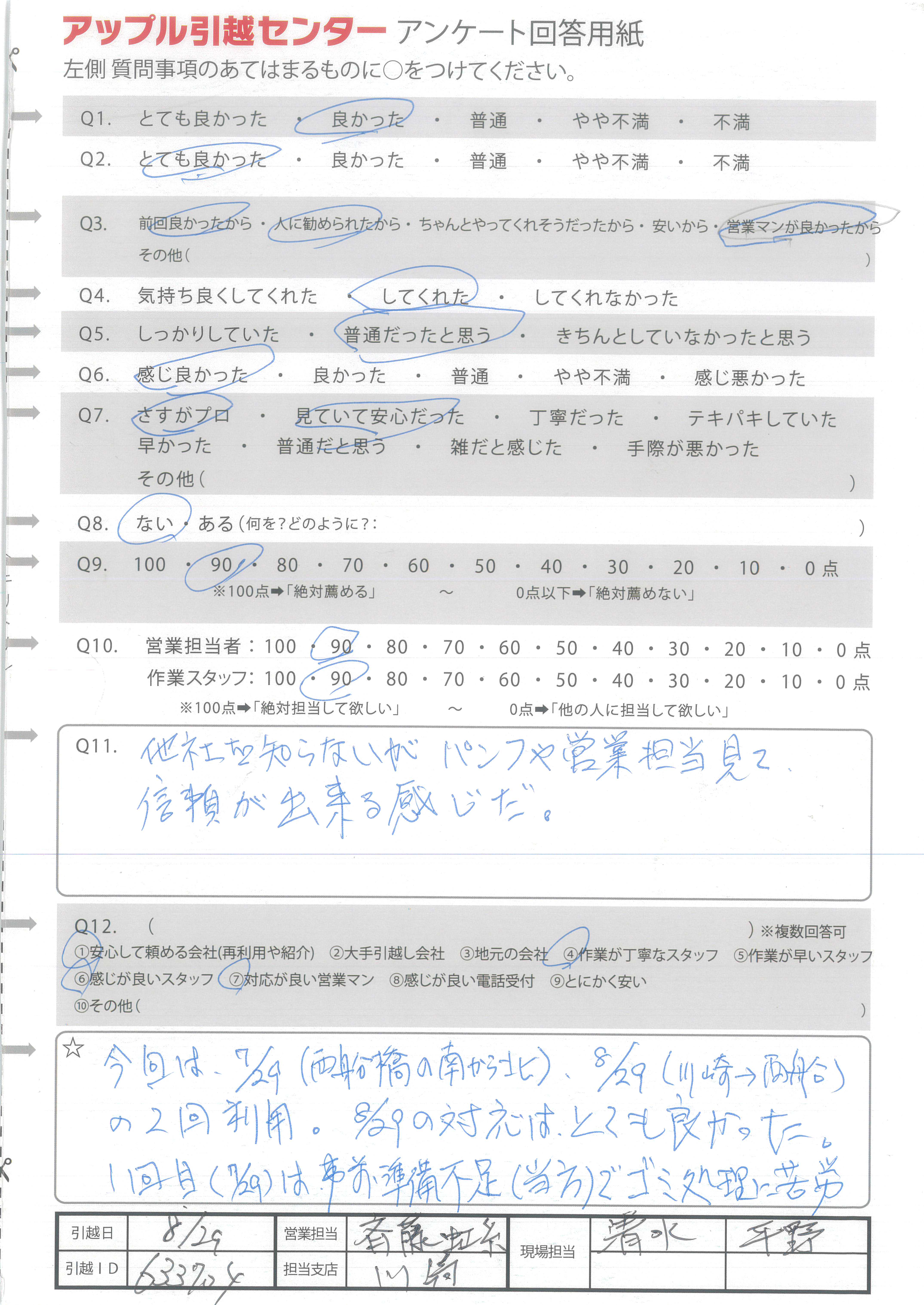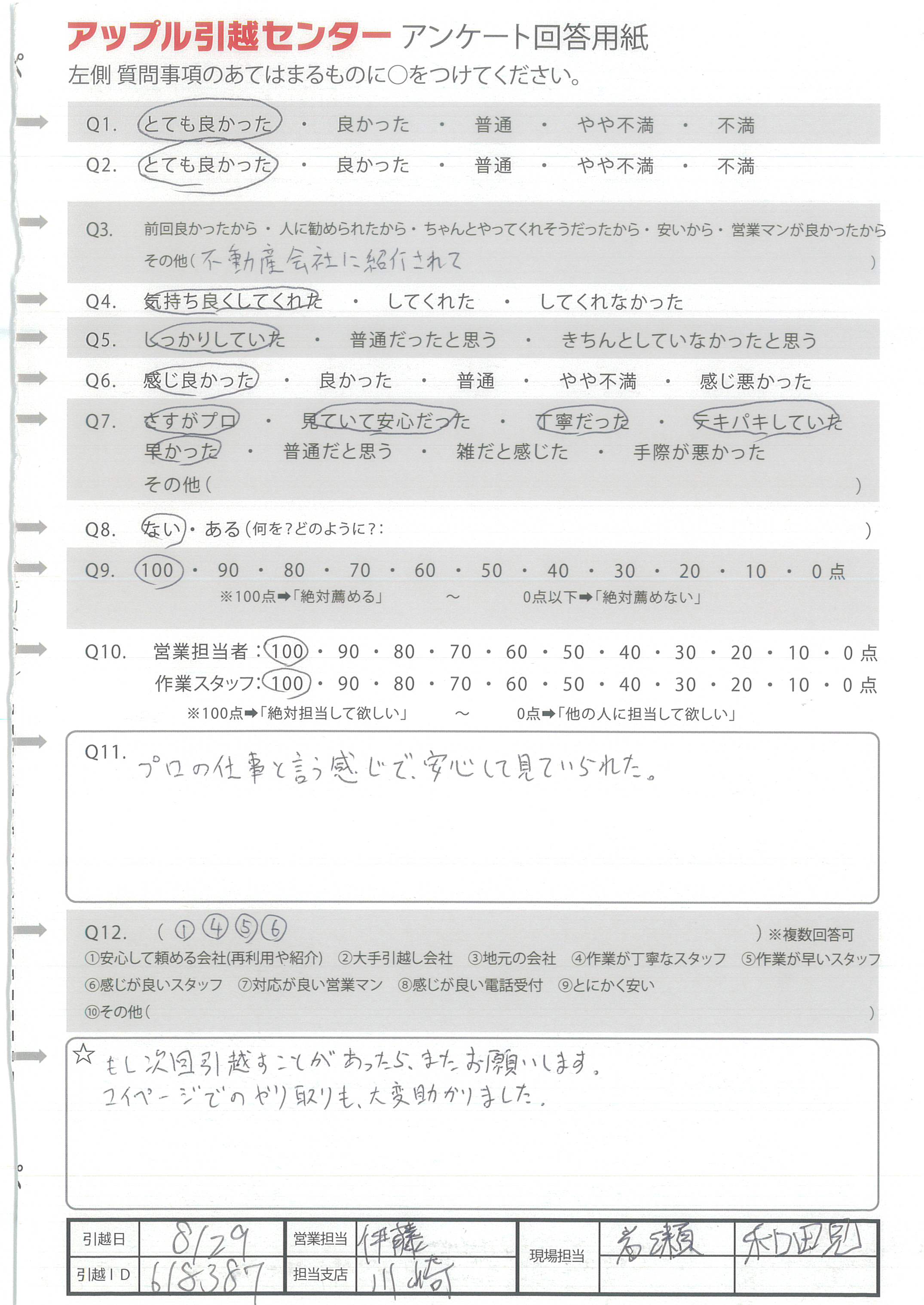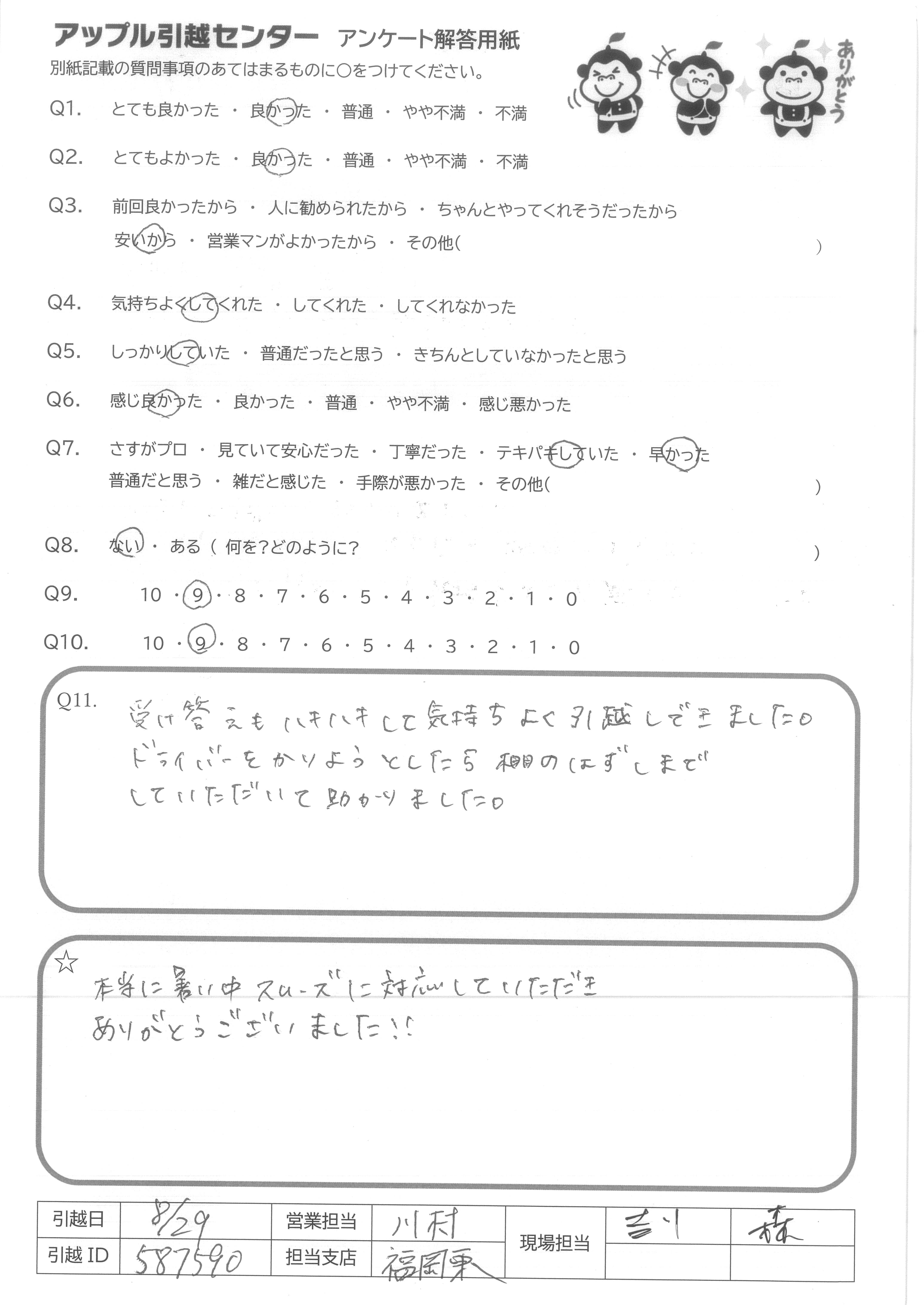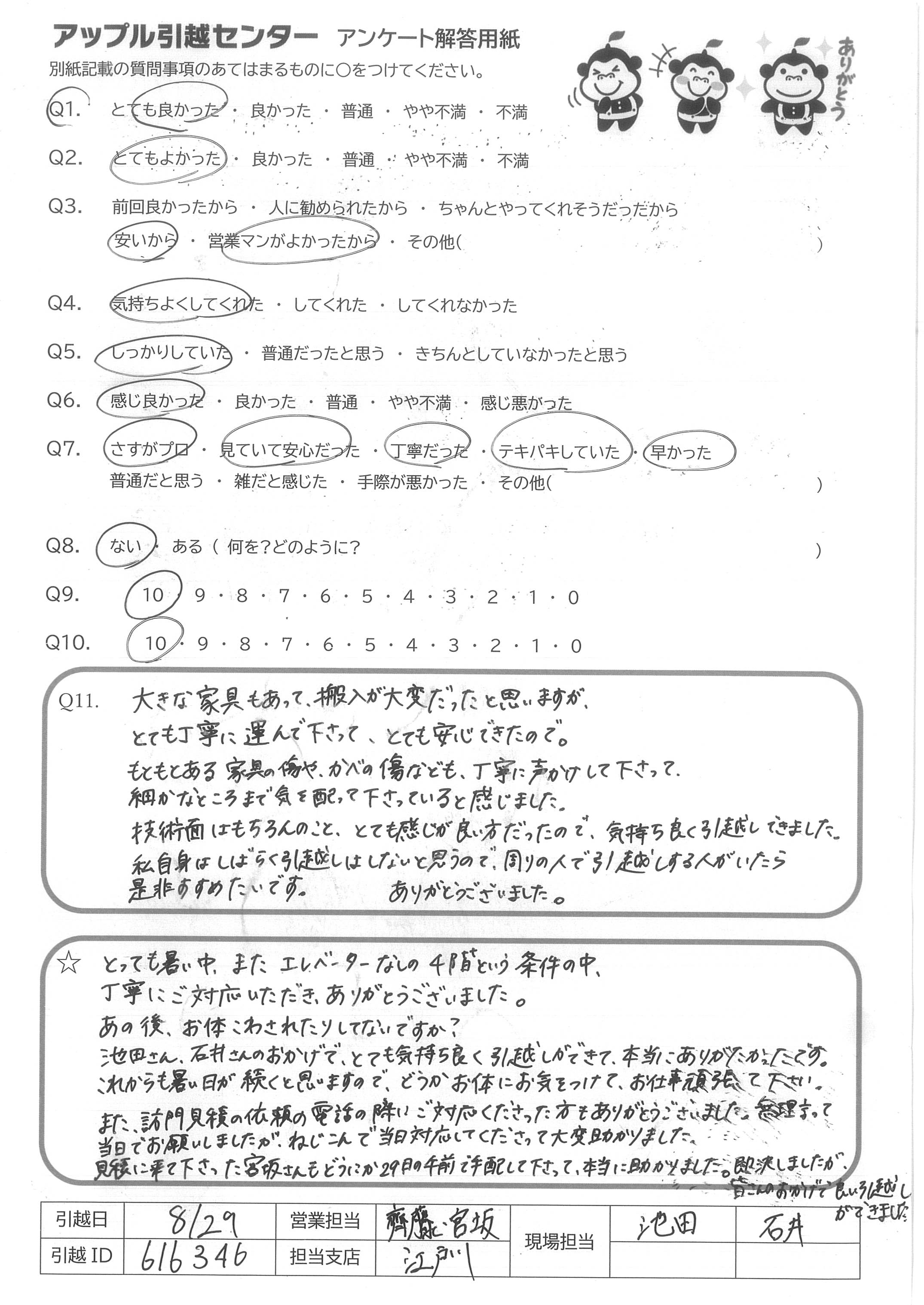 A.とっても暑い中、またエレベーターなしの4階という条件の中、丁寧にご対応いただき、ありがとうございました。あの後、お体こわされたりしてないですか? 池田さん、石井さんのおかげで、とても気持ち良く引越しができて、本当にありがたかったです。 これからも暑い日が続くと思いますので、どうかお体にお気をつけて、お仕事頑張って下さい。また、訪問見積の依頼の電話の際にご対応くださった方もありがとうございました。無理言って当日でお願いしましたが、ねじこんで当日対応してくださって大変助かりました。見積に来て下さった宮坂さんもどうにか29日の午前で手配して下さって、本当に助かりました。即決しましたが、皆さんのおかげで良い引越しができました。