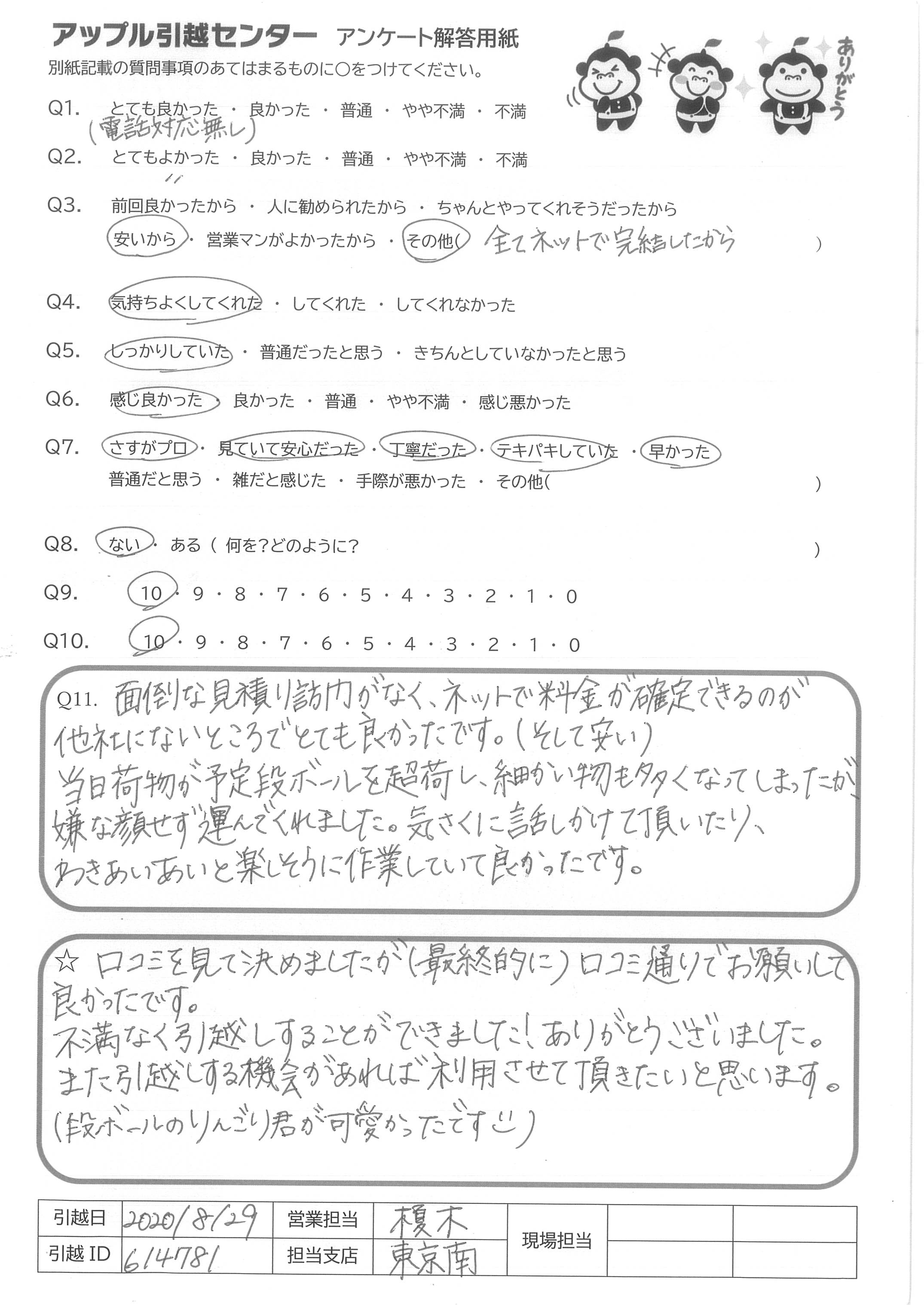 A.口コミを見て決めましたが(最終的に)口コミ通りでお願いして良かったです。不満なく引越しすることができました!ありがとうございました。また引越しする機会があれば利用させて頂きたいと思います。(段ボールのりんごり君が可愛かったです)
