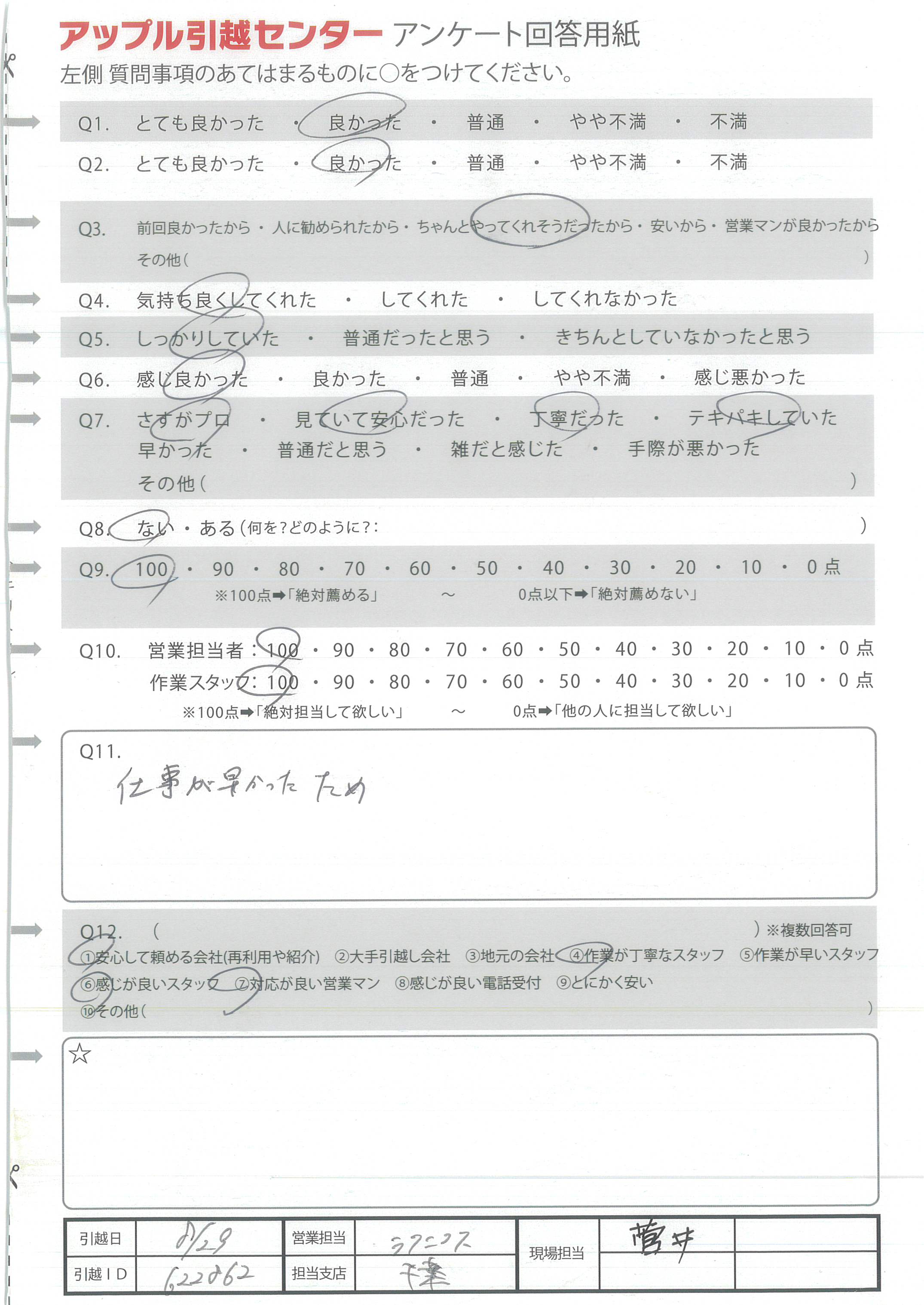 A.大きな家具もあって、搬入が大変だったとお見ますが、とても丁寧に運んで下さって、とても安心できたので。もともとある家具の傷や、かべの傷なども丁寧に声かけして下さって、細かなところまで気を配って下さっていると感じました。技術面はもちろんのこと、とても感じが良い方だったので、気持よく引越しできました。私自身はしばらく引越しはしないと思うので、周りの人で引越しする人がいたら是非すすめたいです。ありがとうございました。