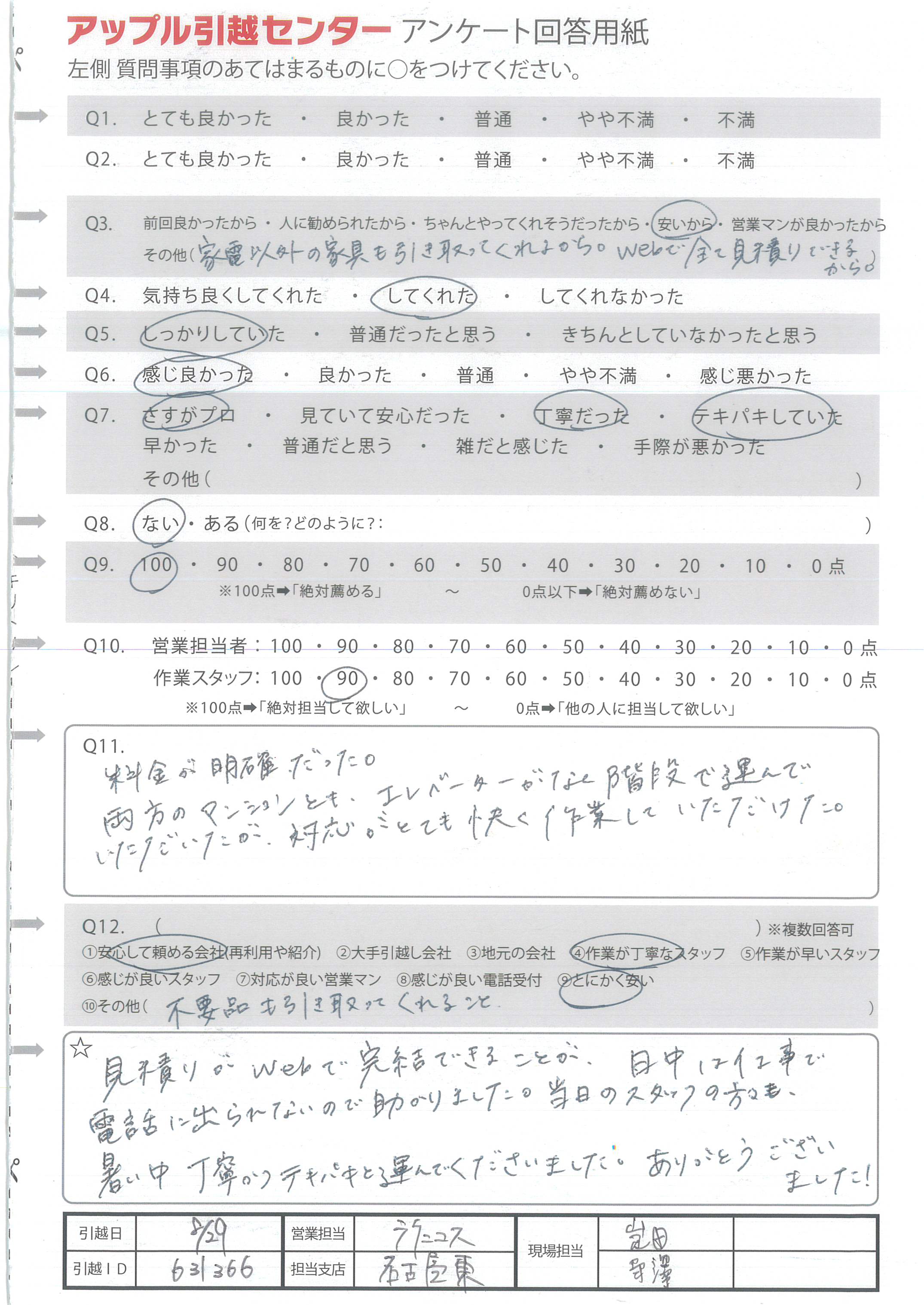 A.料金が明確だった。両方のマンションとも、エレベーターがなく階段で運んでいただいたが、対応がとても快く作業していただけた。