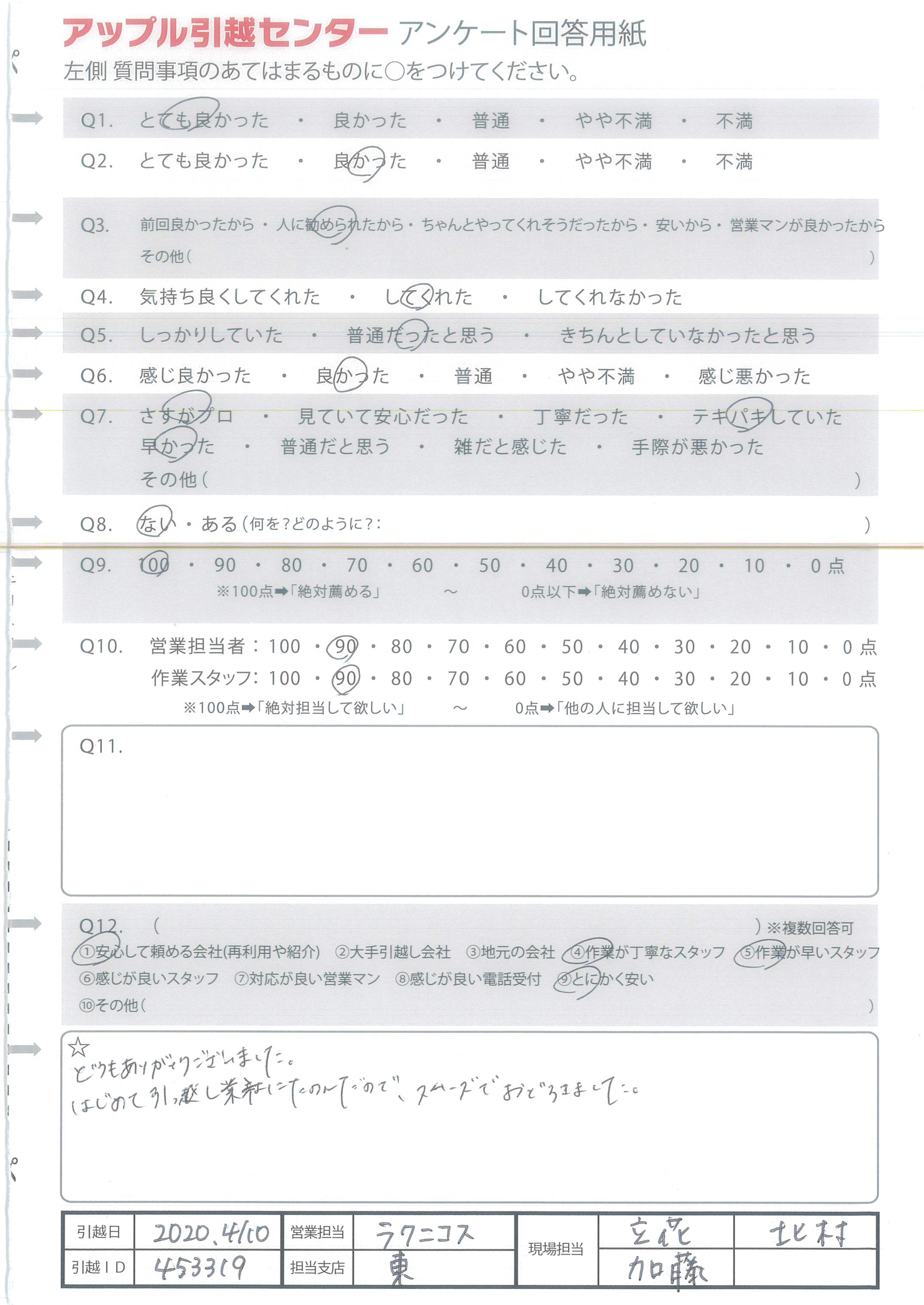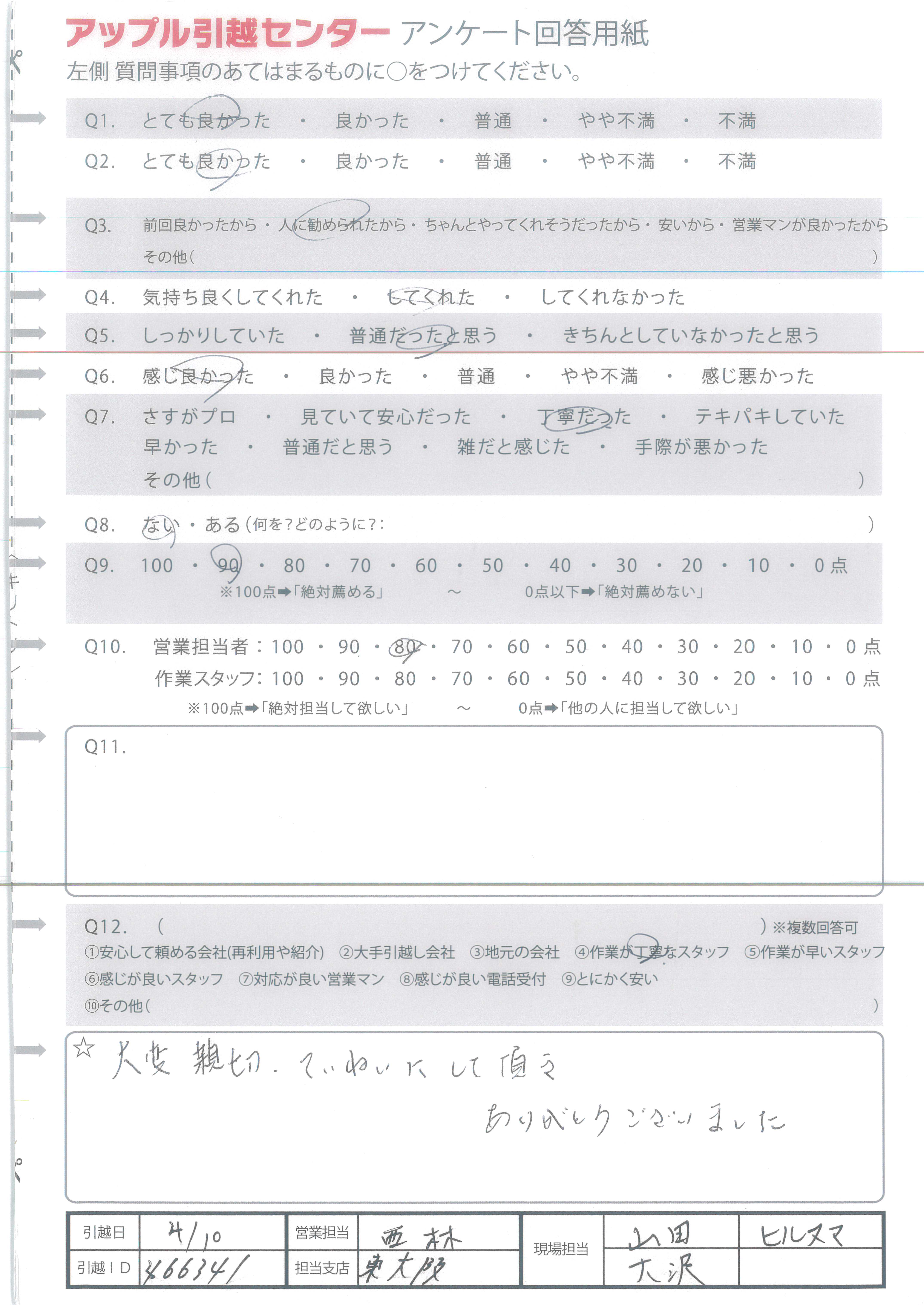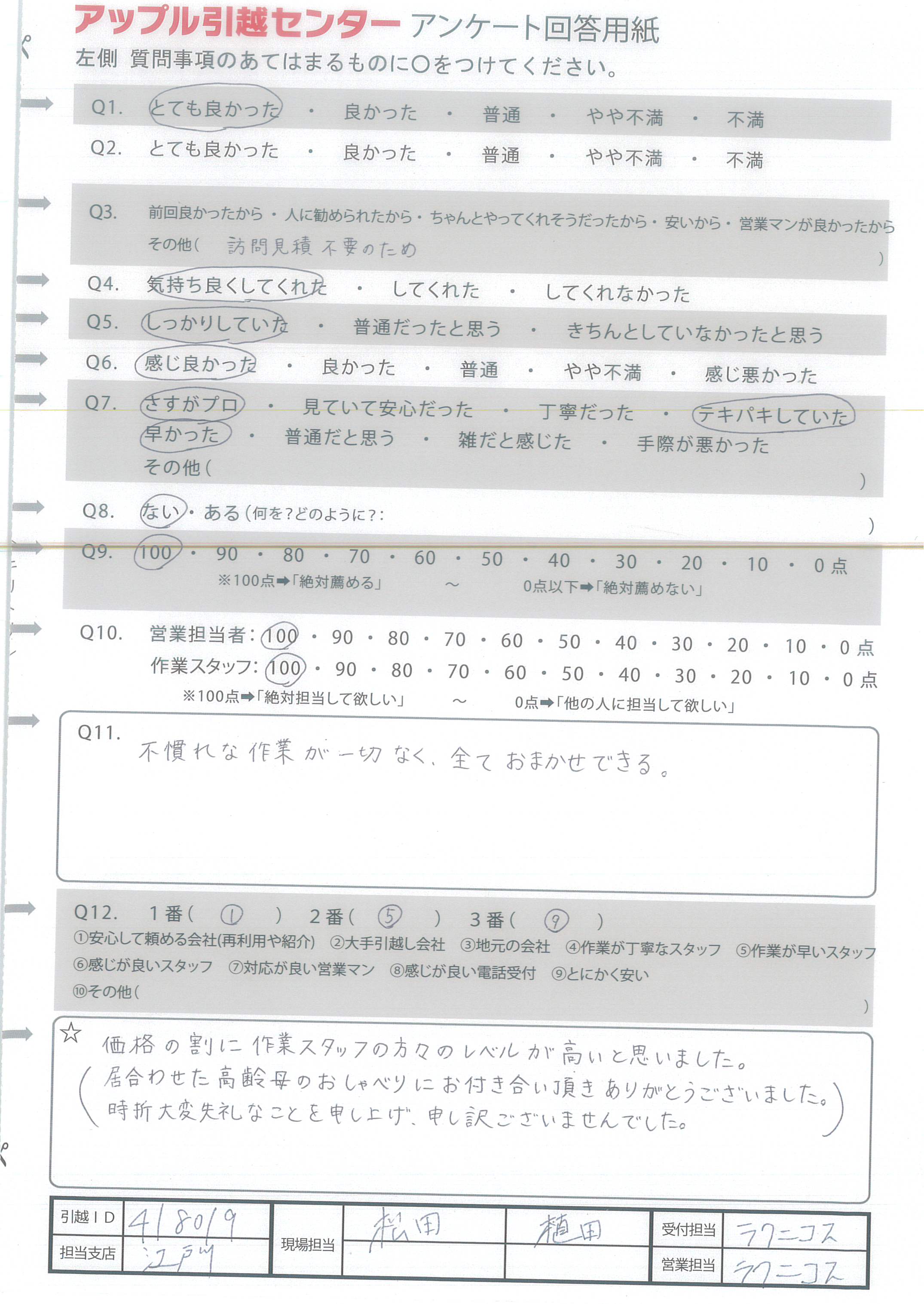 A.今回の引越しにおいて、全ての対応が、すばらしかったです。
