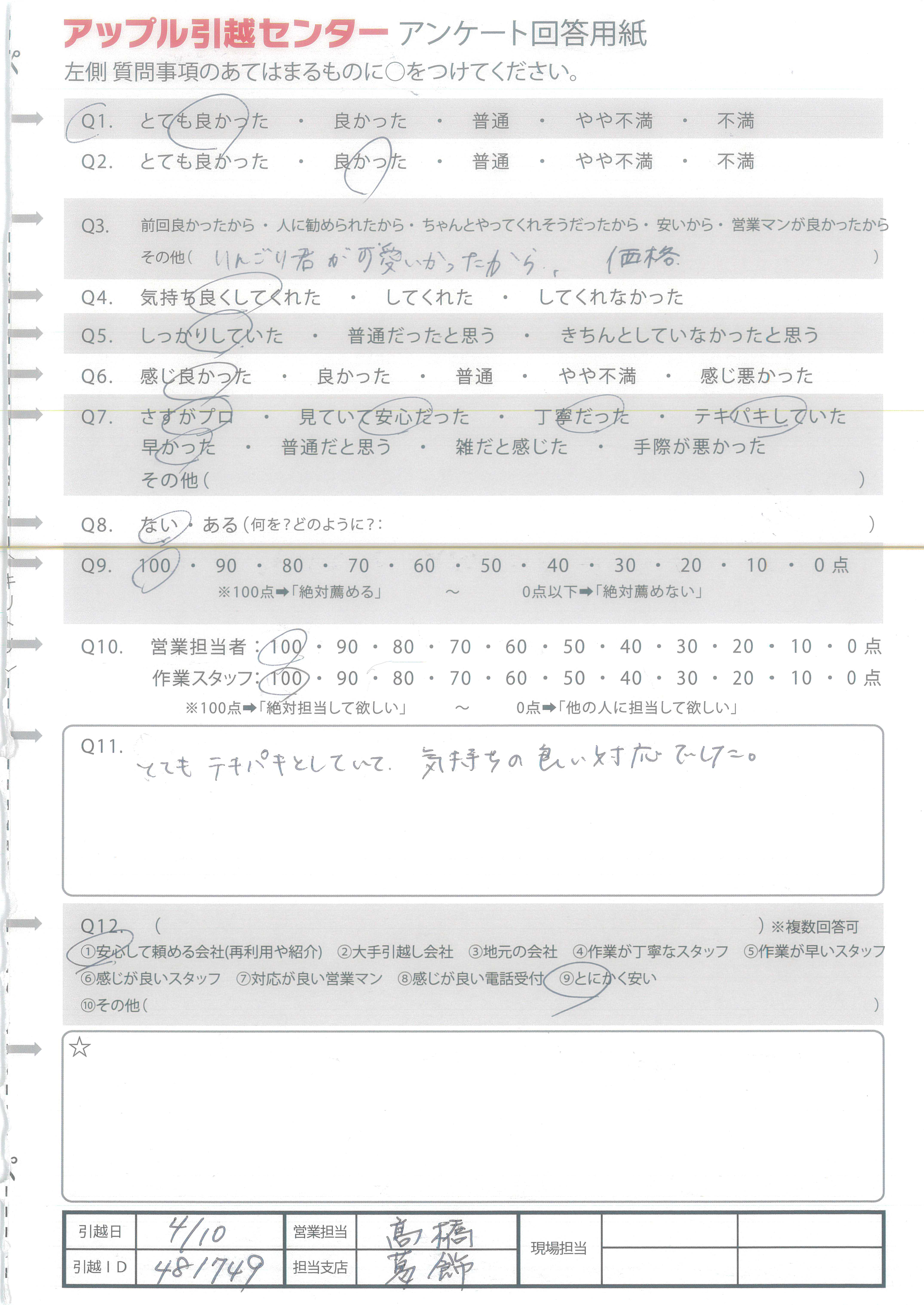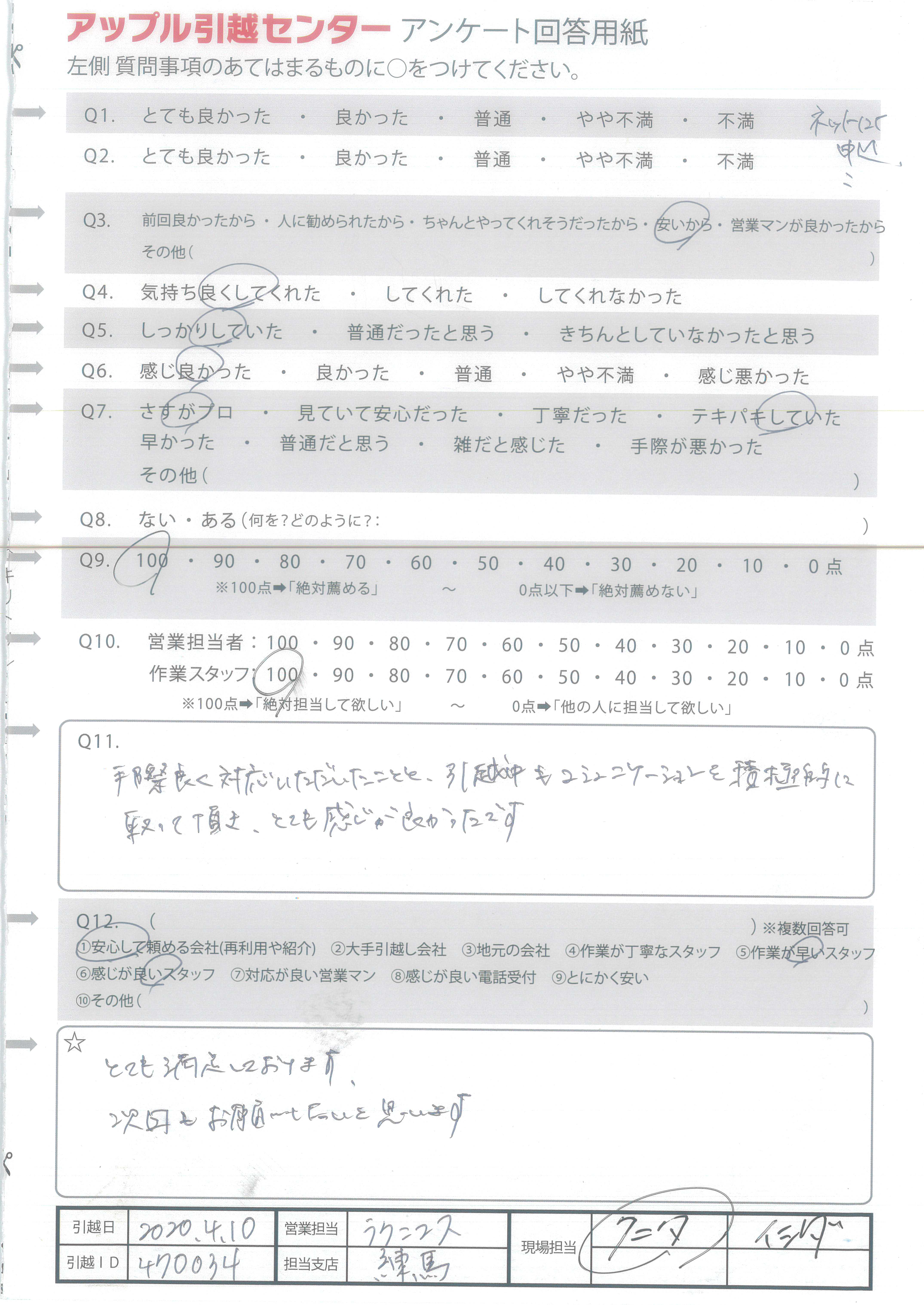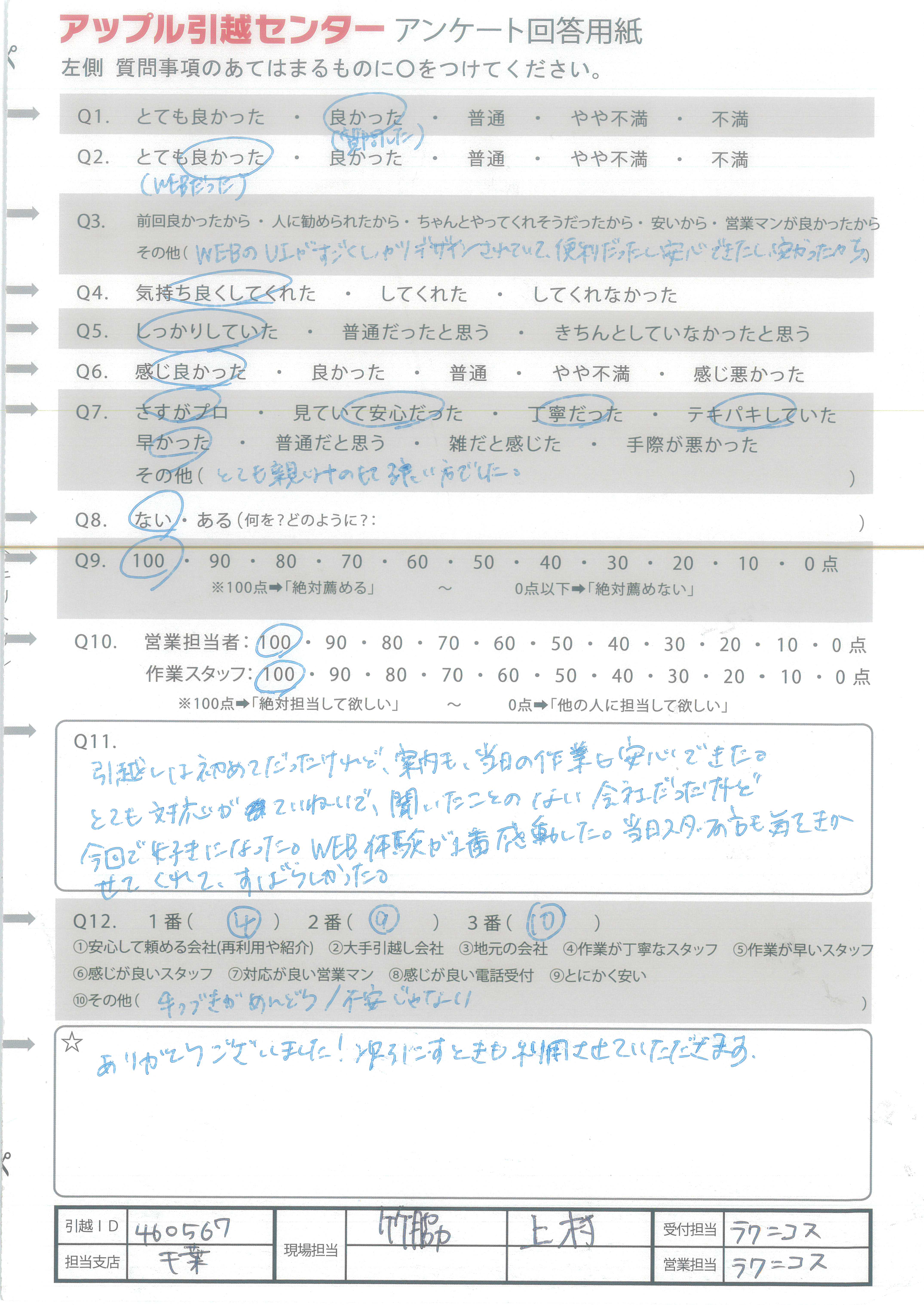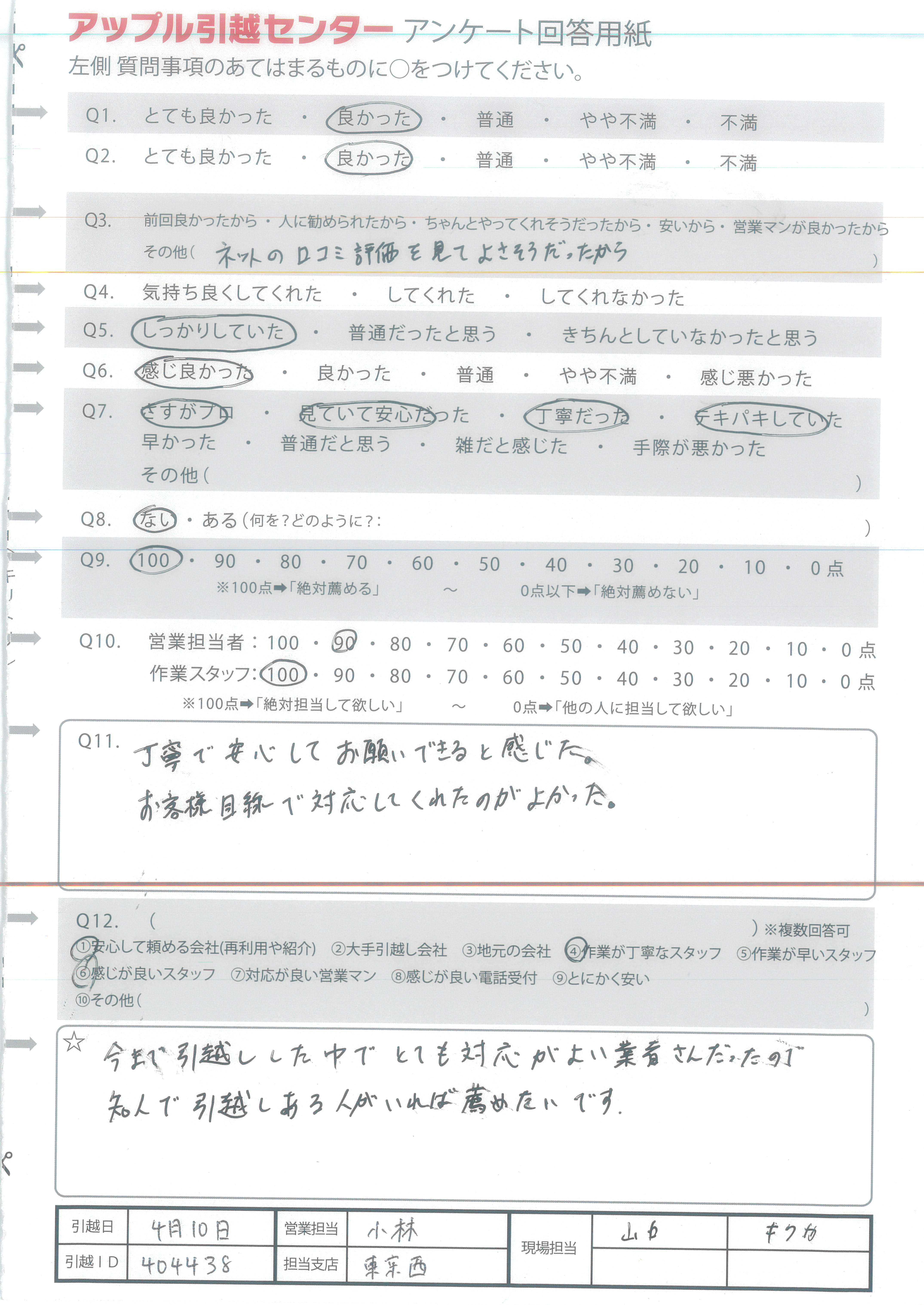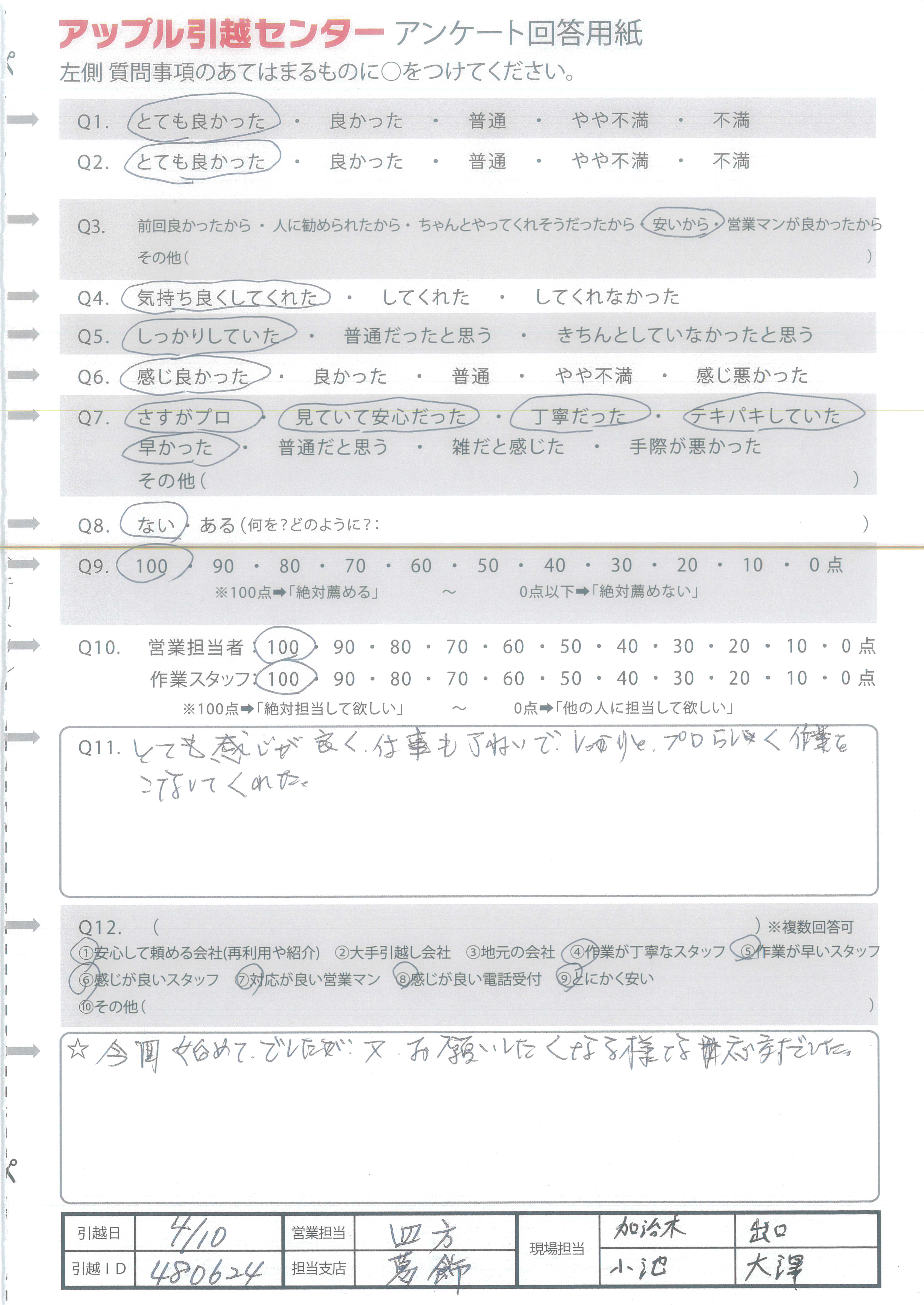 アップル引越センターでは、面映いお褒めの言葉も、胸に突き刺さるお叱りのコメントも、