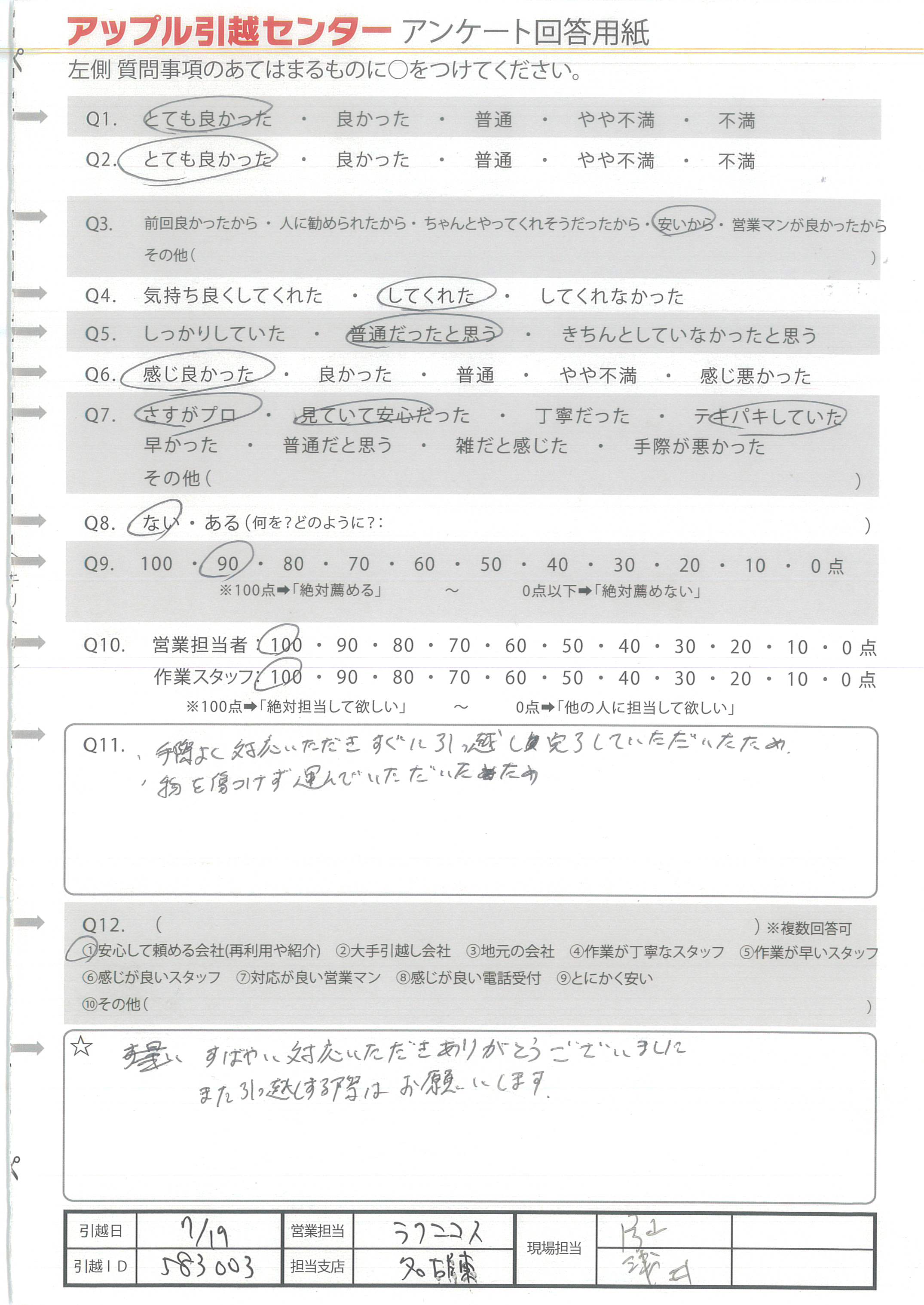 A.手際よく対応いただきすぐに引っ越し完了していただいたため 物を傷つけず運んでいただいたため