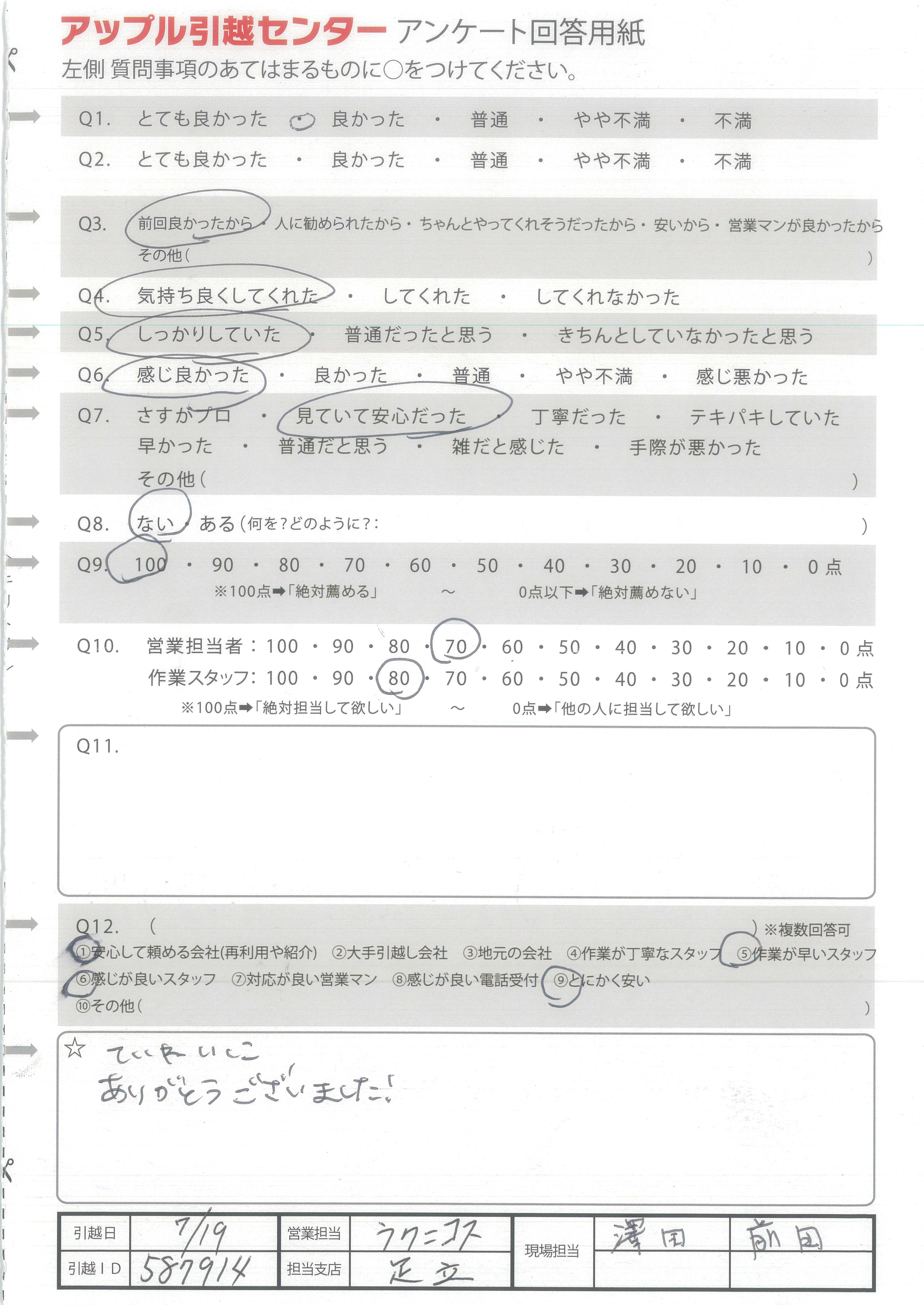 A.すばやい対応いただきありがとうございました また引っ越しする際はお願いします。