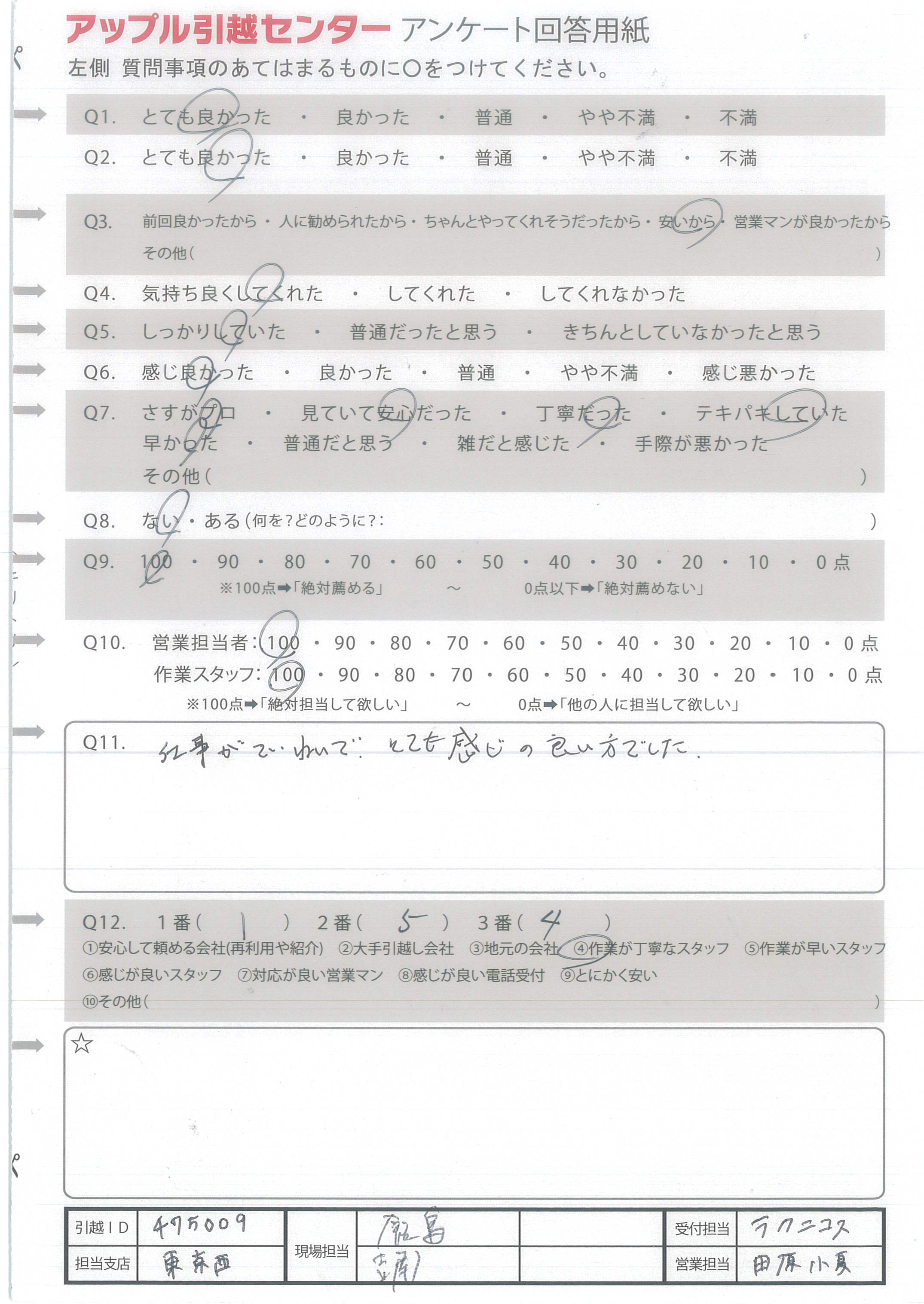 A.工藤さんが本当にしっかりされていて、テキパキ動くし、愛想も良く気持ちのいいコミュニケーションをしてくださいました! アップルさんにご依頼するのは初めてでしたが、今後周りの家族や友人に絶対お勧めします^^