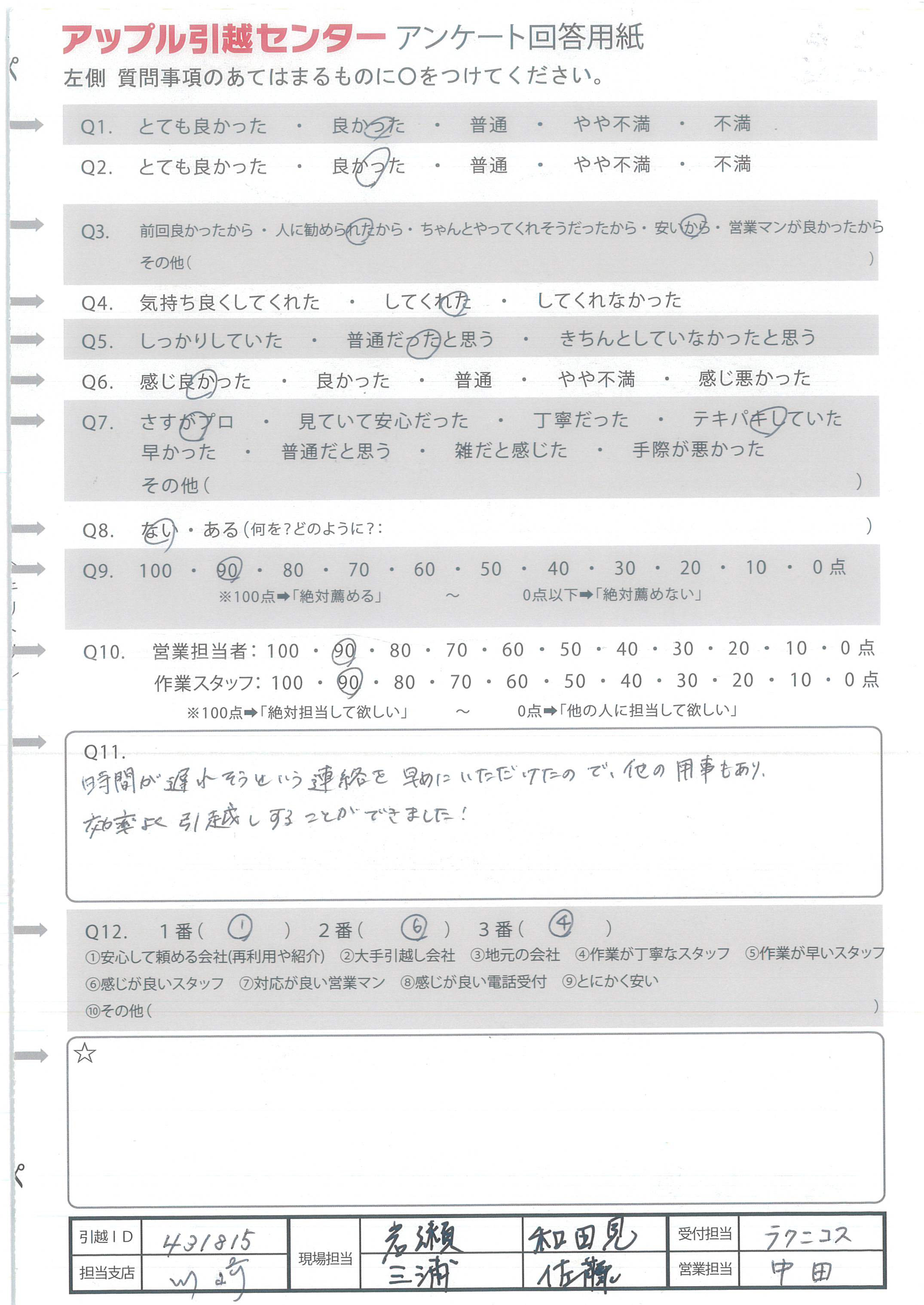 A.何度もメールにてお問い合わせをさせていただいていた時からとても丁寧に対応していただき、本当にありがとうございました。 来てくださったスタッフの方も明るく感じのいい方で、とても安心して引っ越しすることが出来ました。またよろしくお願いします。