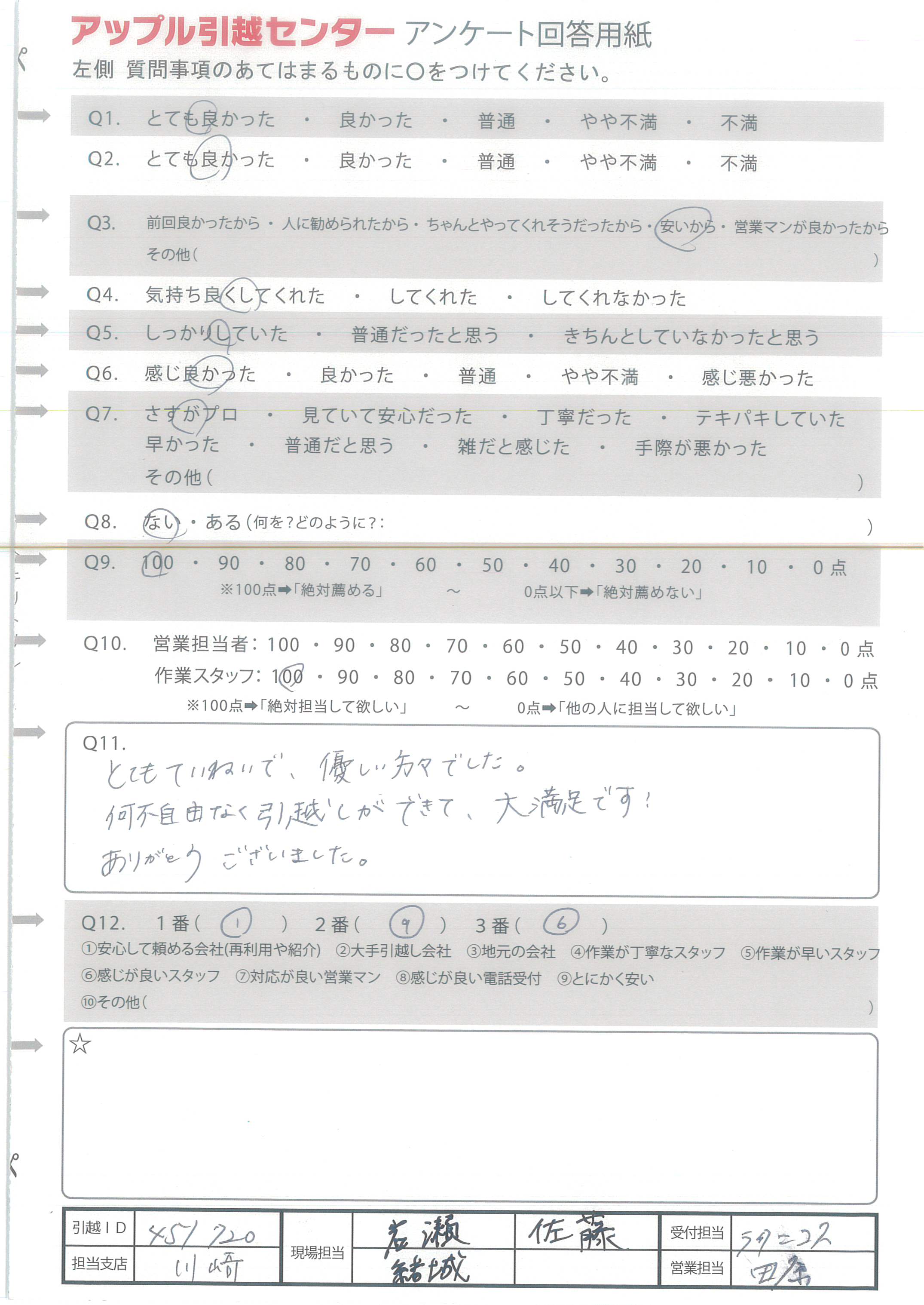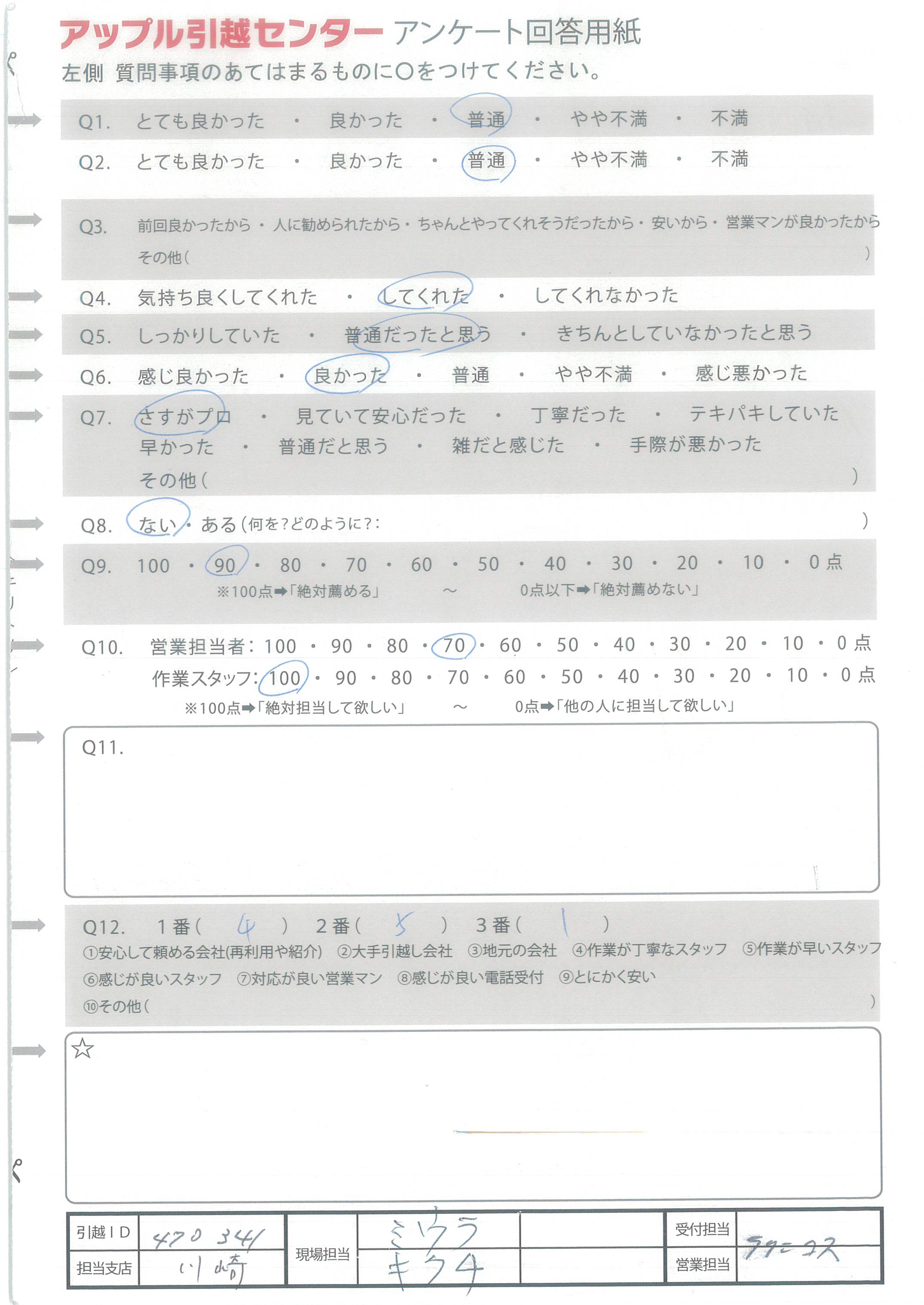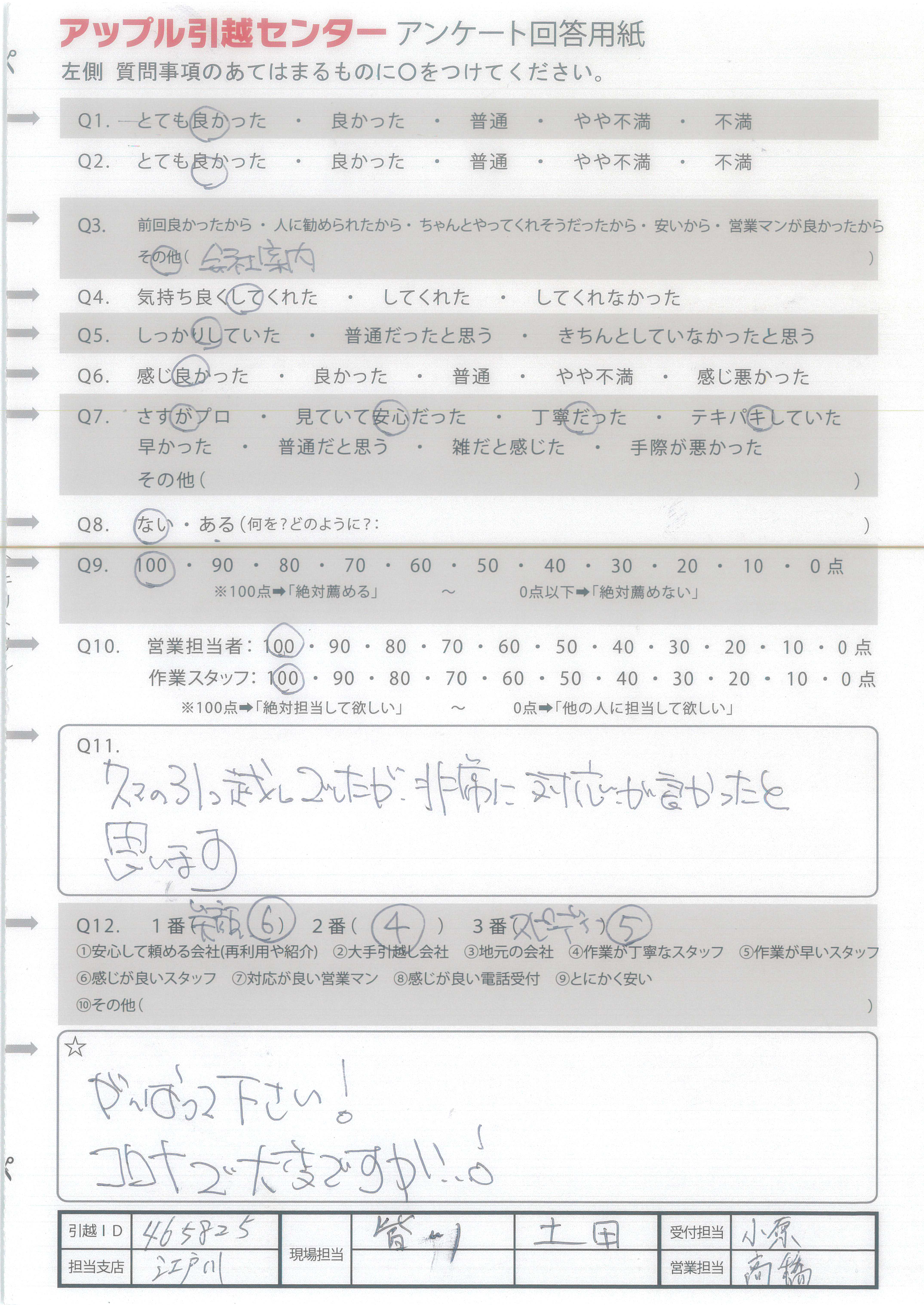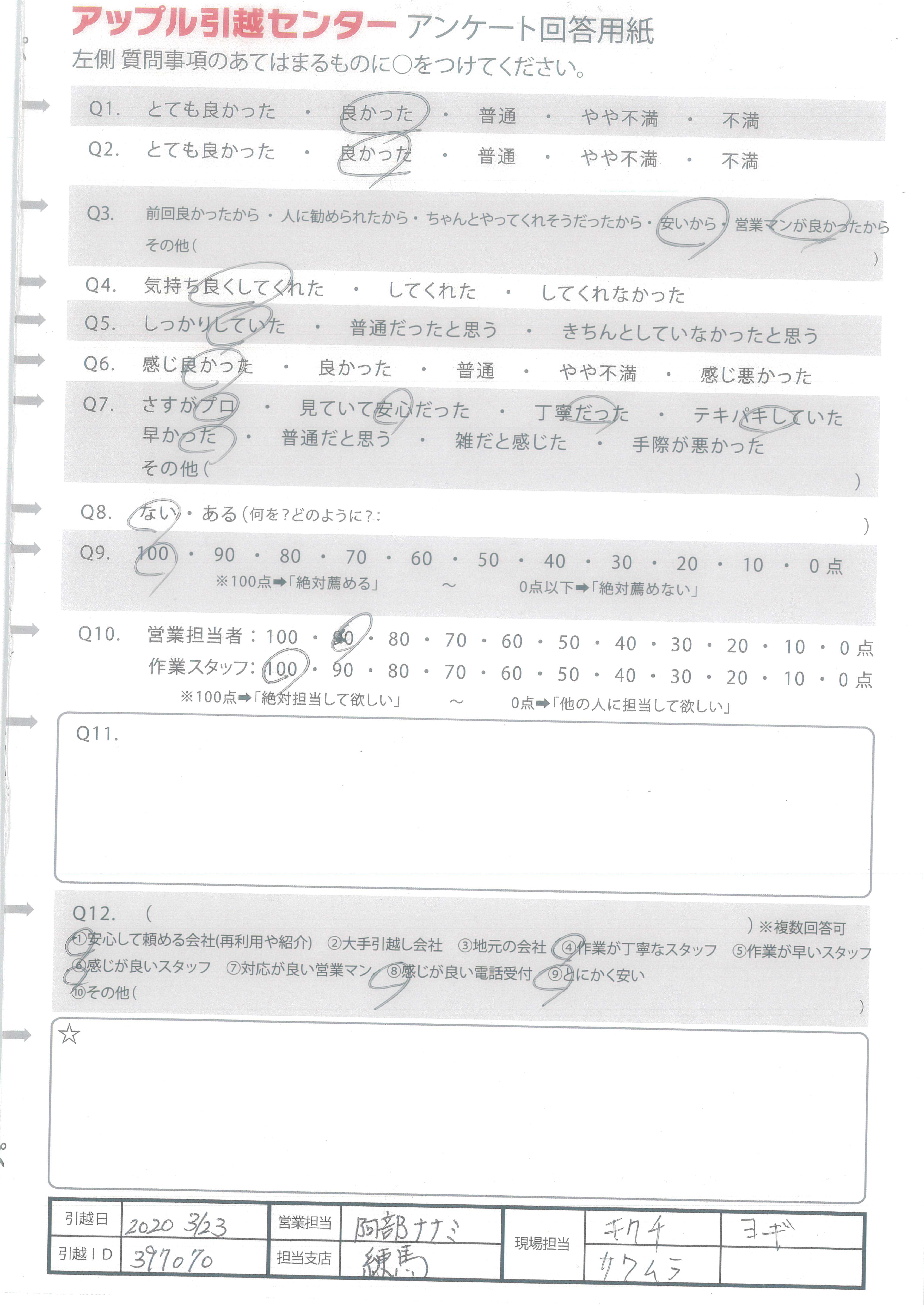A.生出様、前田様、このたびはありがとうございました。 単身にしては物量が多く、住所も地図が間違っていたりと大変ご迷惑をおかけいたしました。しかし、お2方とも感じよくてきぱきと、作業していただき、本当にありがとうございました。テレビの配線をしていただき助かりました。