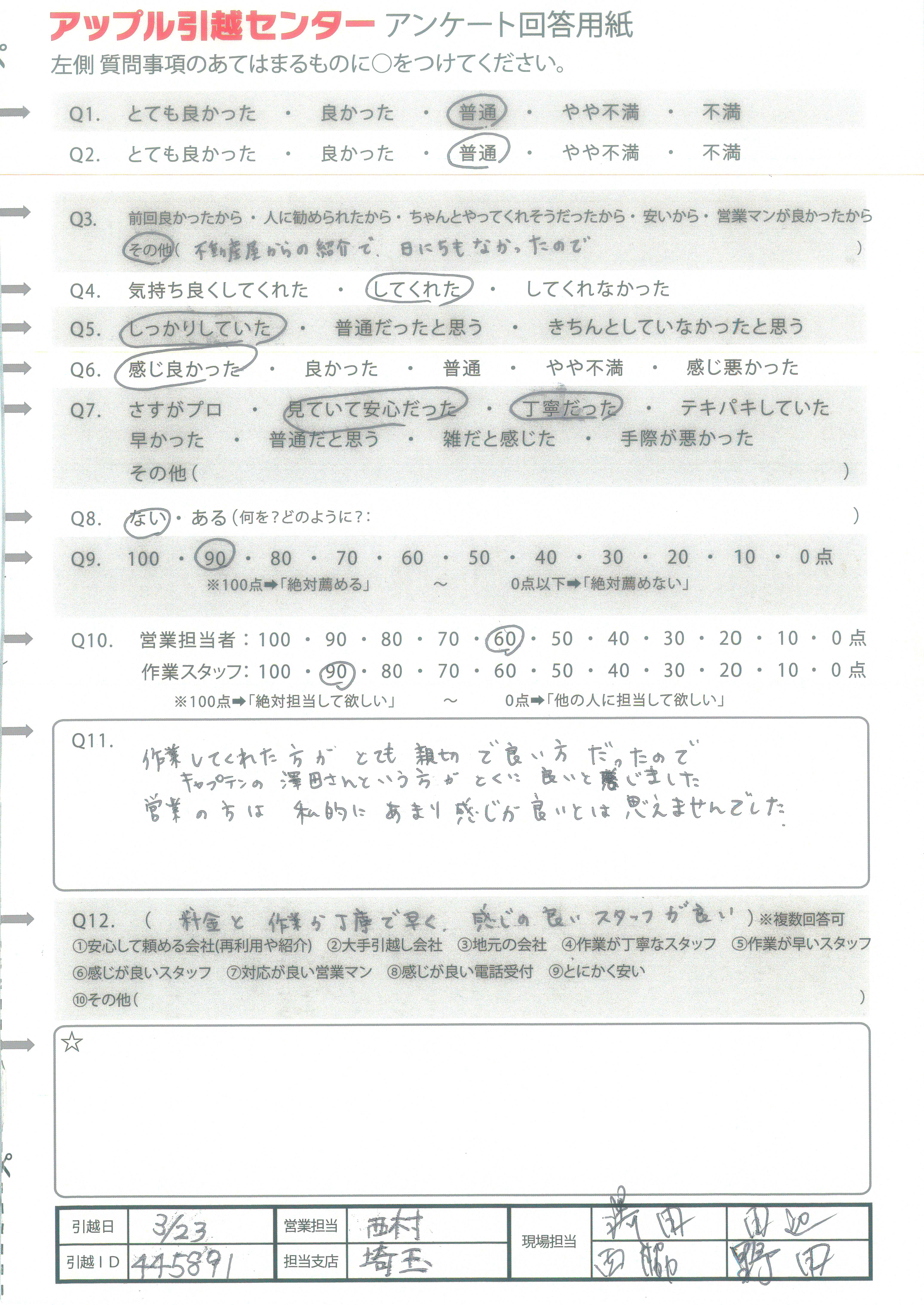 A.作業してくれた方がとても親切で良い方だったのでキャプテンの澤田さんという方が特に良いと感じました。営業の方は私的にあまり感じが良いとは思えませんでした。