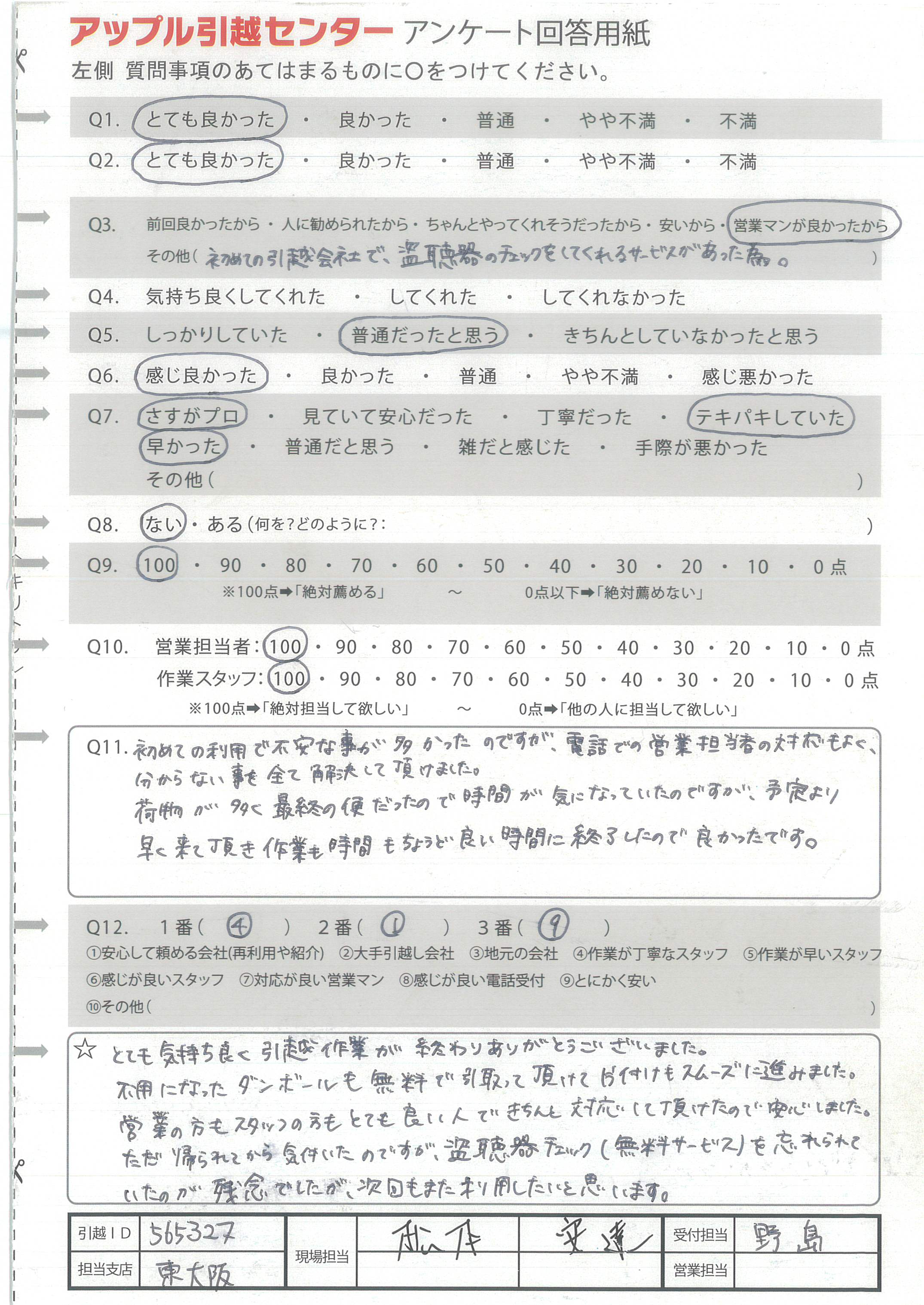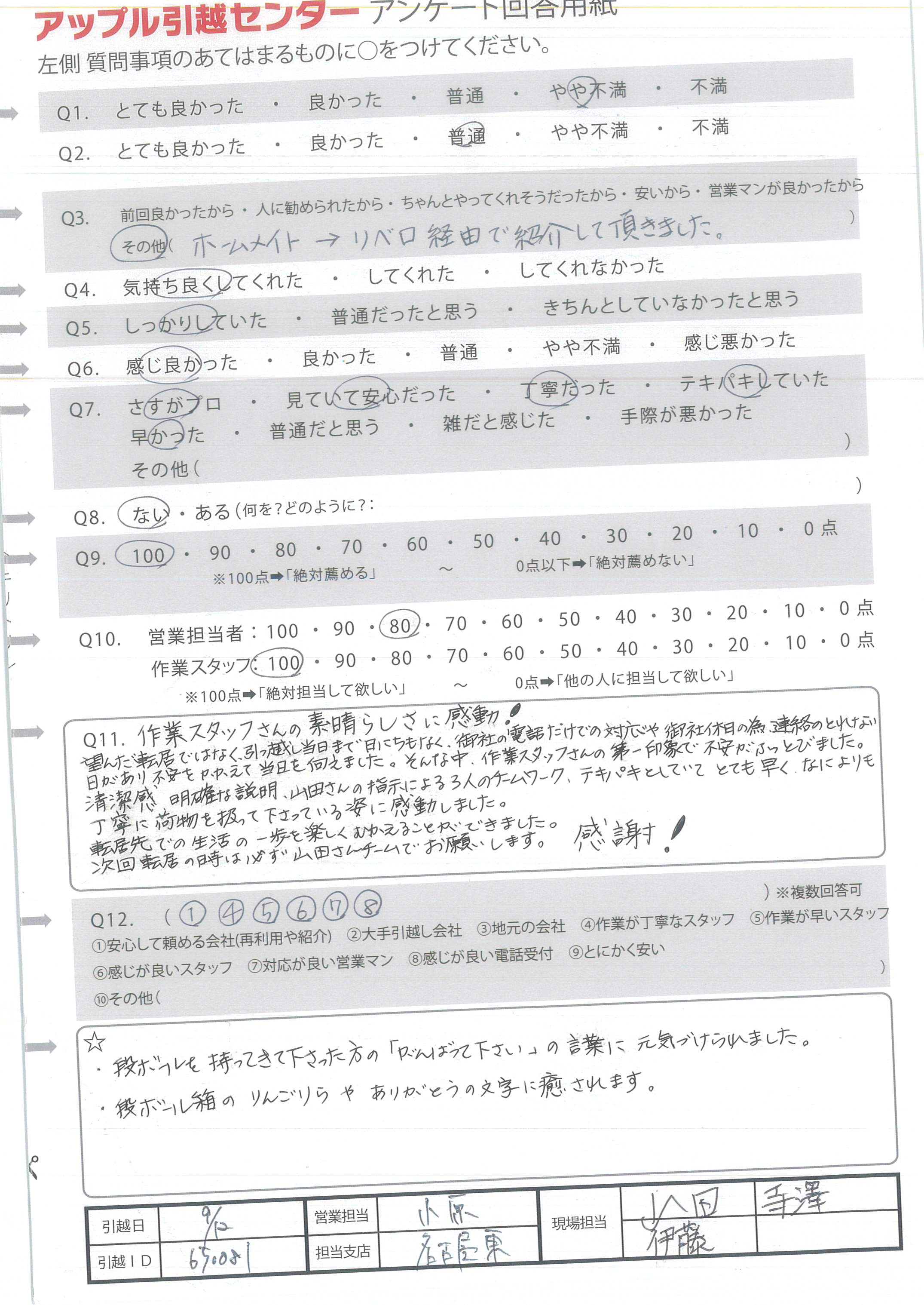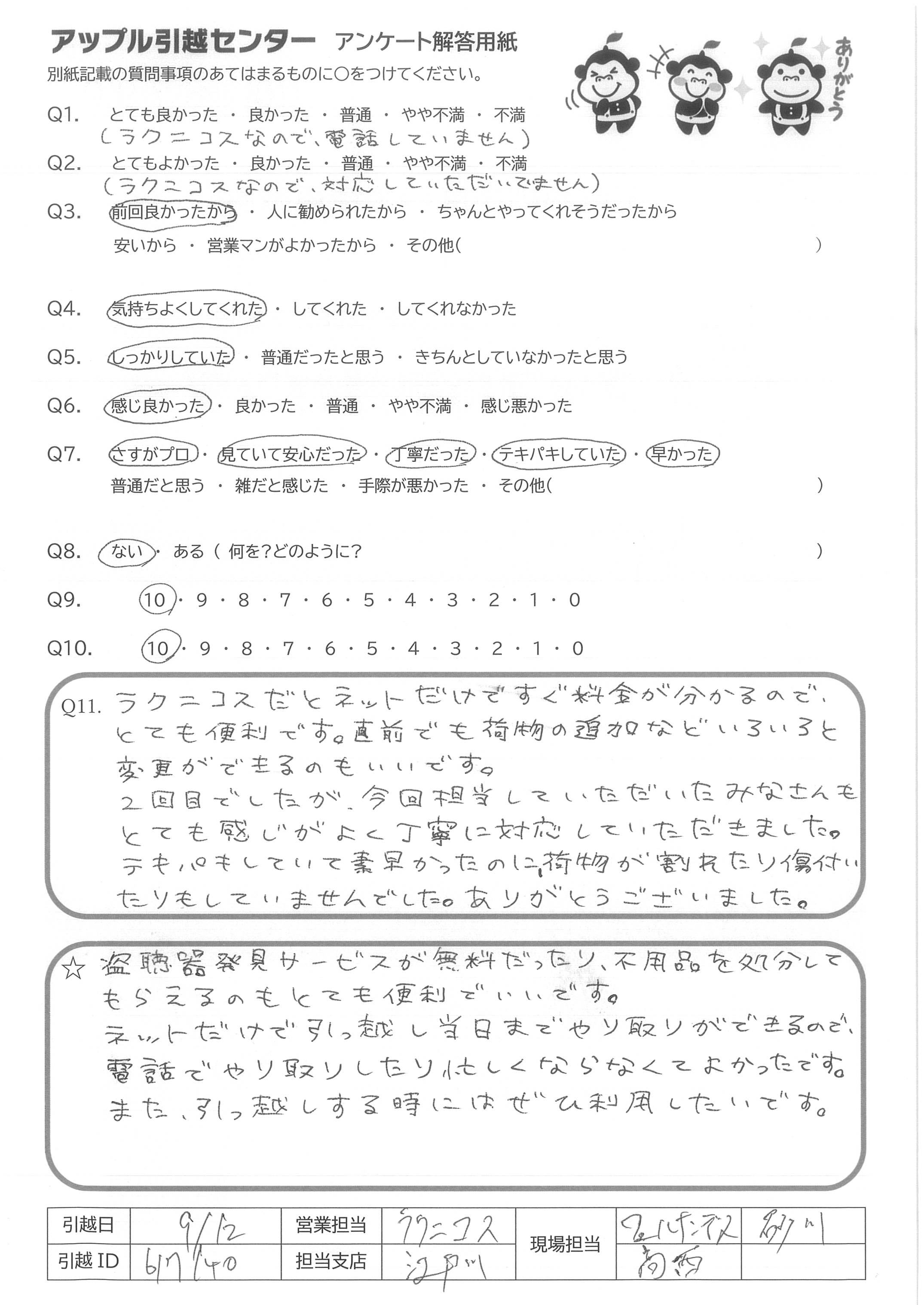 A.とても気持ちよく引越作業が終わりありがとうございました。 不用になったダンボールも無料で引取って頂けて片付けもスムーズに進みました。 営業の方もスタッフの方もとても良い人できちんと対応して頂けたので安心しました。 ただ帰られてから気付いたのですが、盗聴器チェック(無料サービス)を忘れられていたのが残念でしたが、次回もまた利用したいと思います。