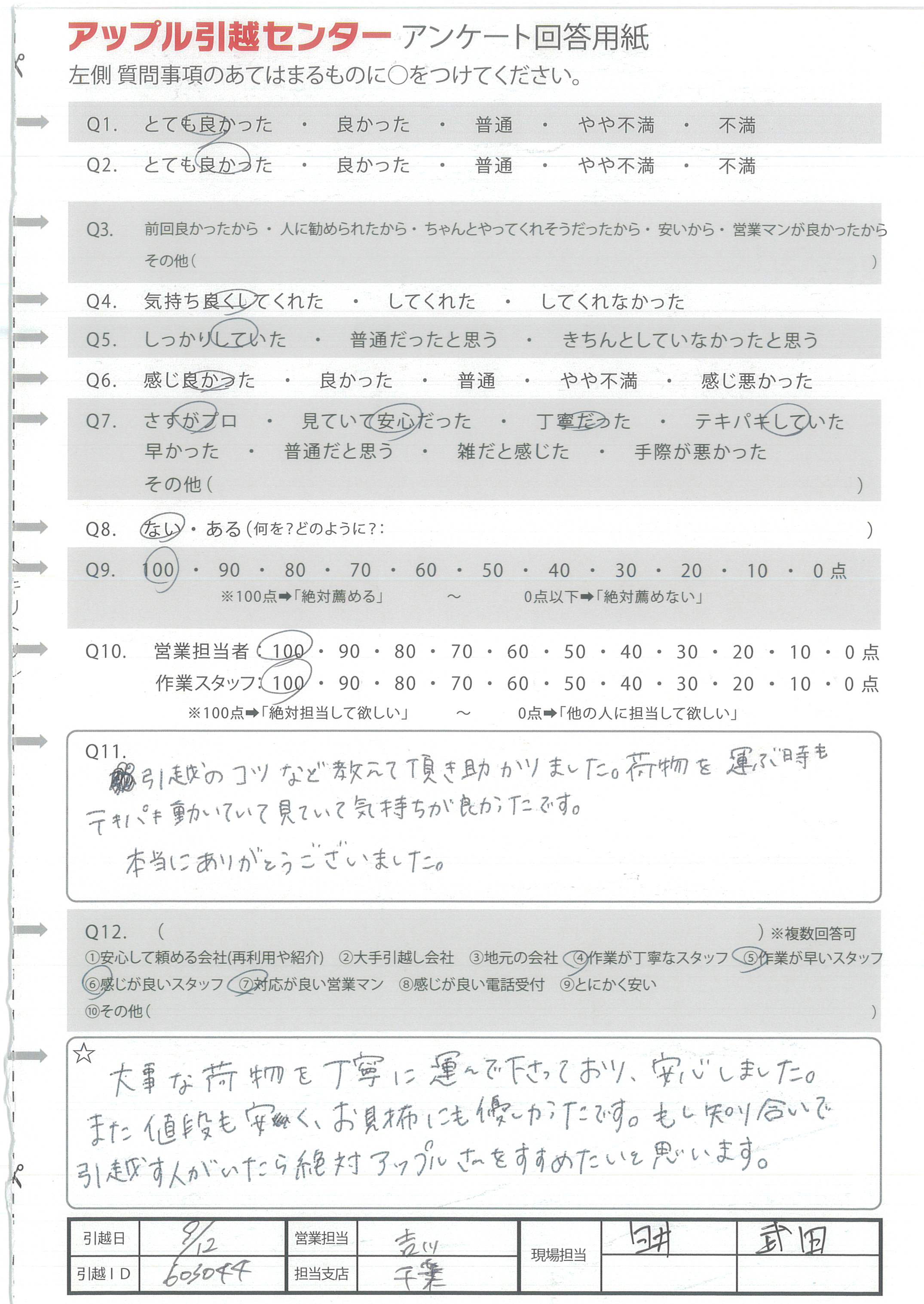 A.来月90歳になる父の引っ越しをお願いしました。独り暮しでそれほど荷物は多くありませんでしたが、荷造り準備の不手際等が多くて、スムーズに作業が進みませんでした。 しかし担当して頂いた方達はとても親切で、また暑い中ずっと笑顔で対応してくださり、大変だった引っ越しの作業も少し楽しかったぐらいです。 本当にありがとうございました。