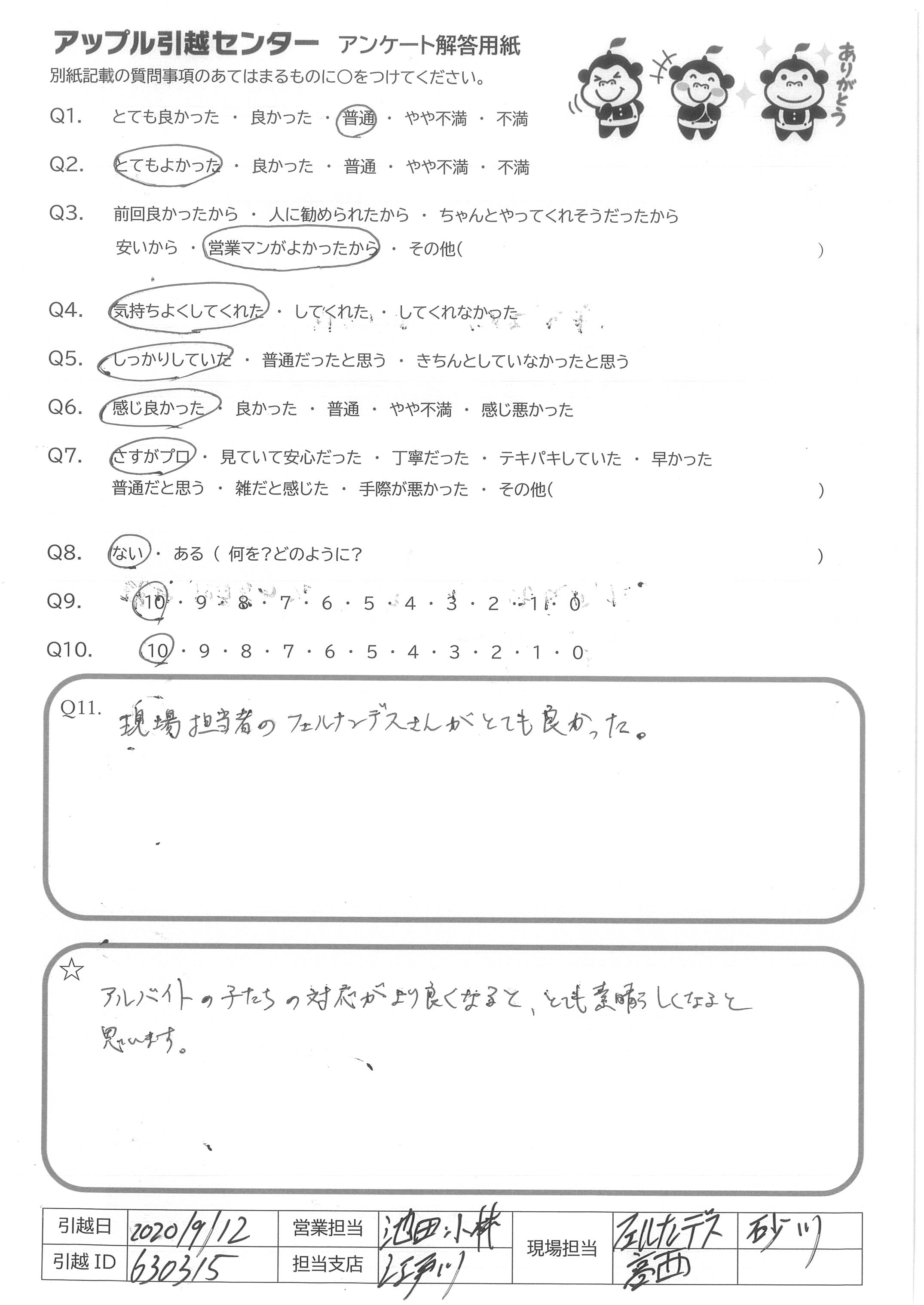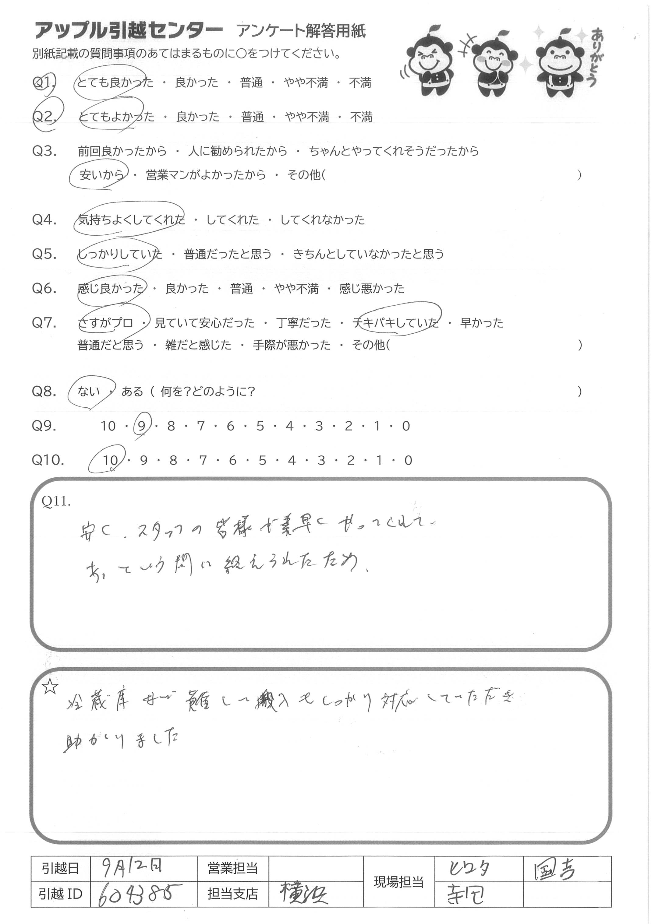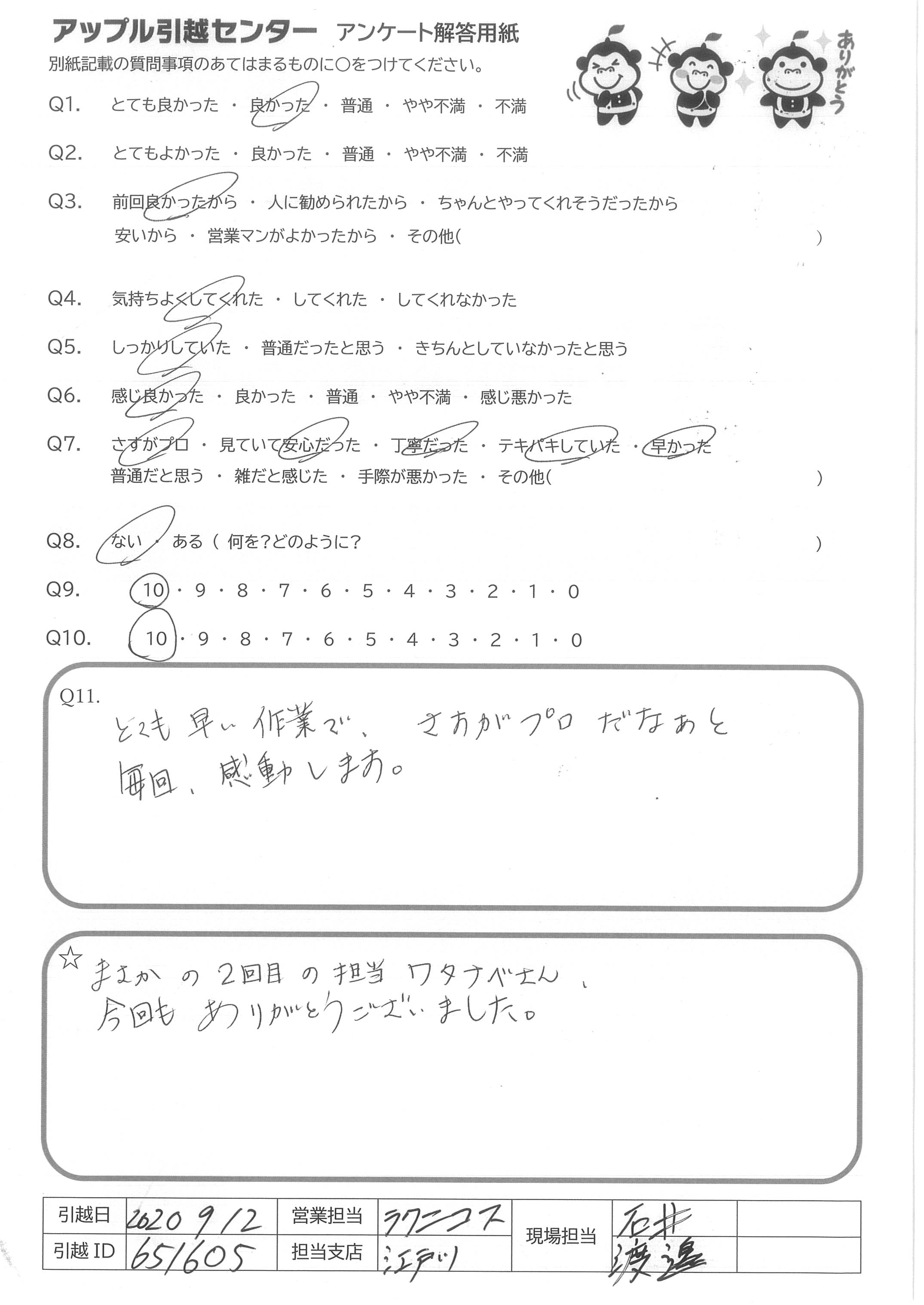 A.引越のコツなど教えて頂き助かりました。荷物を運ぶ時もテキパキ動いていて見ていて気持ちが良かったです。本当にありがとうございました。