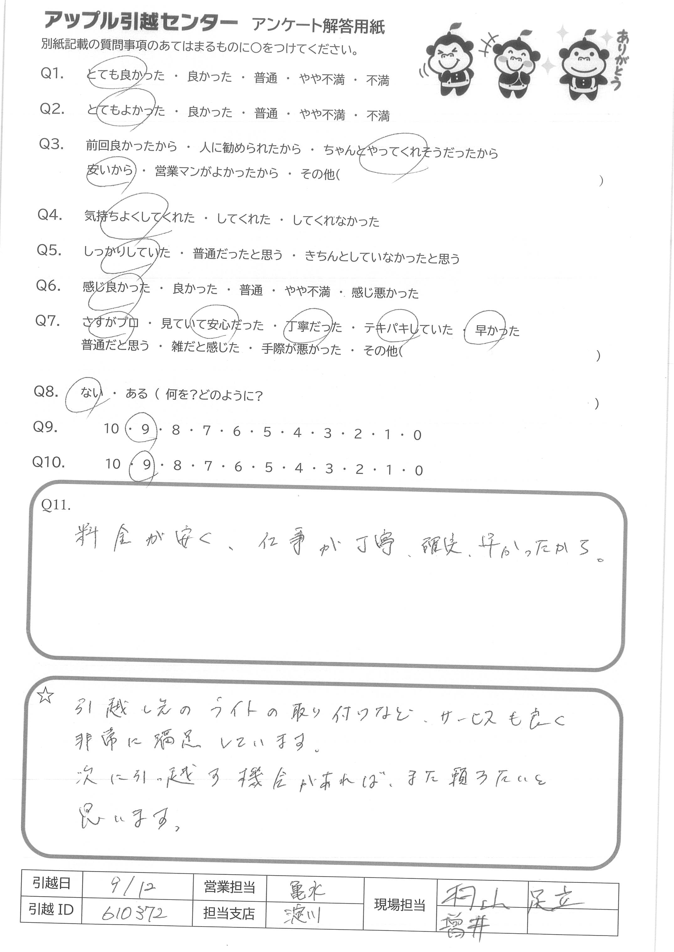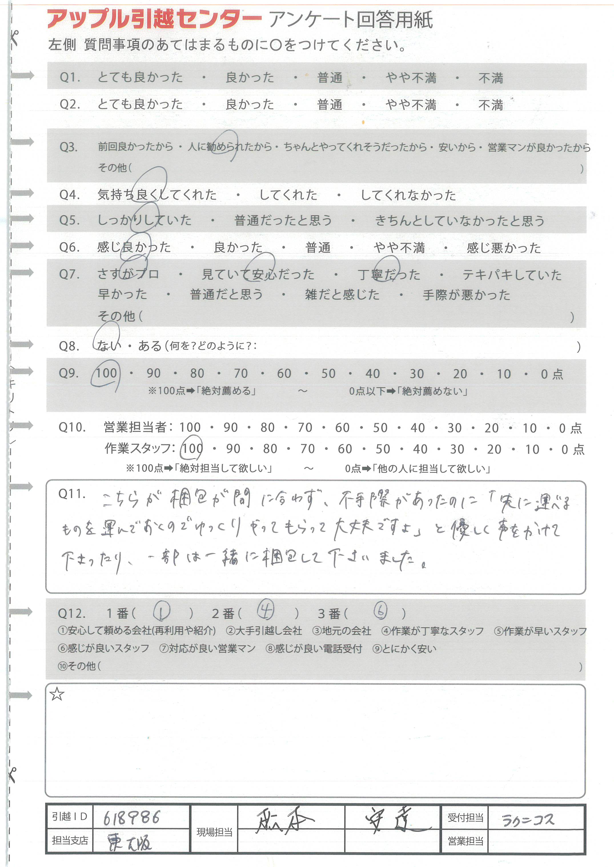 A.大事な荷物も丁寧に運んで下さっており、安心しました。また値段も安くお財布にも優しかったです。もし知り合いで引越す人がいたら絶対アップルさんをすすめたいと思います。