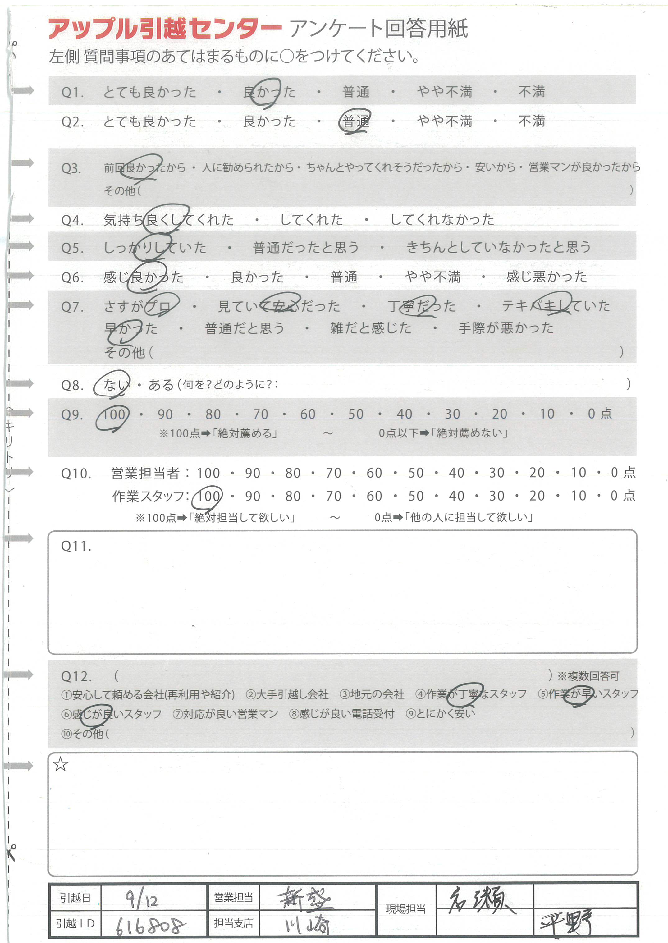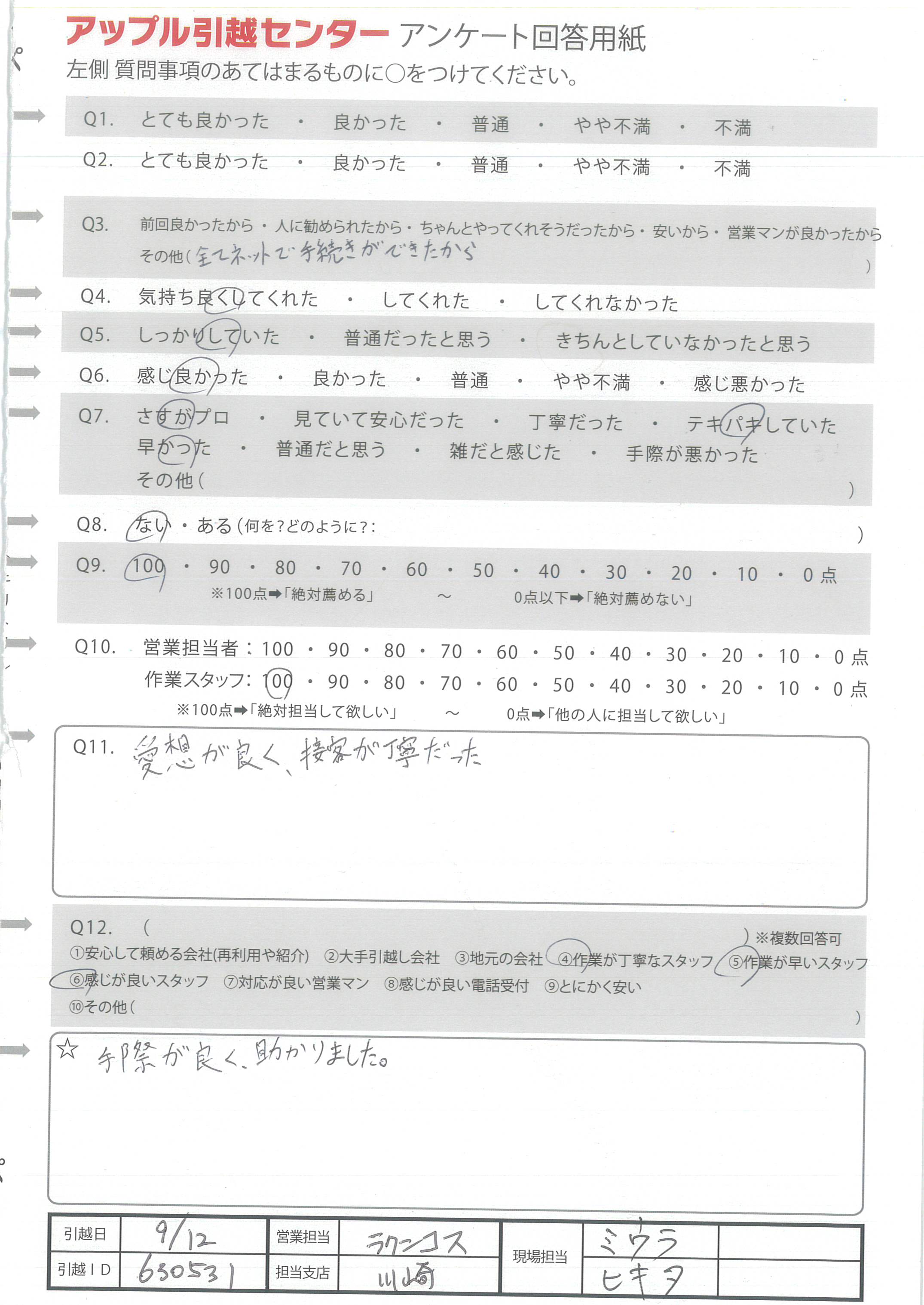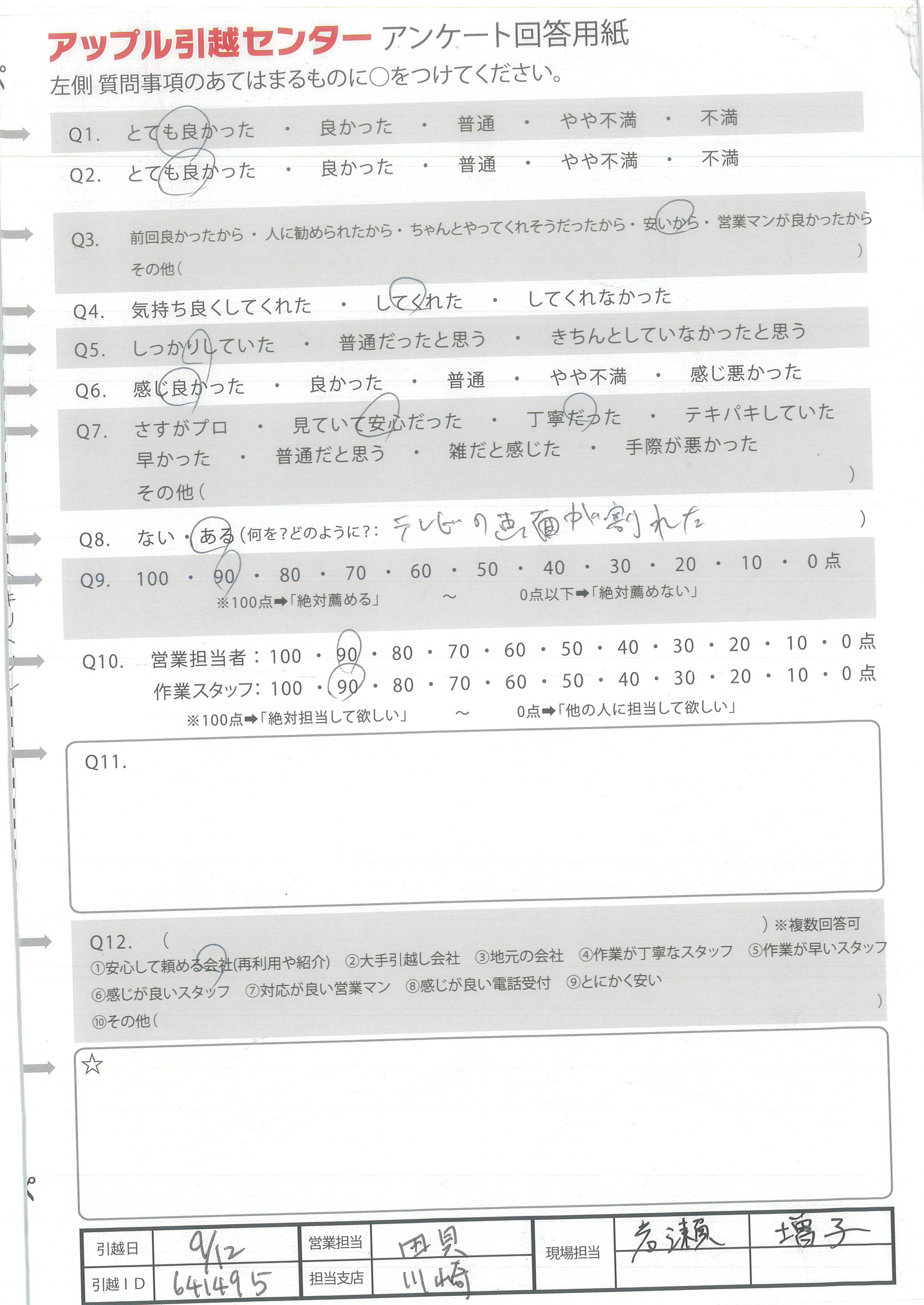 引越し日:2020年09月12日 エリア:神奈川県横浜市港北区