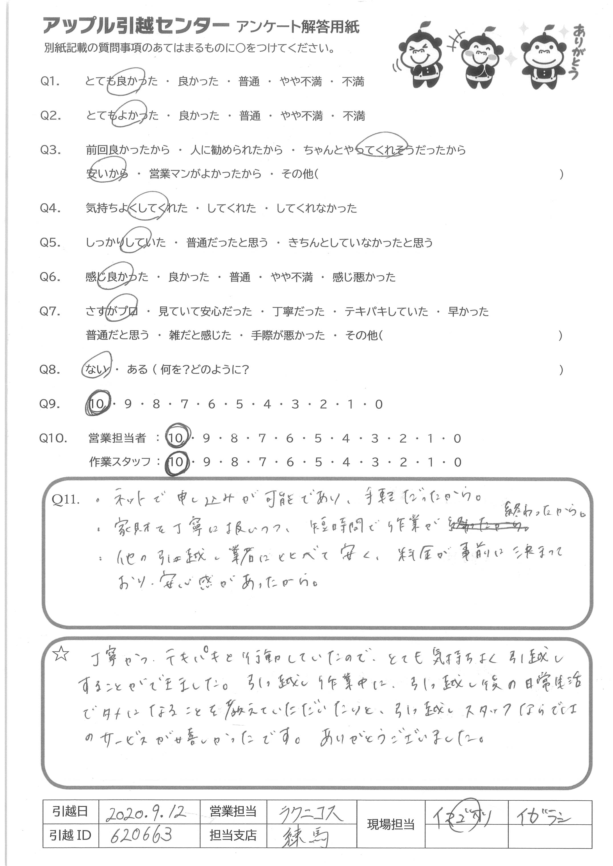 A.・ネットで申し込みが可能であり、手軽だったから。 ・家財を丁寧に扱いつつ、短時間で作業が終わったから。 ・他の引っ越し業者に比べて安く、料金が事前に決まっており、安心感があったから。
