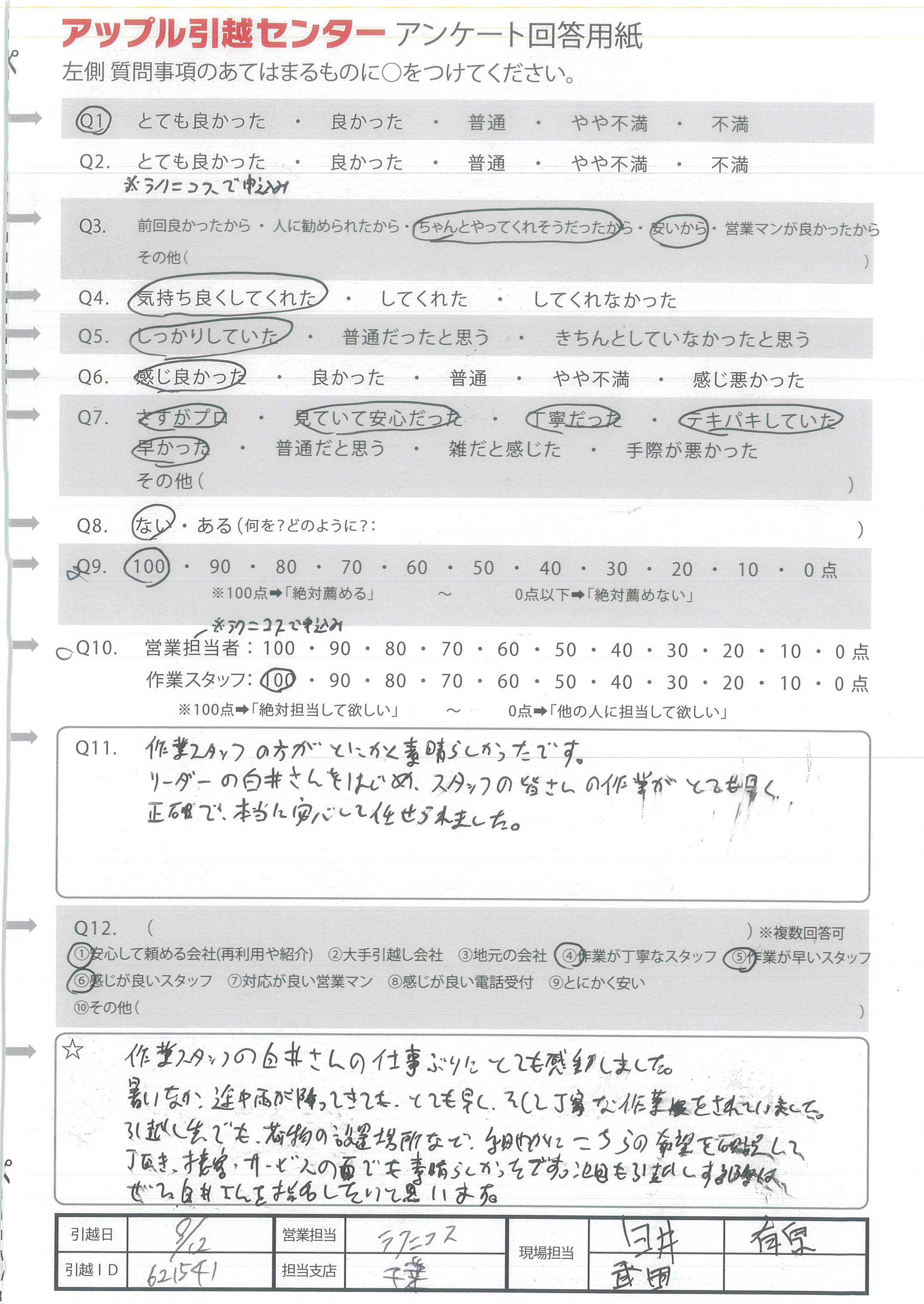 A.作業スタッフの白井さんの仕事ぶりにとても感動しました。暑いなか、途中雨が降ってきても、とても早く、そして丁寧な作業をされていました。引越し先でも、荷物の設置場所など、細やかにこちらの希望を確認して頂き、接客・サービスの面でも素晴らしかったです。次回も引越しする時はぜひ白井さんとお話したいと思います。