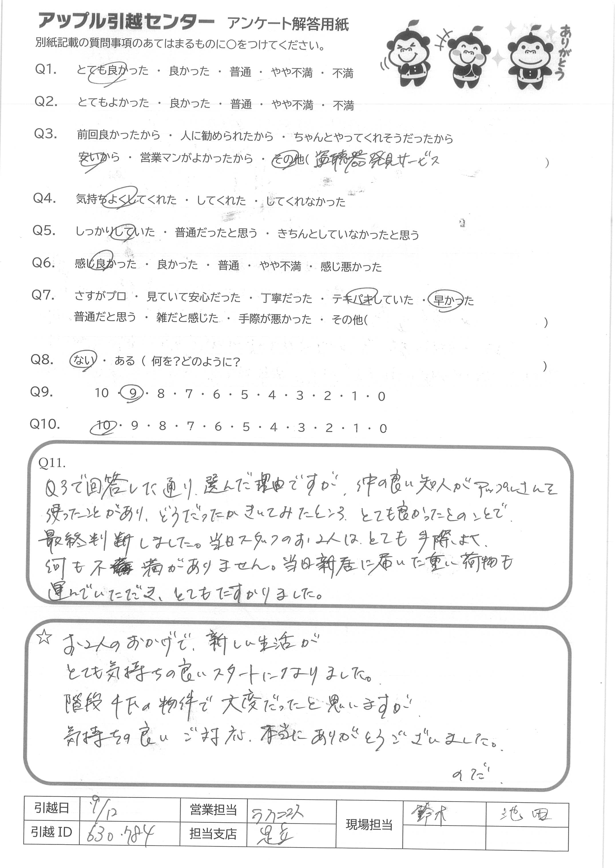 A.Q3で回答した通り、選んだ理由ですが、仲の良い知人がアップルさんを使ったことがあり、どうだったかきいてみたところ、とても良かったとのことで最終判断しました。当日スタッフのお2人はとても手際よく、何も不満がありません。当日新居に届いた重い荷物も運んでいただき、とてもたすかりました。