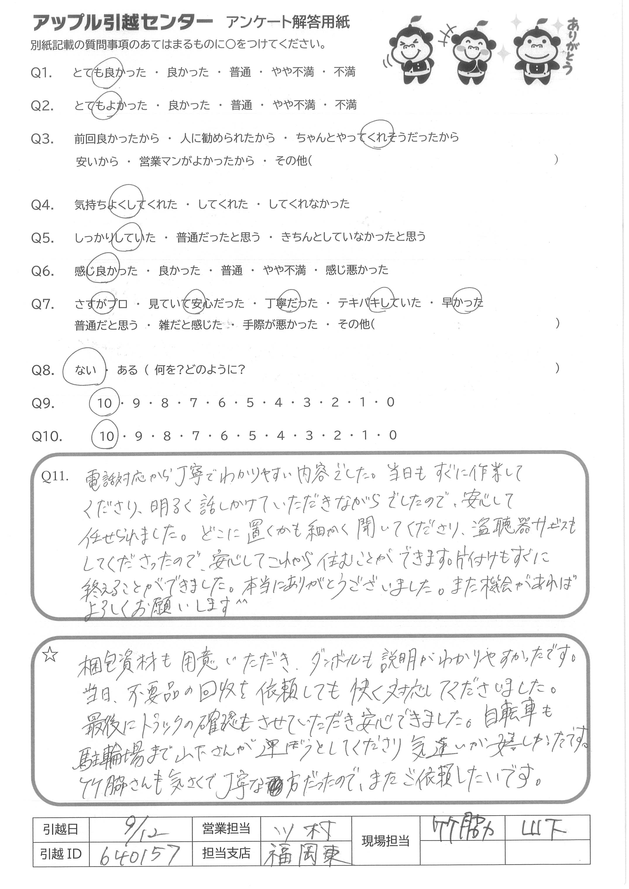 A.梱包資材も用意いただき、ダンボールも説明がわかりやすかったです。当日、不要品の回収を依頼しても快く対応してくださいました。最後にトラックの確認をさせていてだき安心できました。自転車も駐輪場まで山下さんが運ぼうとしてくださり気遣いが嬉しかったです。竹脇さんも気さくで丁寧な方だったので、またご依頼したいです。