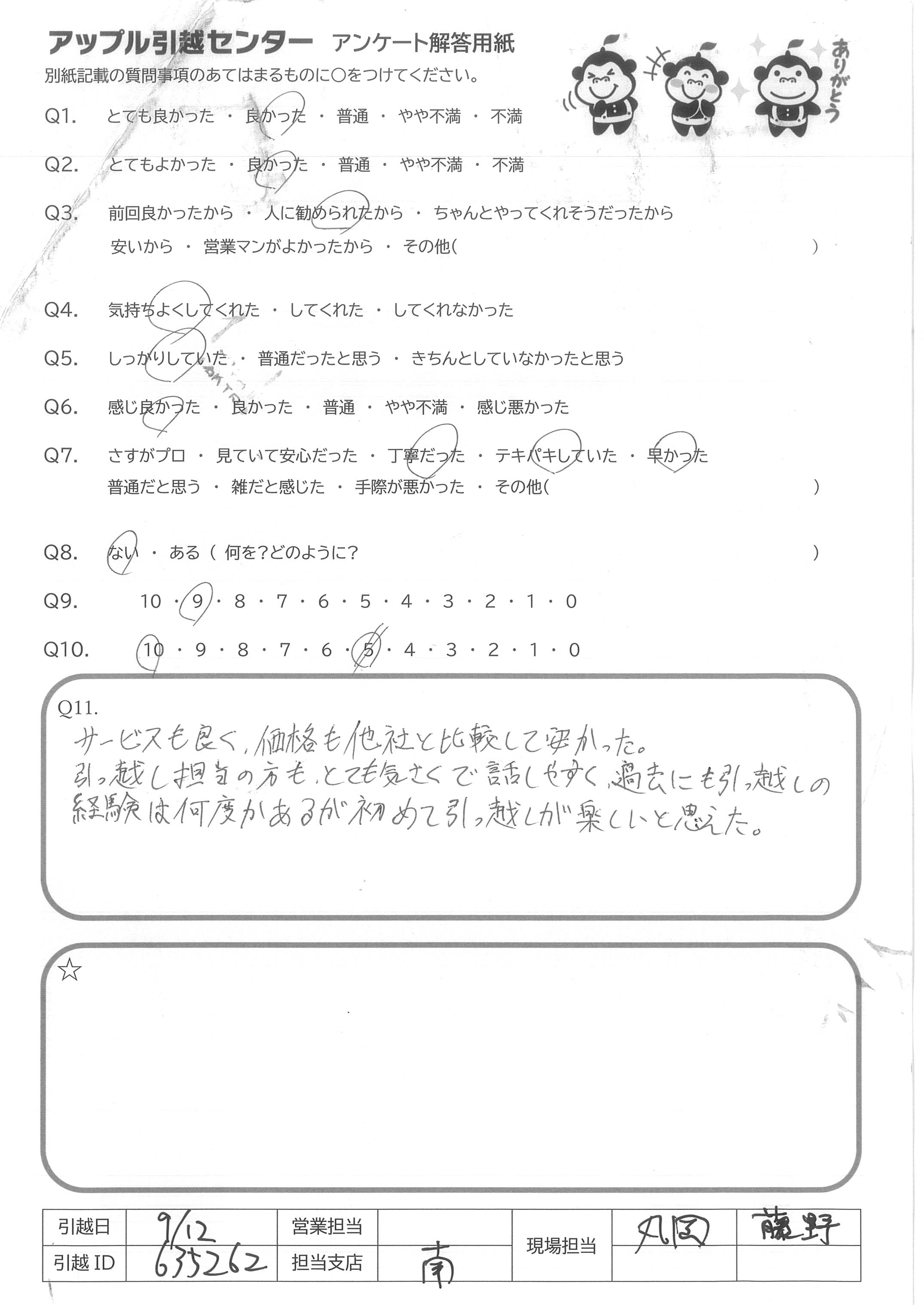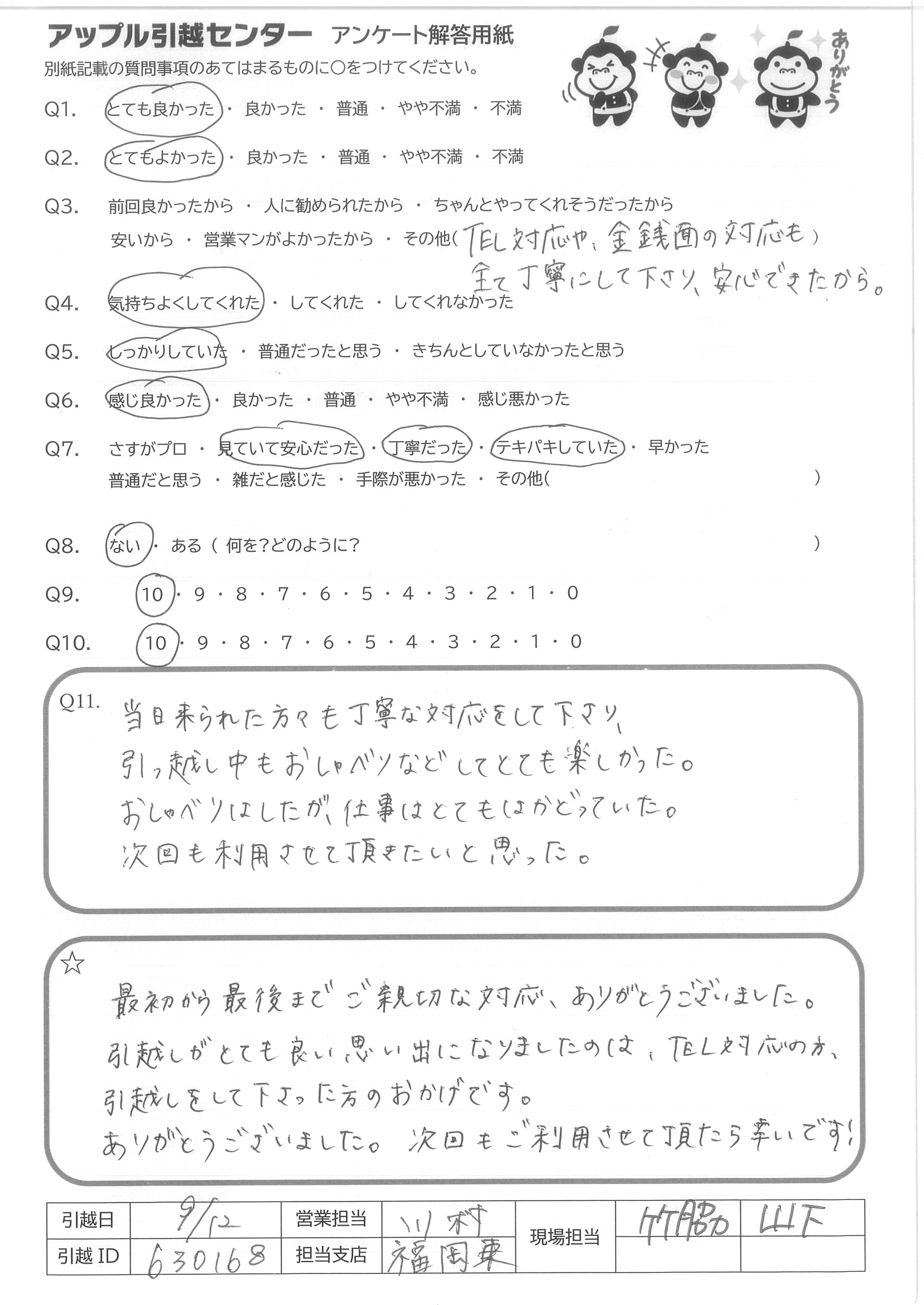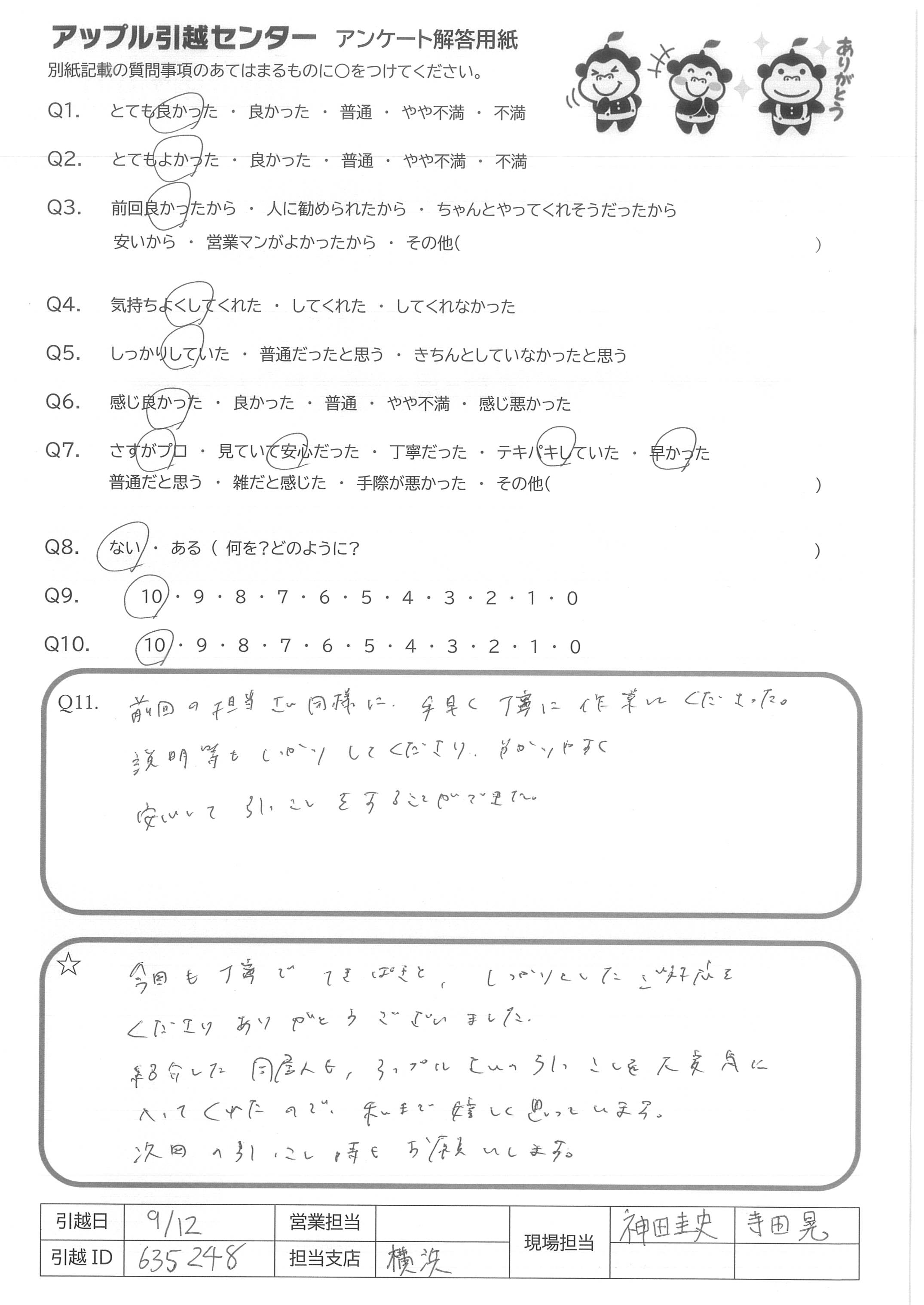 A.今回も丁寧でてきぱきと、しっかりとしてご対応をくださりありがとうございました。 紹介した同居人も、アップルさんの引っこしを大変気に入ってくれたので、私まで嬉しく思っています。 次回の引っこし時もお願いします。