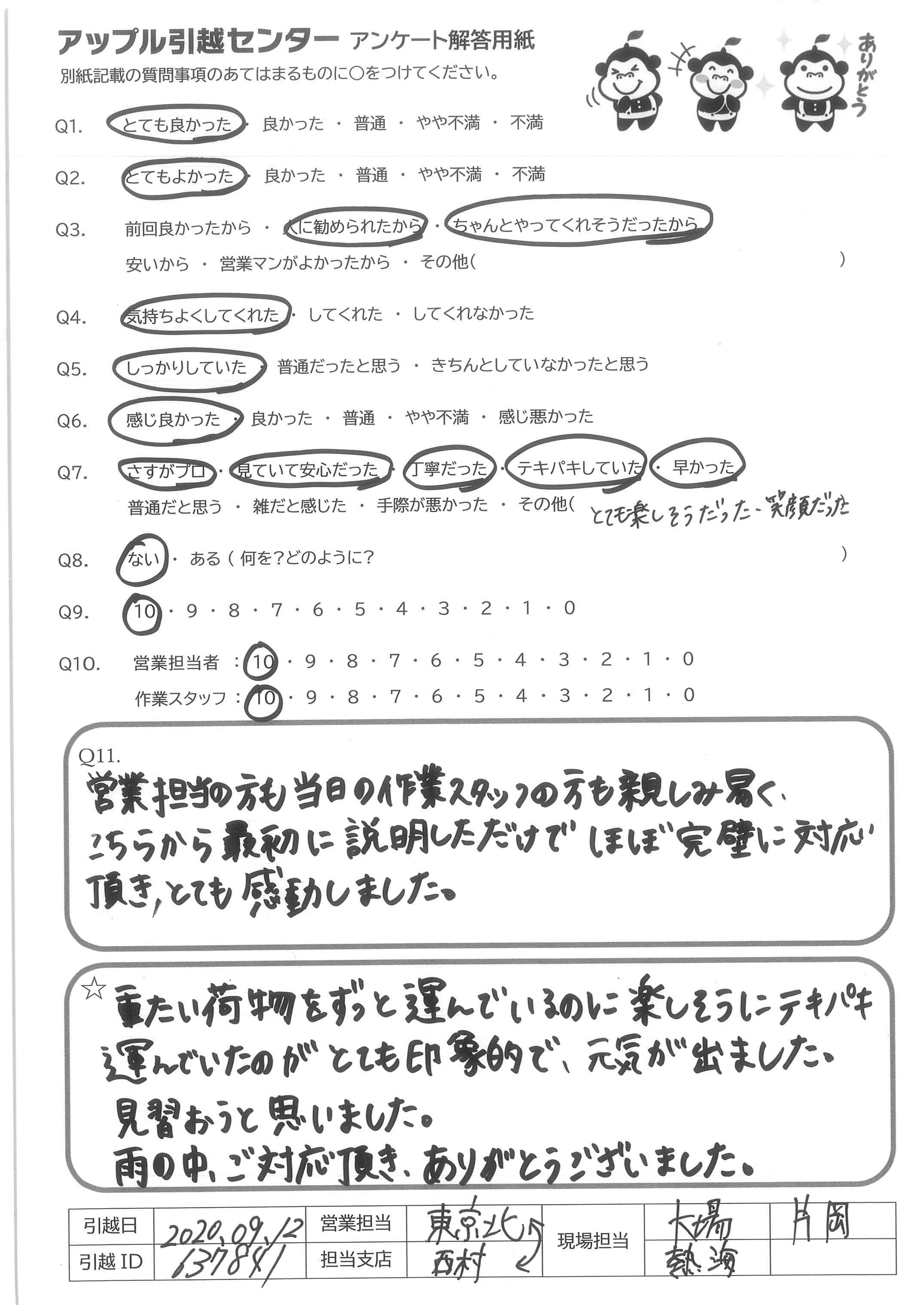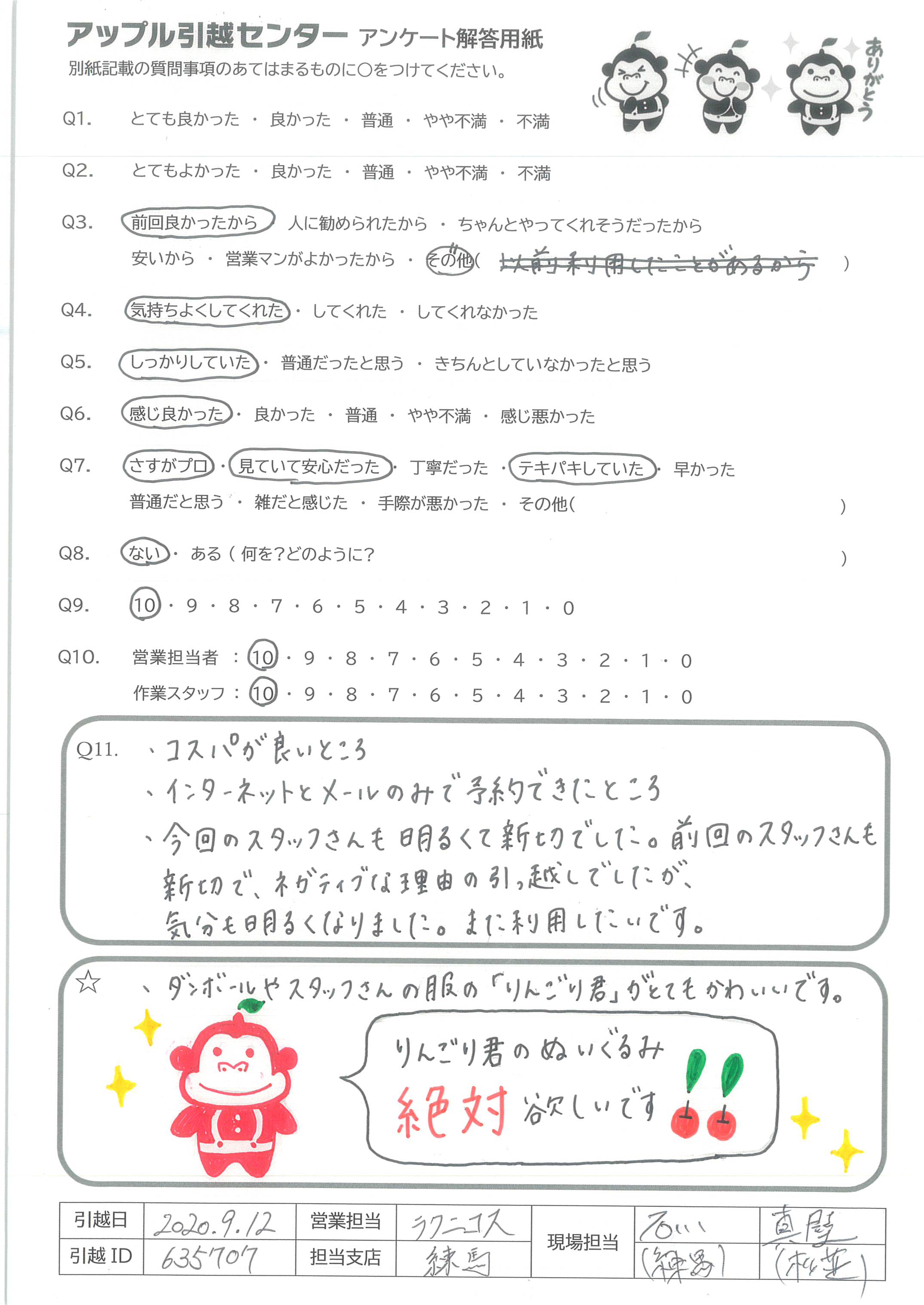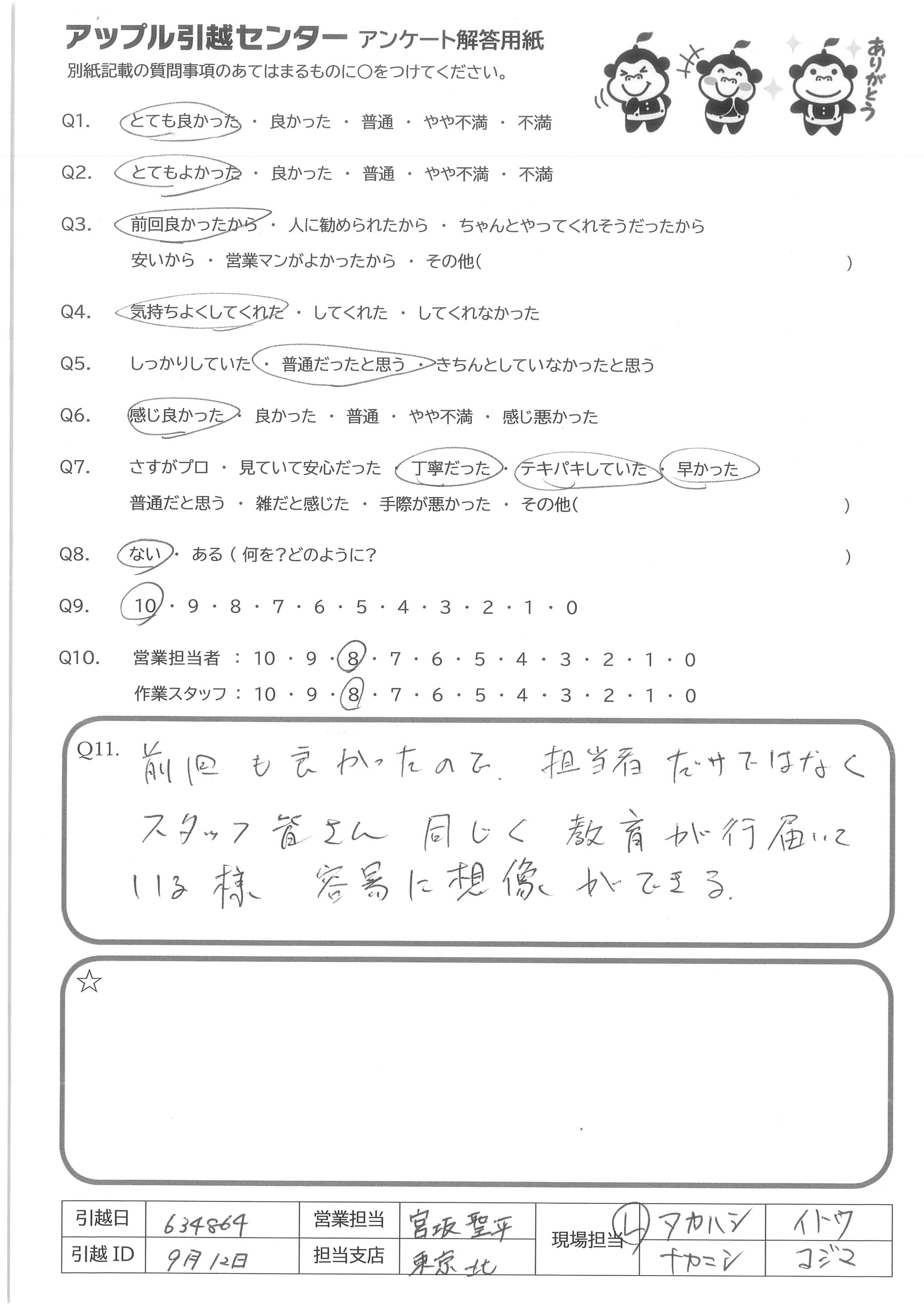 A.今回も丁寧でてきぱきと、しっかりとしてご対応をくださりありがとうございました。 紹介した同居人も、アップルさんの引っこしを大変気に入ってくれたので、私まで嬉しく思っています。 次回の引っこし時もお願いします。