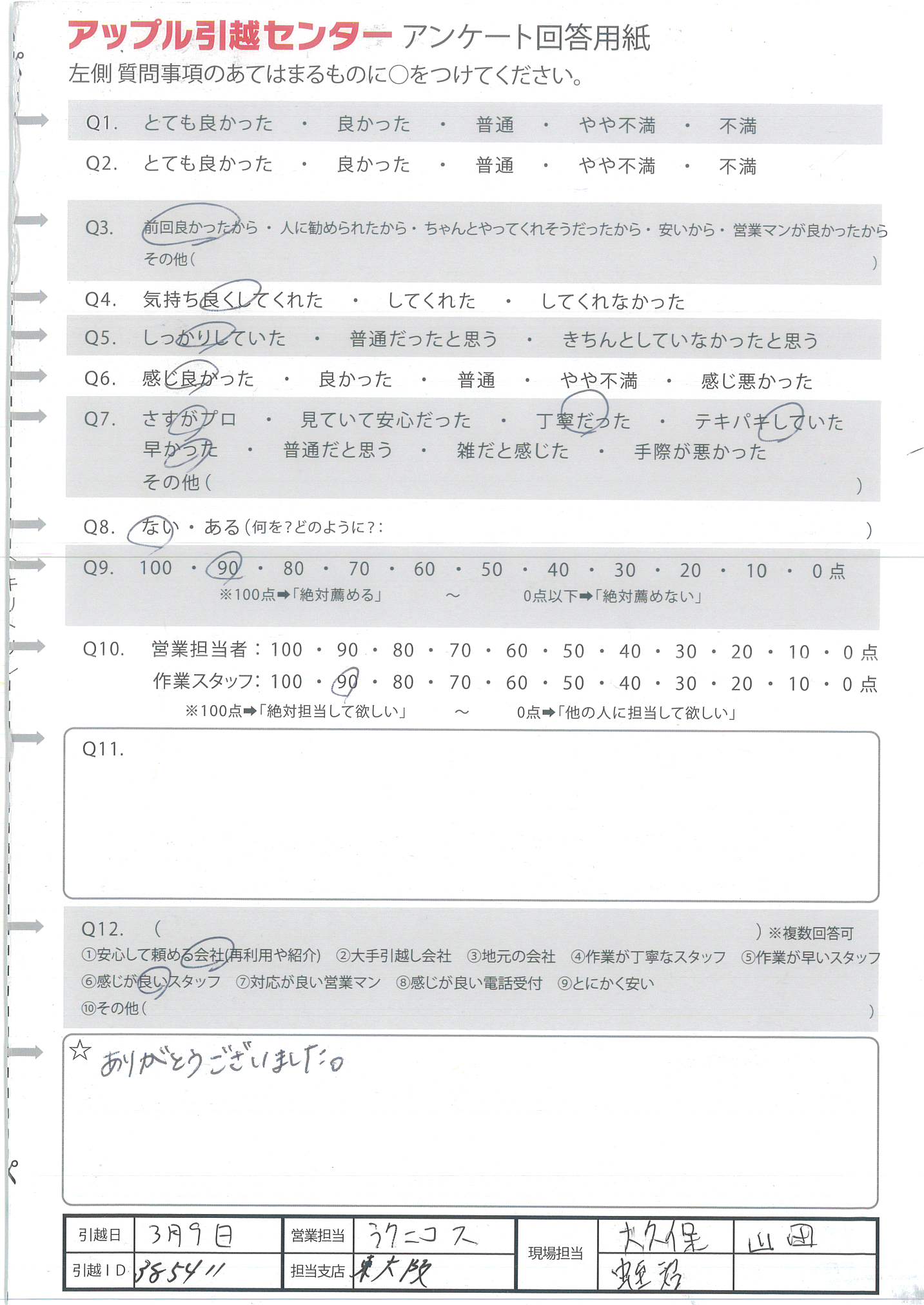 引越し日:2020年03月09日 エリア:神奈川県横浜市港北区