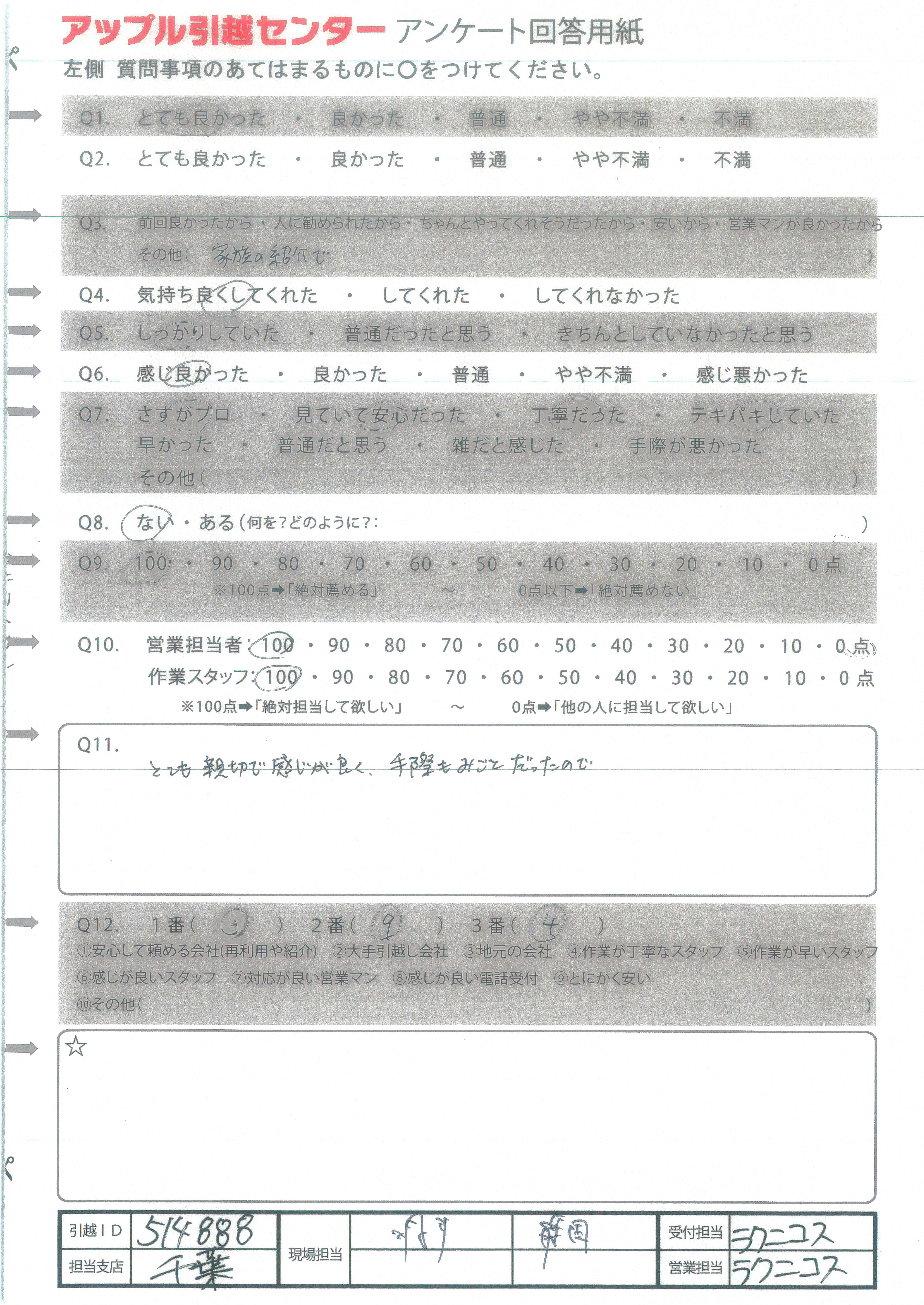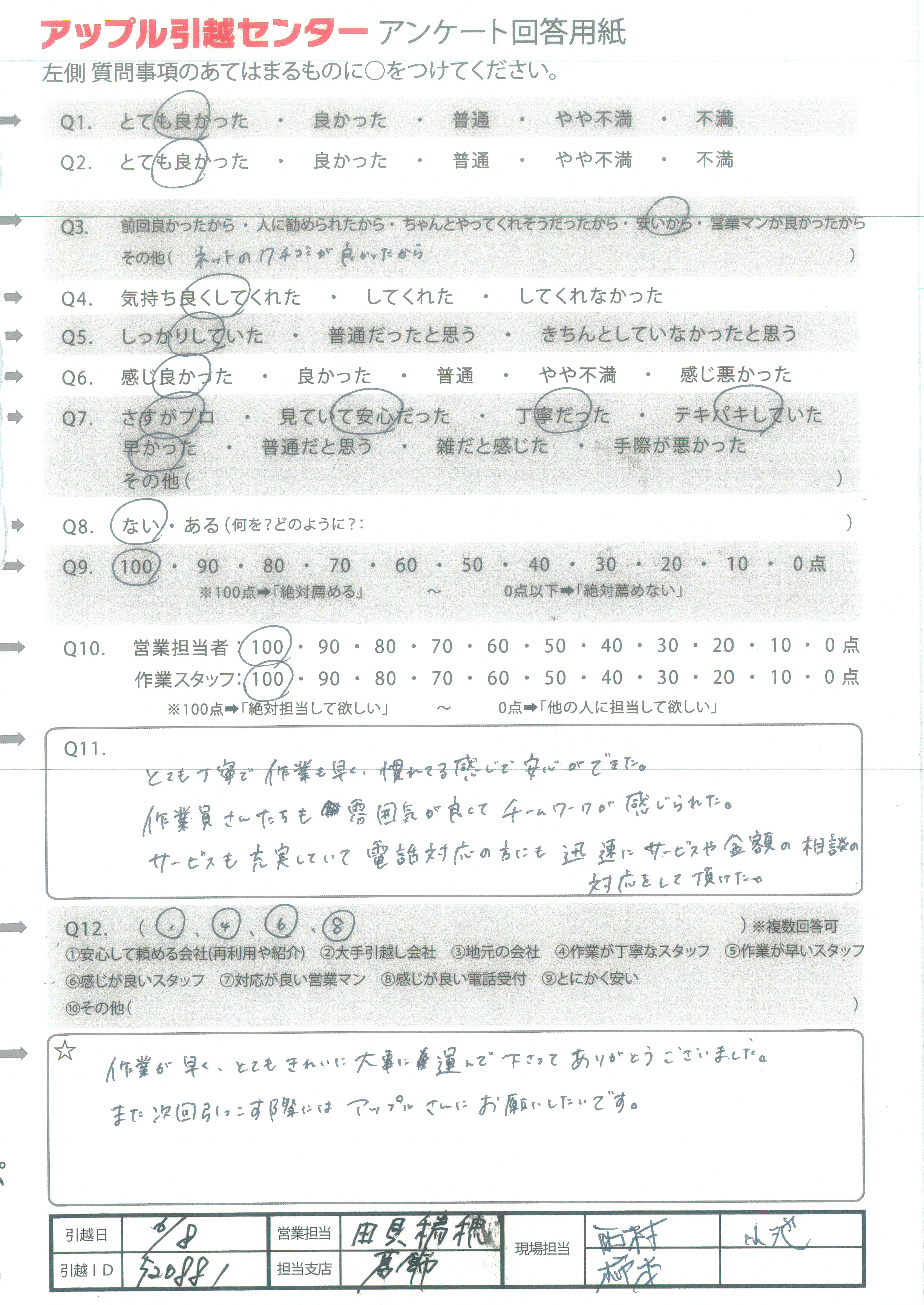 A.作業が早く、とてもきれいに大事に運んで下さってありがとうございました。 また次回引っこす際にはアップルさんにお願いしたいです。