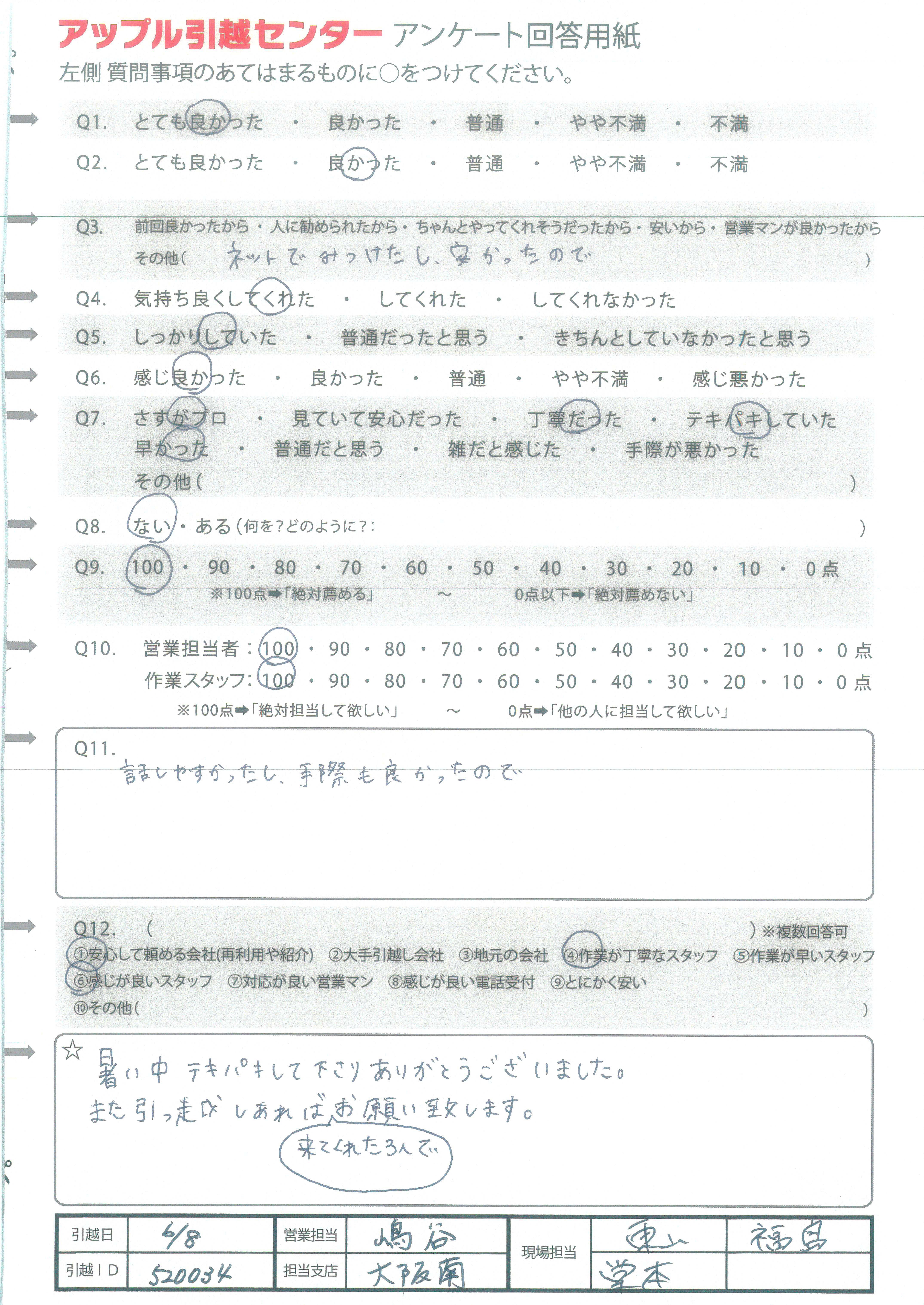 A.暑い中テキパキして下さりありがとうございました。 また引っ越しあれば来てくれた3人でお願い致します。