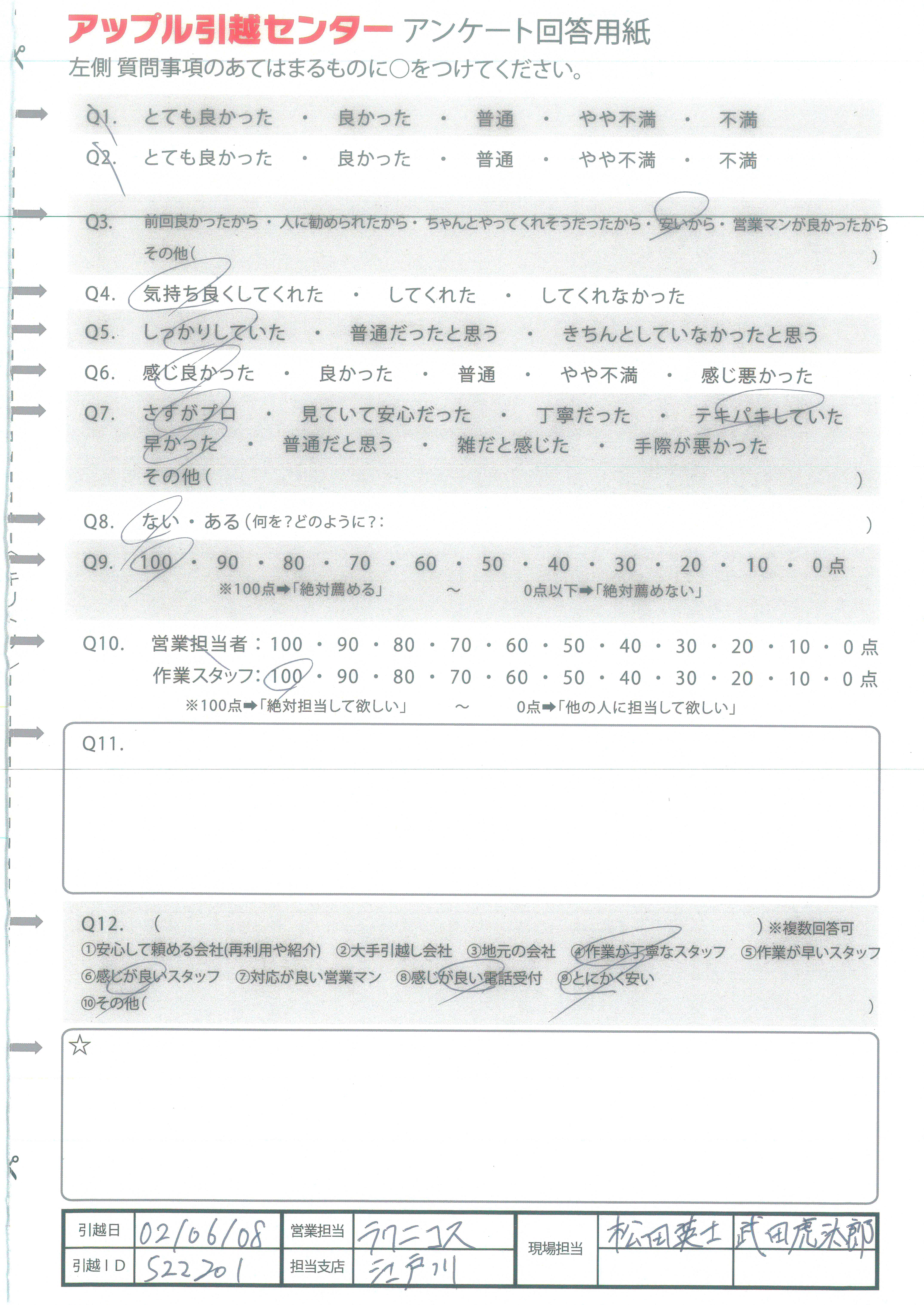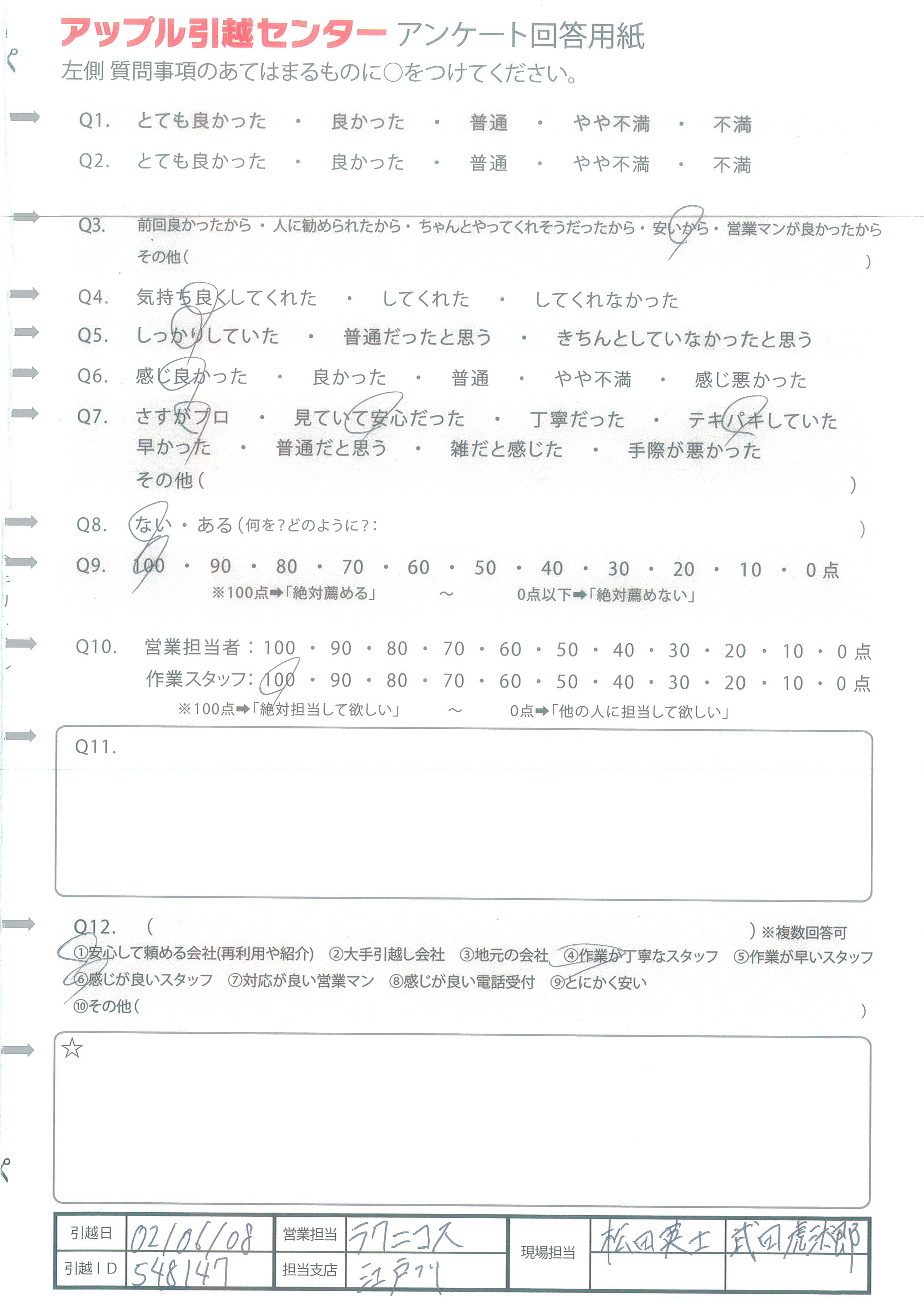 A.Q9について:地域により値段と作業開始時間の正確さに差があると思ったため Q10について:営業(電話対応をして下さった方)はふつうだった。感じ良かった。 作業スタッフはペンを持っていなかったり、メモ帳etc持ち物を忘れがちだった。(貸与しました(汗))