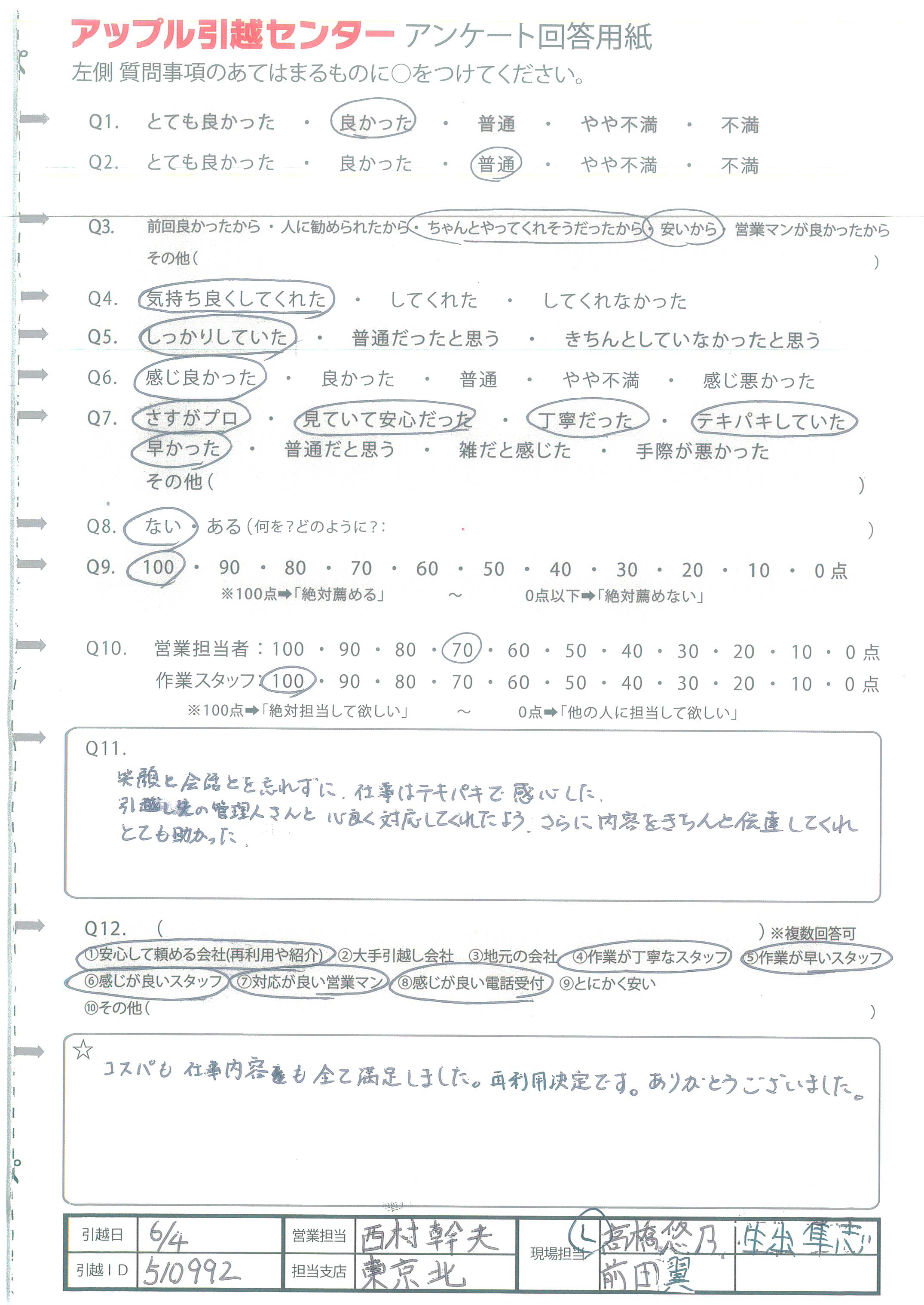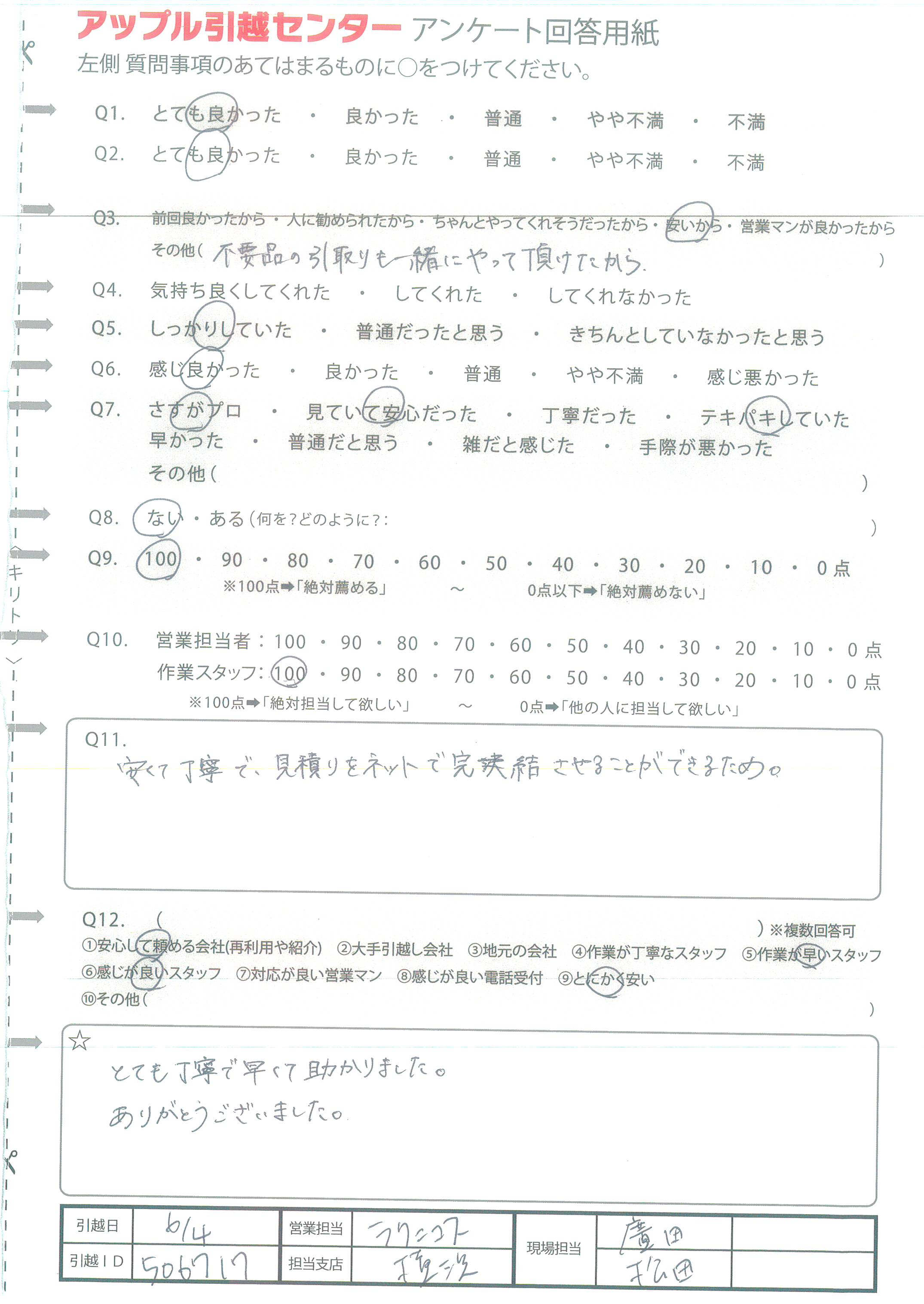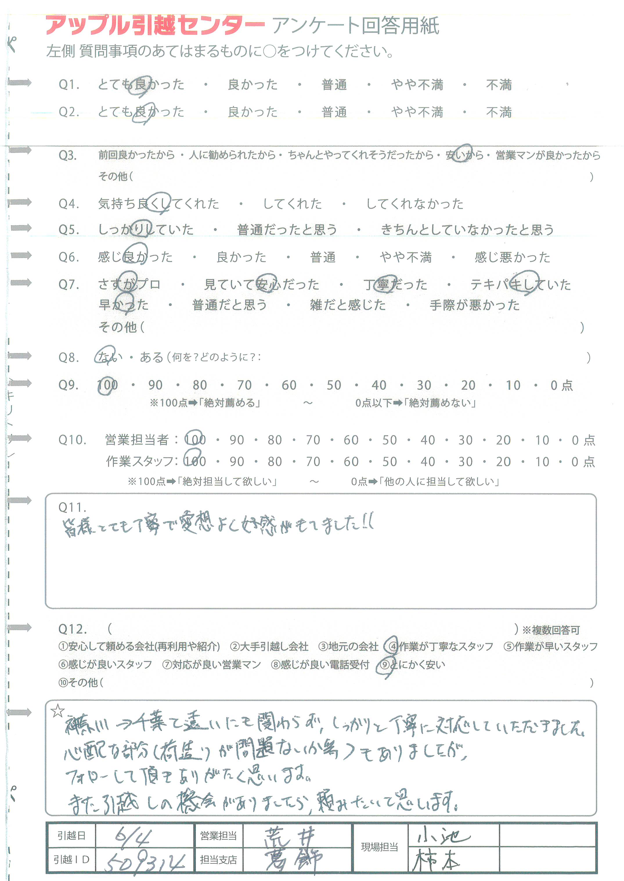 A.営業の方も引越の方もしっかりていねいな対応を してくださったため。引越の方は少しつらそうな時も 一言も文句を言わず行ってくださったため。