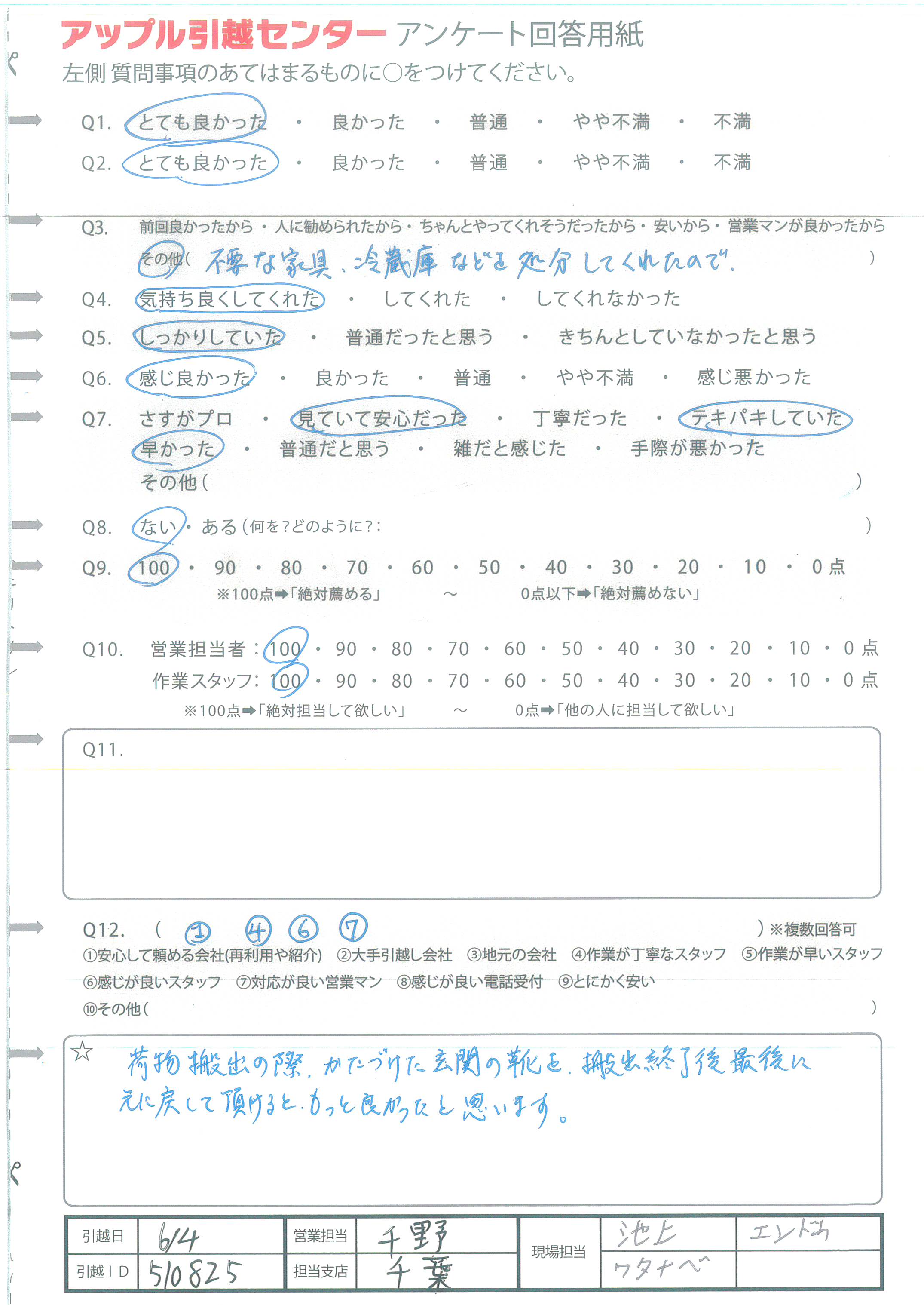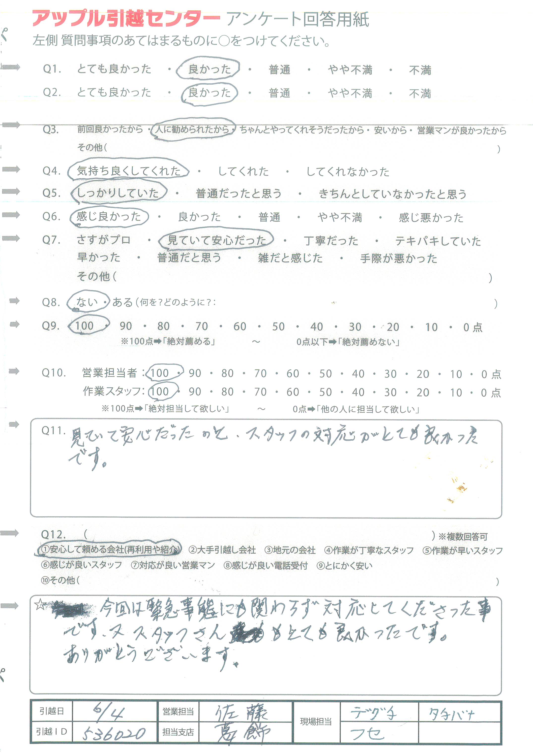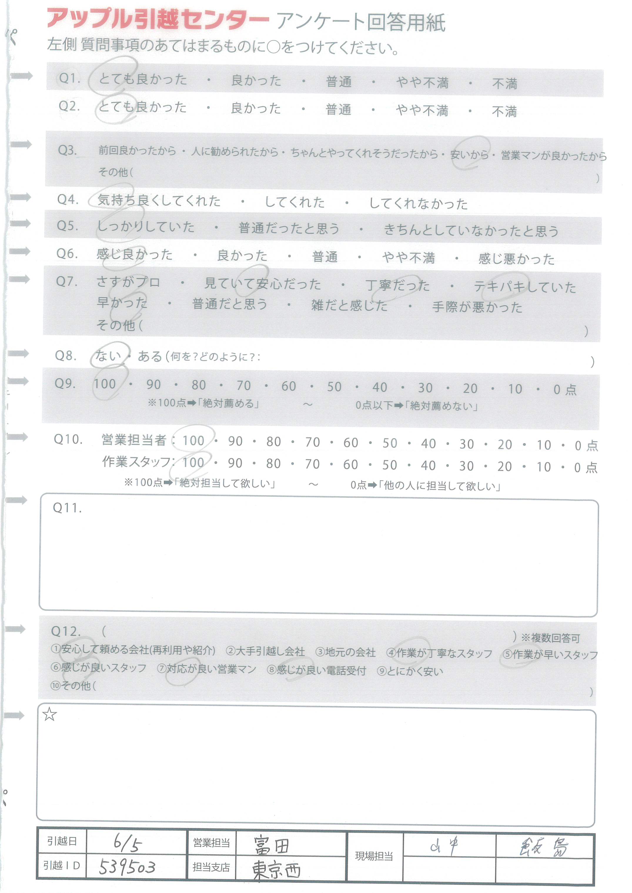 A.営業の方も引越の方もしっかりていねいな対応を してくださったため。引越の方は少しつらそうな時も 一言も文句を言わず行ってくださったため。