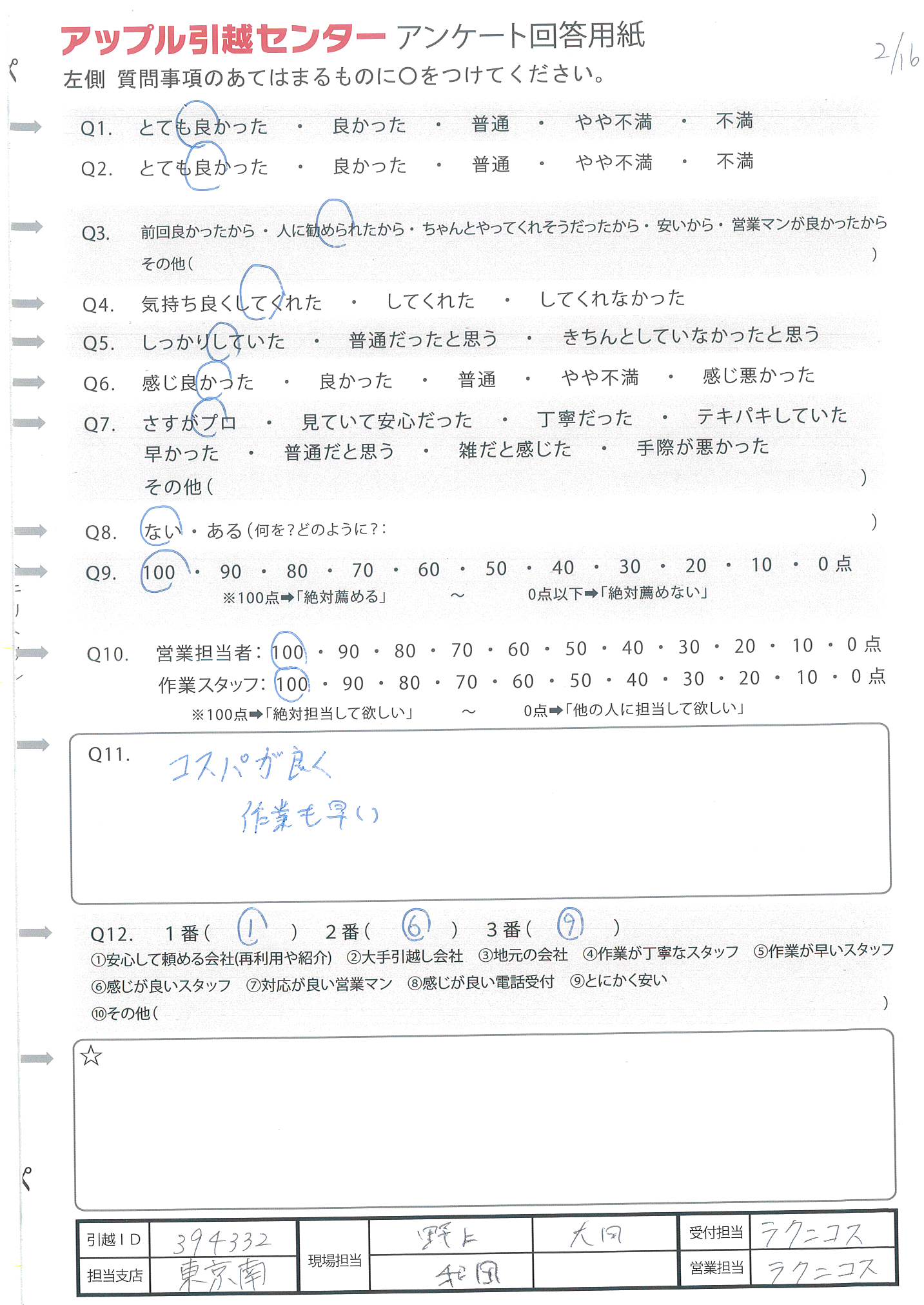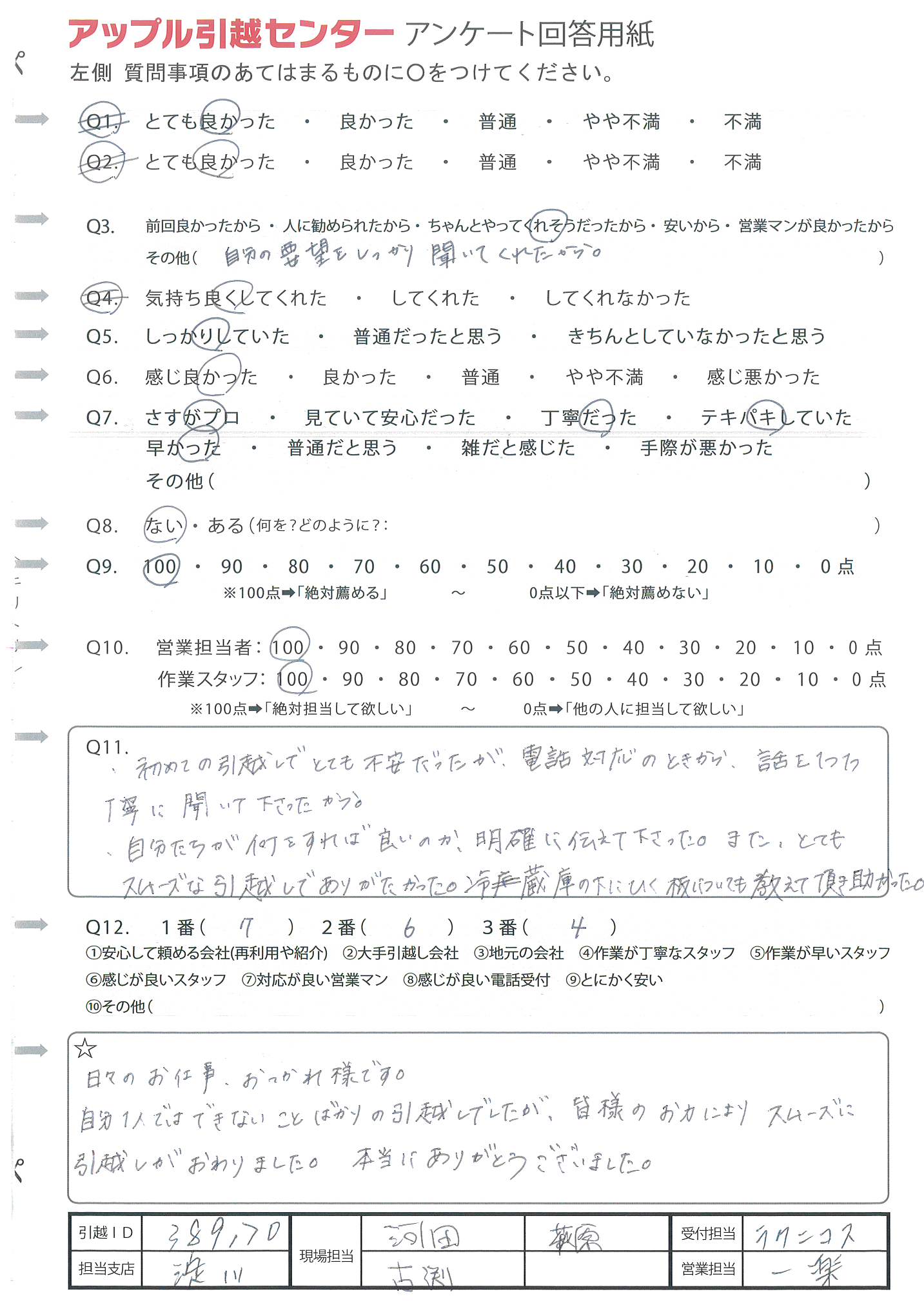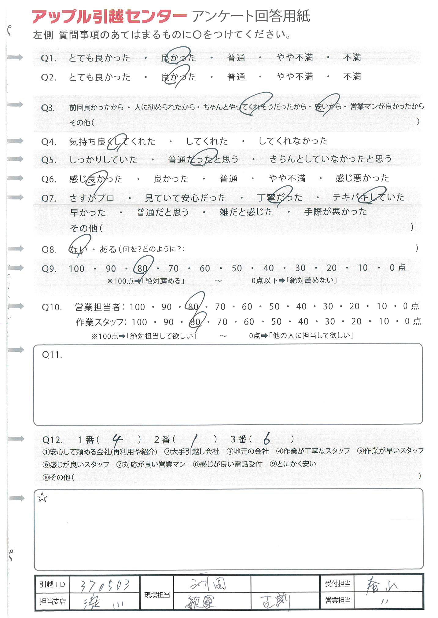 A.・初めての引越しでとても不安だったが、電対応のときから、話を1つ1つ丁寧に聞いて下さったから。 ・自分たちが何をすれば良いのか、明確に伝えて下さった。 また、とてもスムーズな引越しでありがたかった。 冷蔵庫の下にひく板についても教えて頂き助かった。