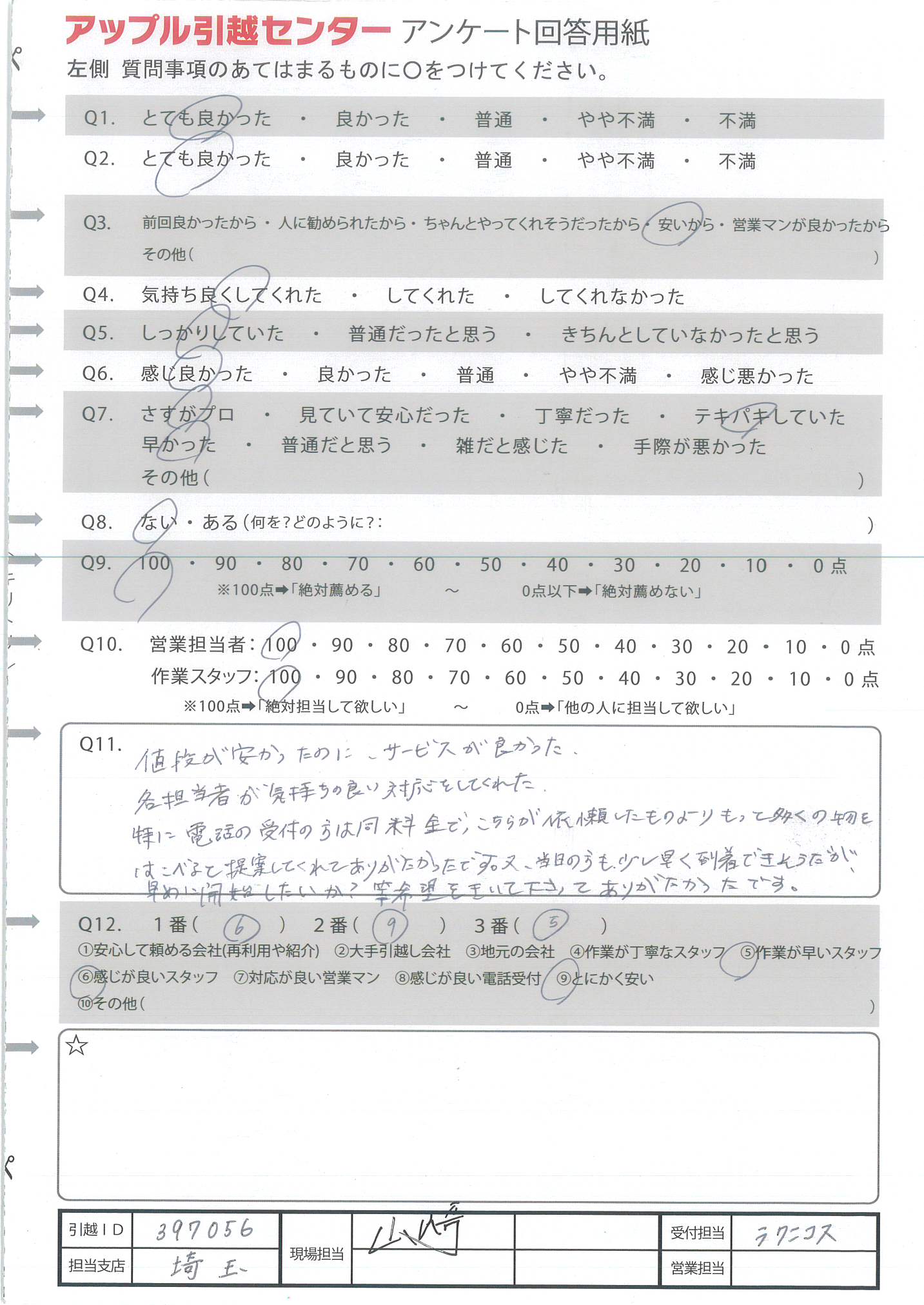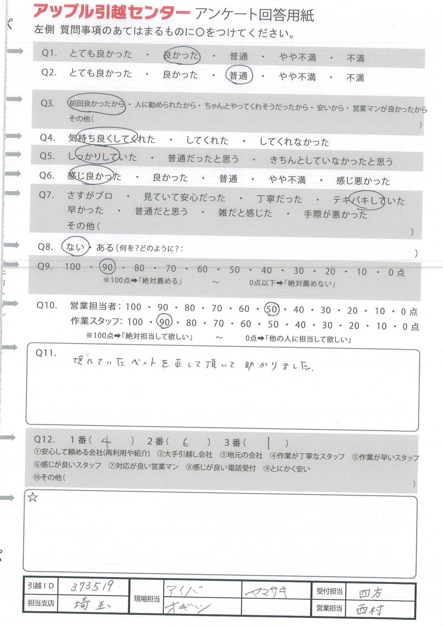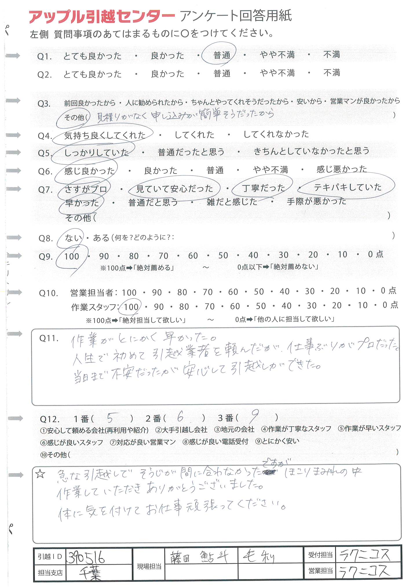 A.・初めての引越しでとても不安だったが、電対応のときから、話を1つ1つ丁寧に聞いて下さったから。 ・自分たちが何をすれば良いのか、明確に伝えて下さった。 また、とてもスムーズな引越しでありがたかった。 冷蔵庫の下にひく板についても教えて頂き助かった。