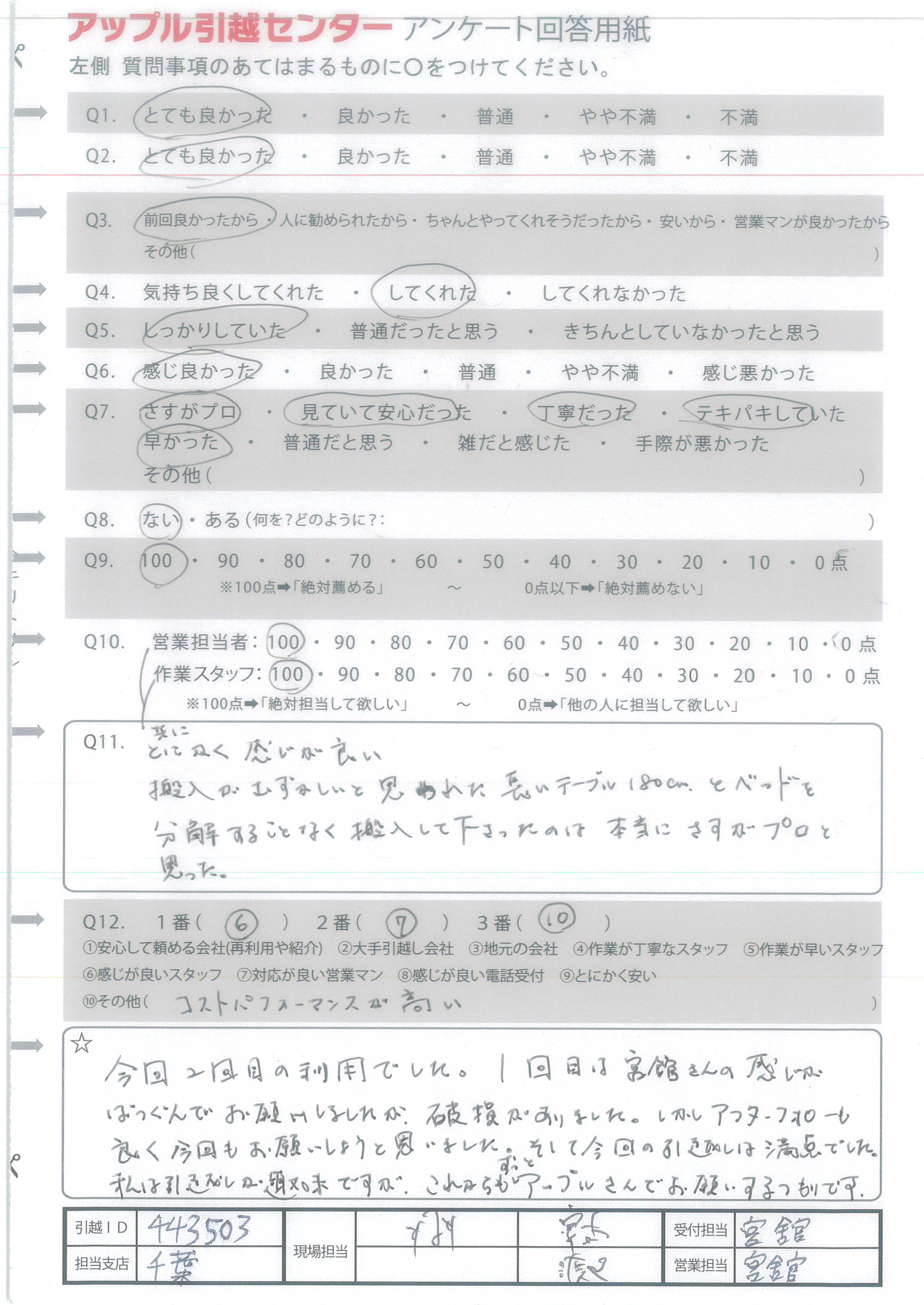 A.今回2回目の利用でした。1回目は宮舘さんの感じがばつぐんでお願いしましたが、破損がありました。しかし、アフターフォローも良く今回もお願いしようと思いました。そして今回の引越しは満点でした。私は引越しが趣味ですが、これからもずっとアップルさんでお願いするつもりです。
