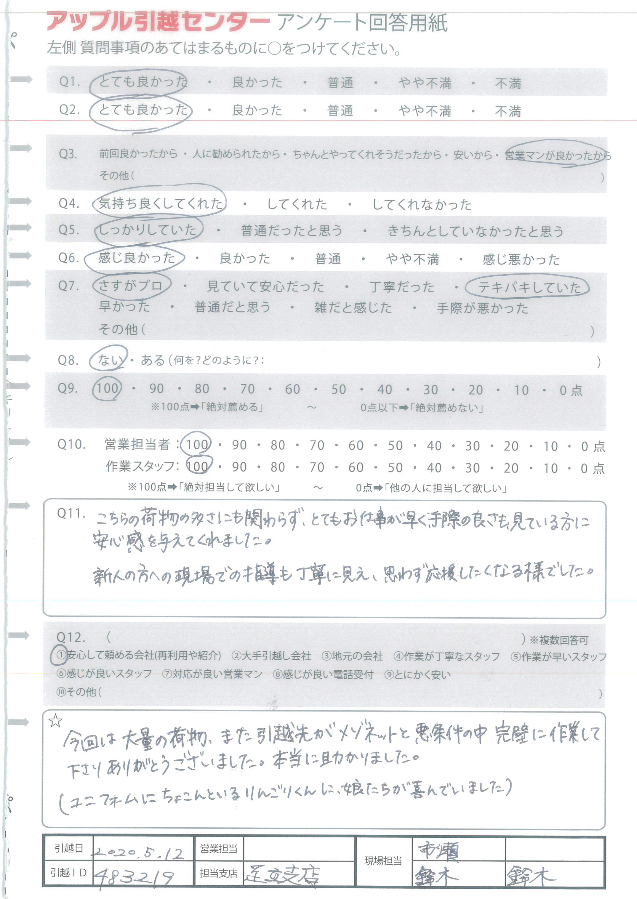 アップル引越センターでは、面映いお褒めの言葉も、胸に突き刺さるお叱りのコメントも、