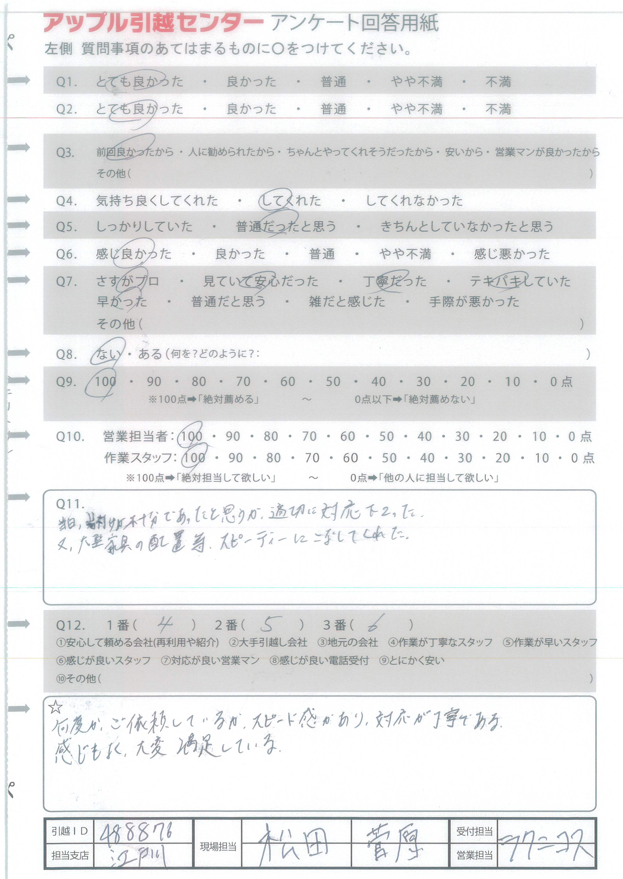 A.引っ越しの不安や緊張をやわらげてくれた。 さわやかで、礼儀正しく、丁寧な言葉で会話してくれた。 笑顔が良かった。