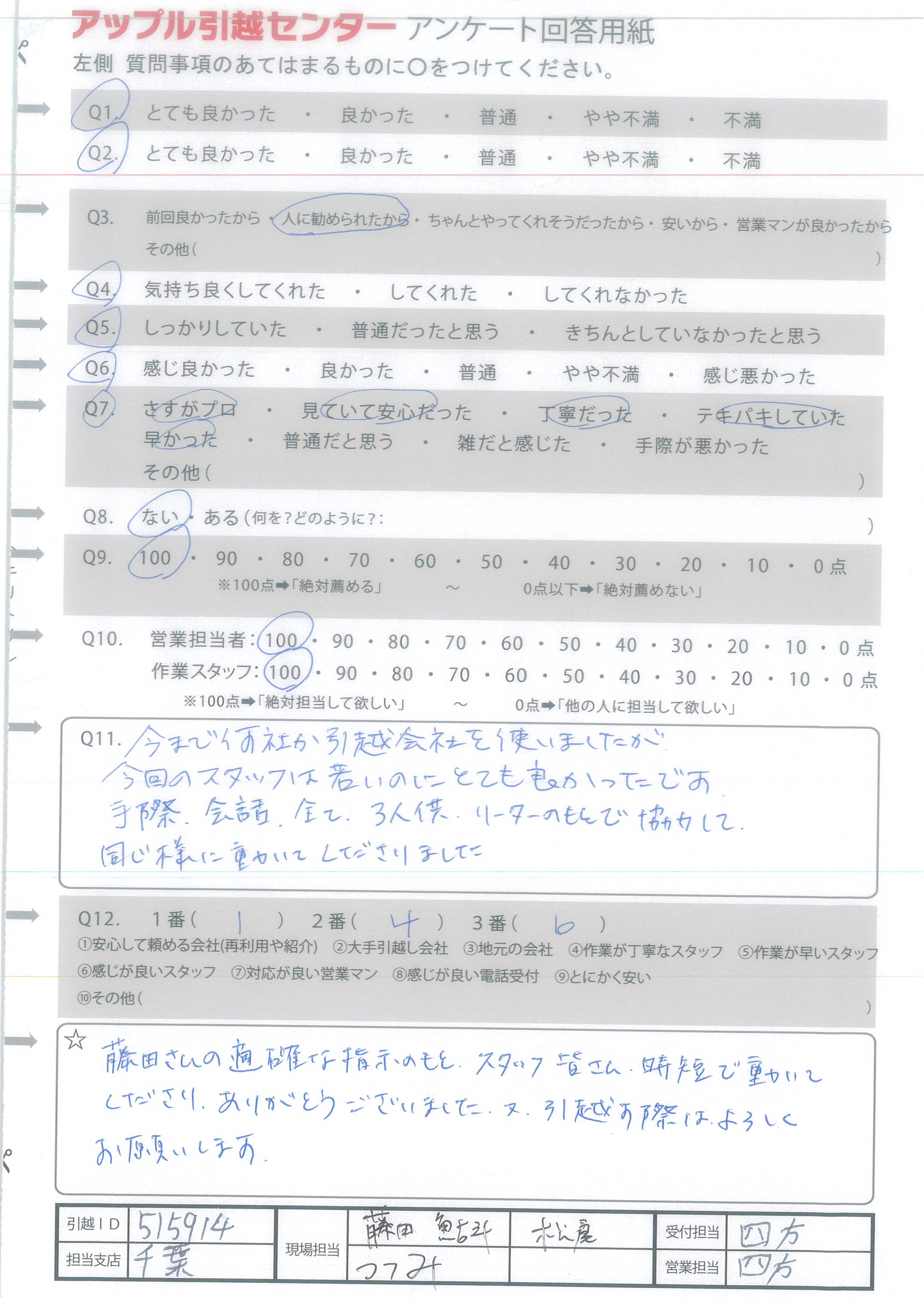 A.藤田さんの適確な指示のもと、スタッフ皆さん・時短で動いてくださり、ありがとうございました。又引越す際はよろしくお願いします。