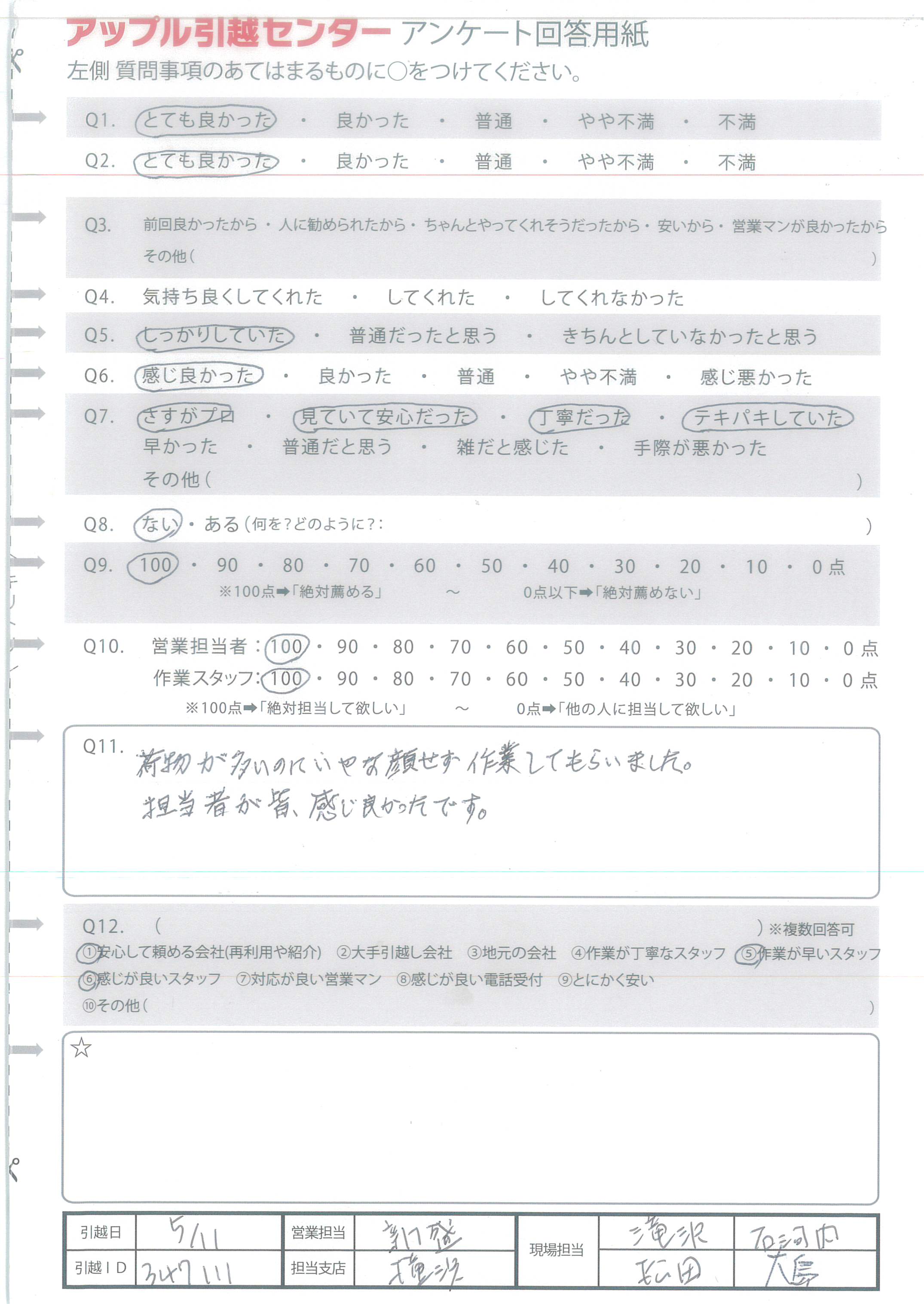 A.荷物が多いのにいやな顔せず作業してもらいました。 担当者が皆、感じ良かったです。