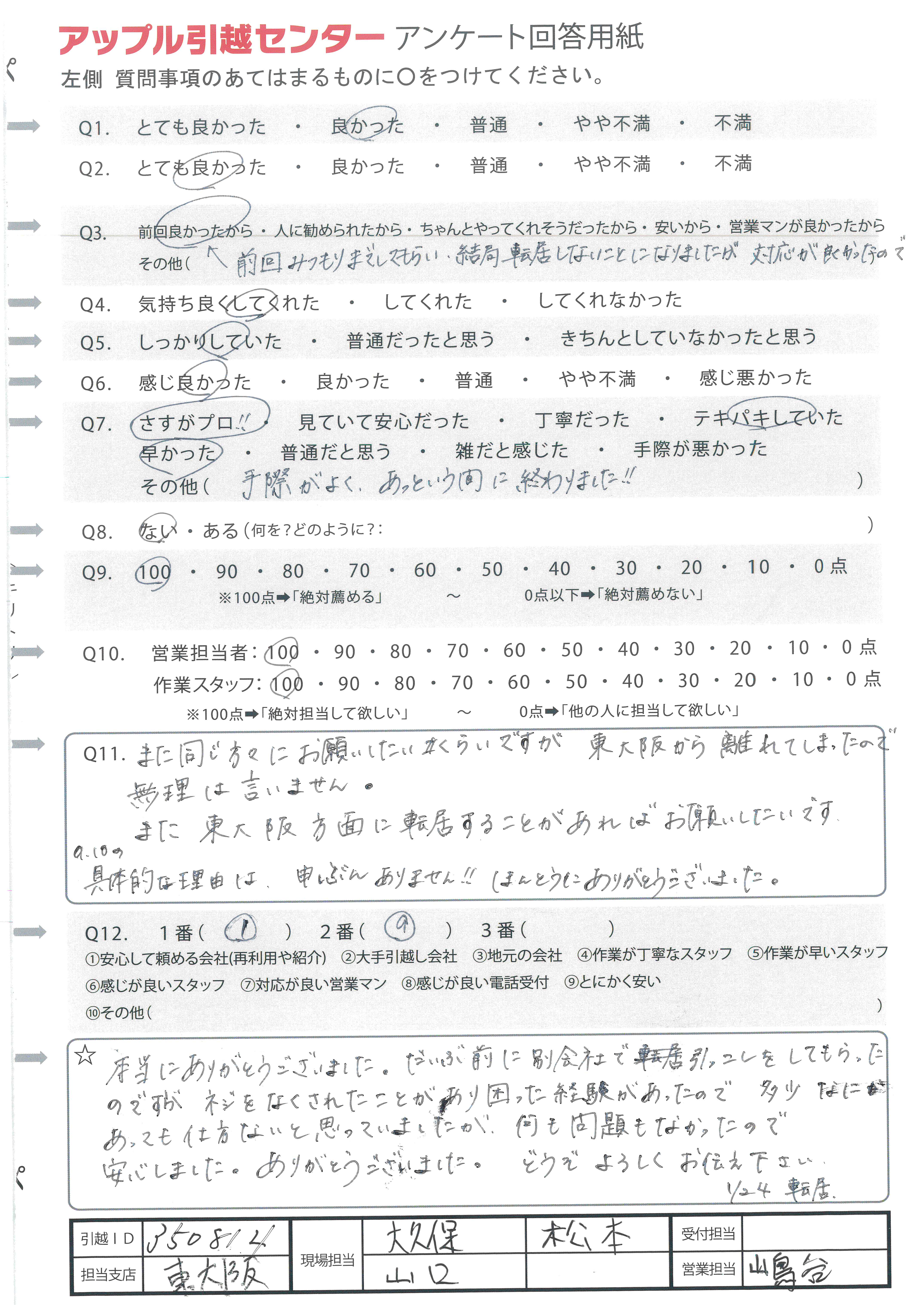 A.また同じ方々にお願いしたいくらいですが東大阪から離れてしまったので無理は言いません。 また東大阪方面に転居することがあればお願いしたいです。 Q10の具体的な理由は、申し分ありません!! ほんとうにありがとうございました。
