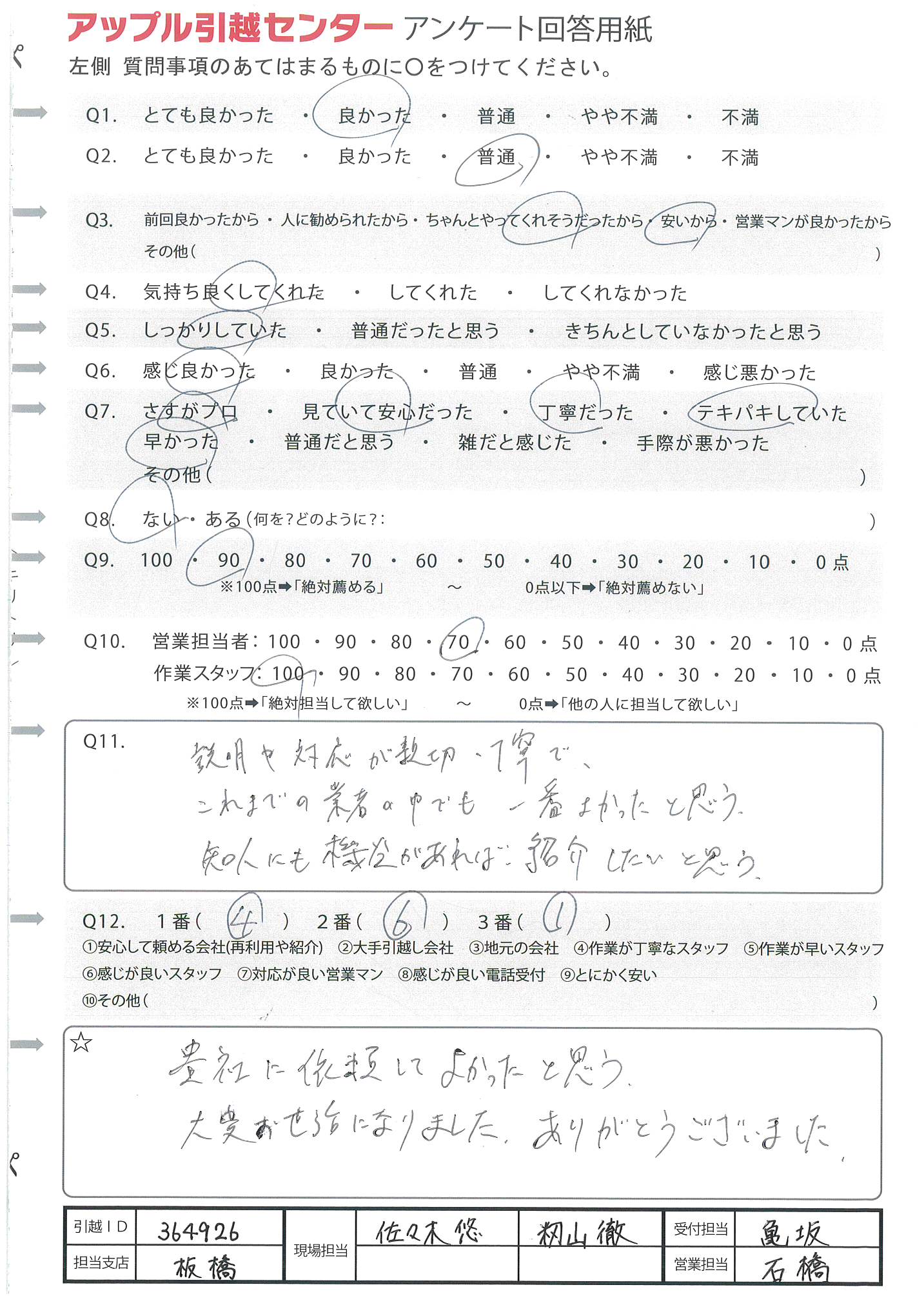 A.今回アップル引越センターにお願いしてとても良かったと思っています。 新しい生活を始めるにあたって感謝しています。 又、機会があればよろしくお願いします。