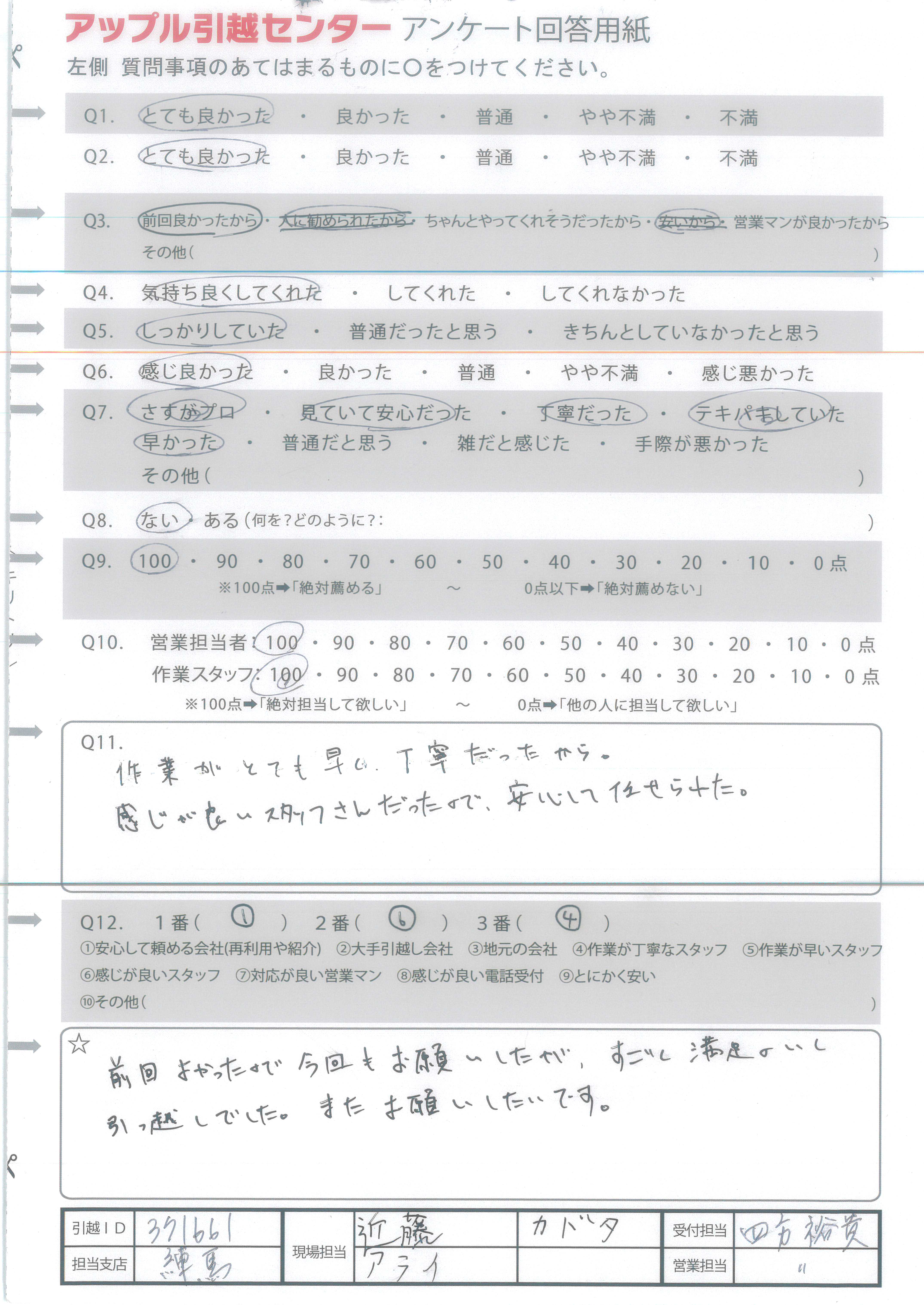 A.前回よかったので今回もお願いしたが、すごく満足のいく引っ越しでした。またお願いしたいです。