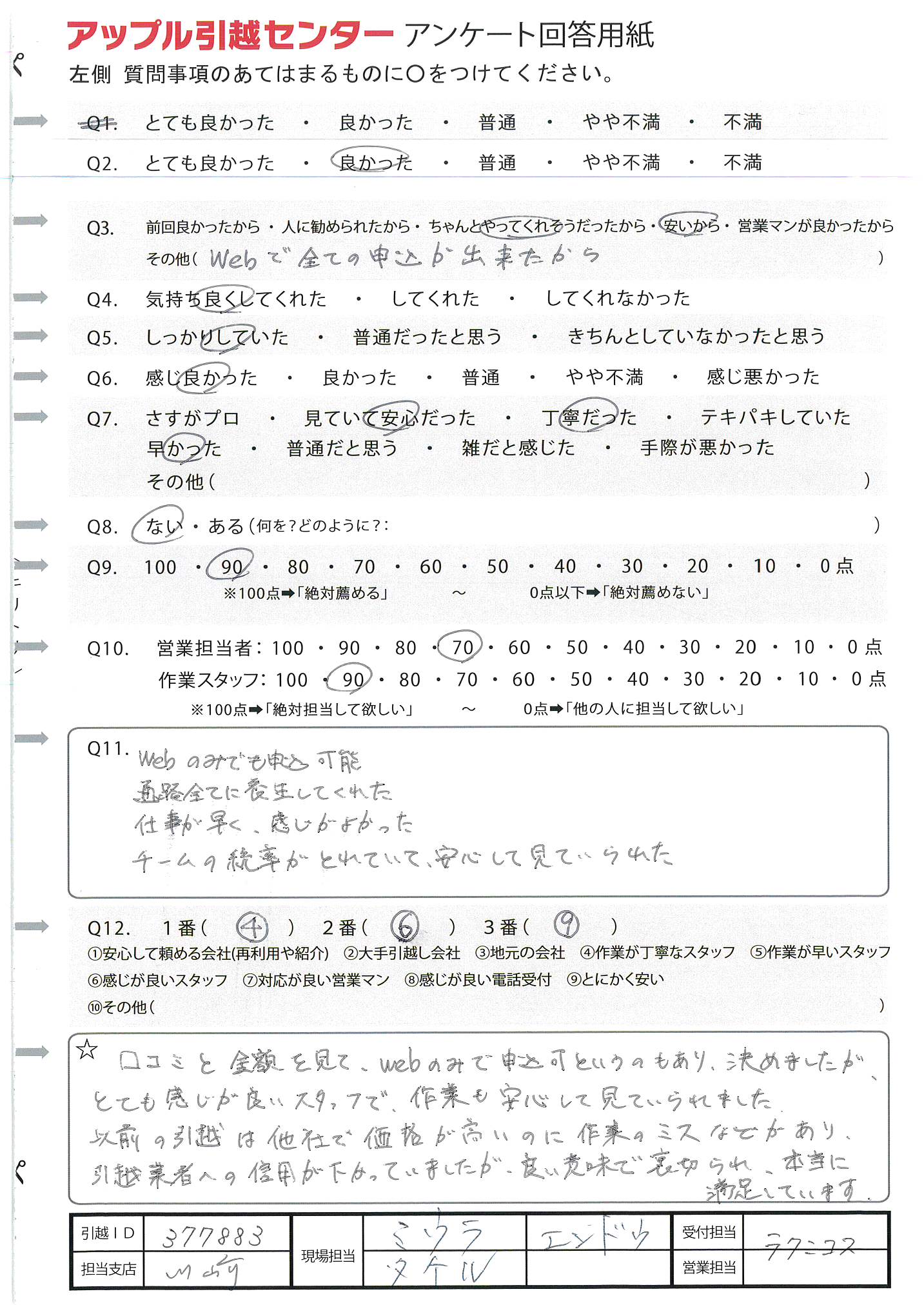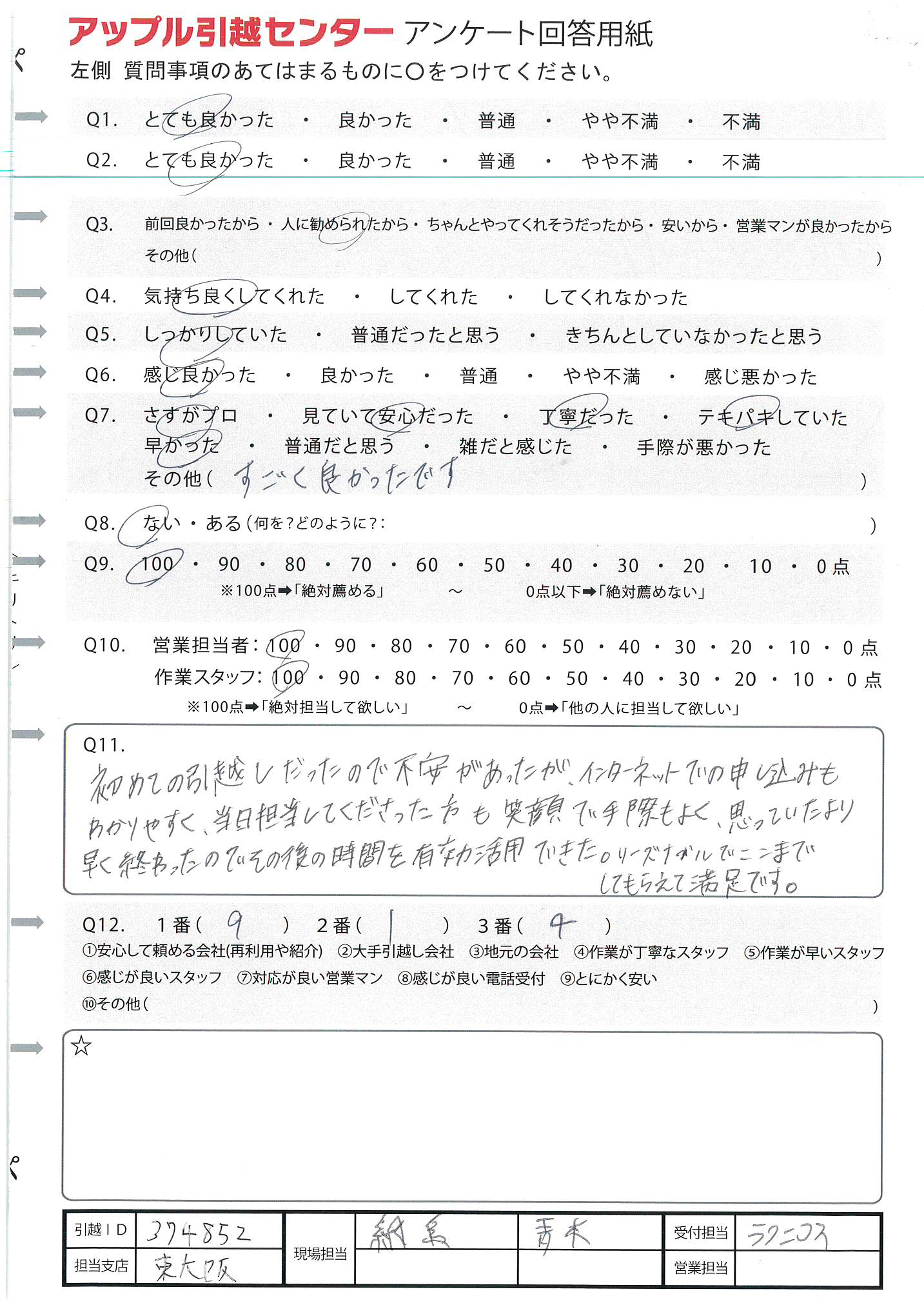 A.初めての引越しだったので不安があったが、インターネットでの申し込みもわかりやすく、 当日担当してくださった方も笑顔で手際もよく、思っていたより早く終わったのでその後の 時間を有効活用できた。リーズナブルでここまでしてもらえて満足です。