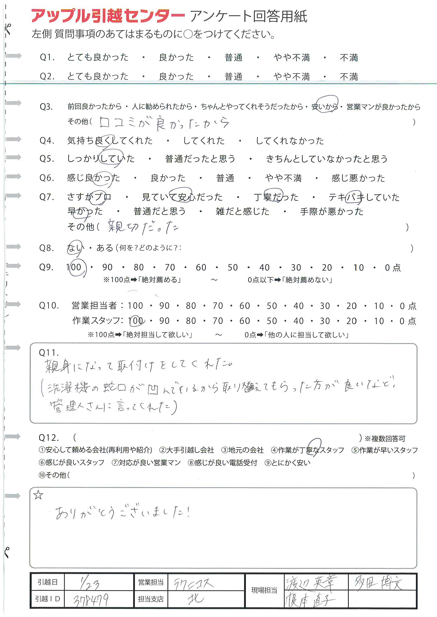 A.本当に文句のつけようがなかったです。 これからもこのまま続けていただきたいです。 次に引っ越す際もお願いしたいです。