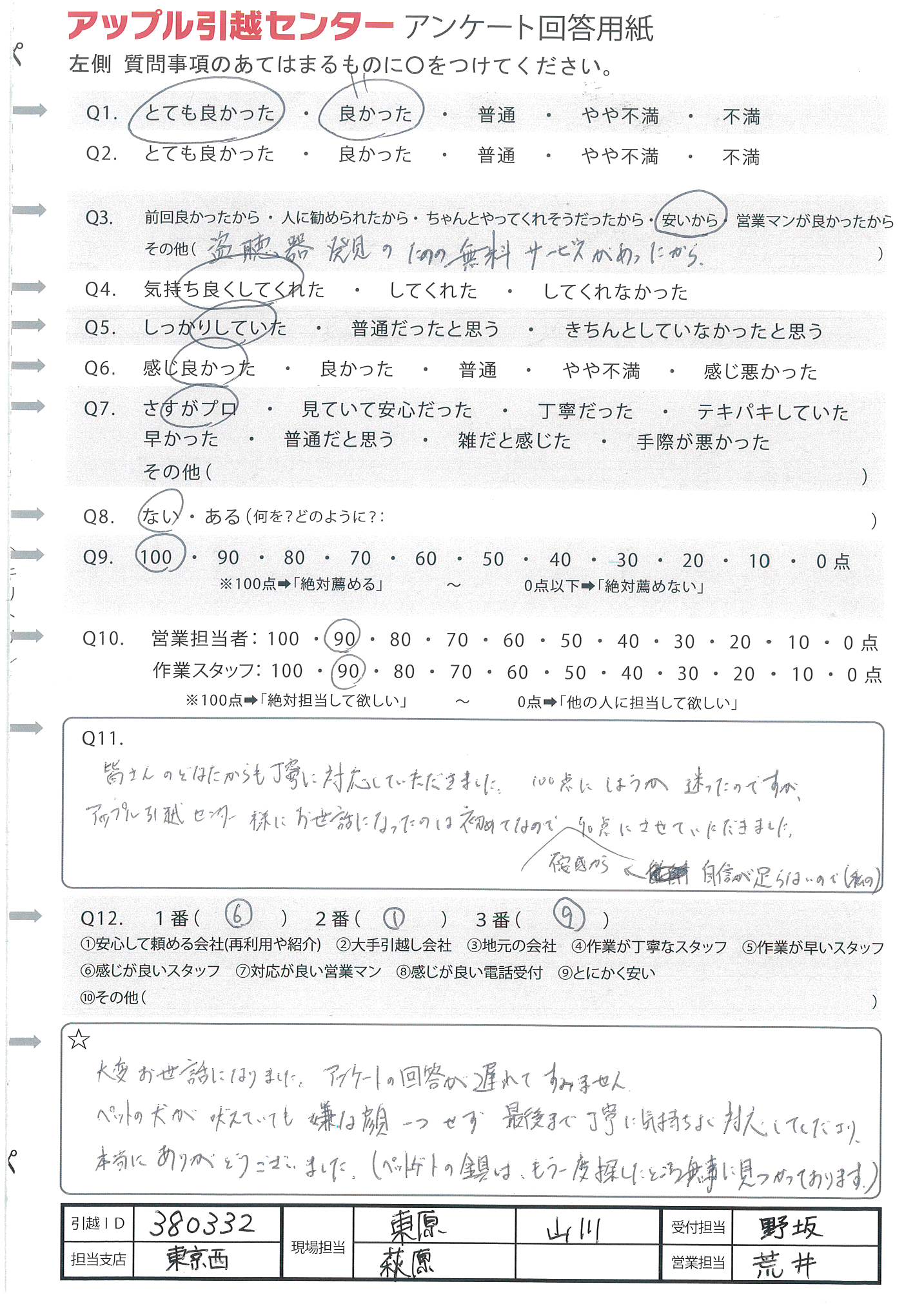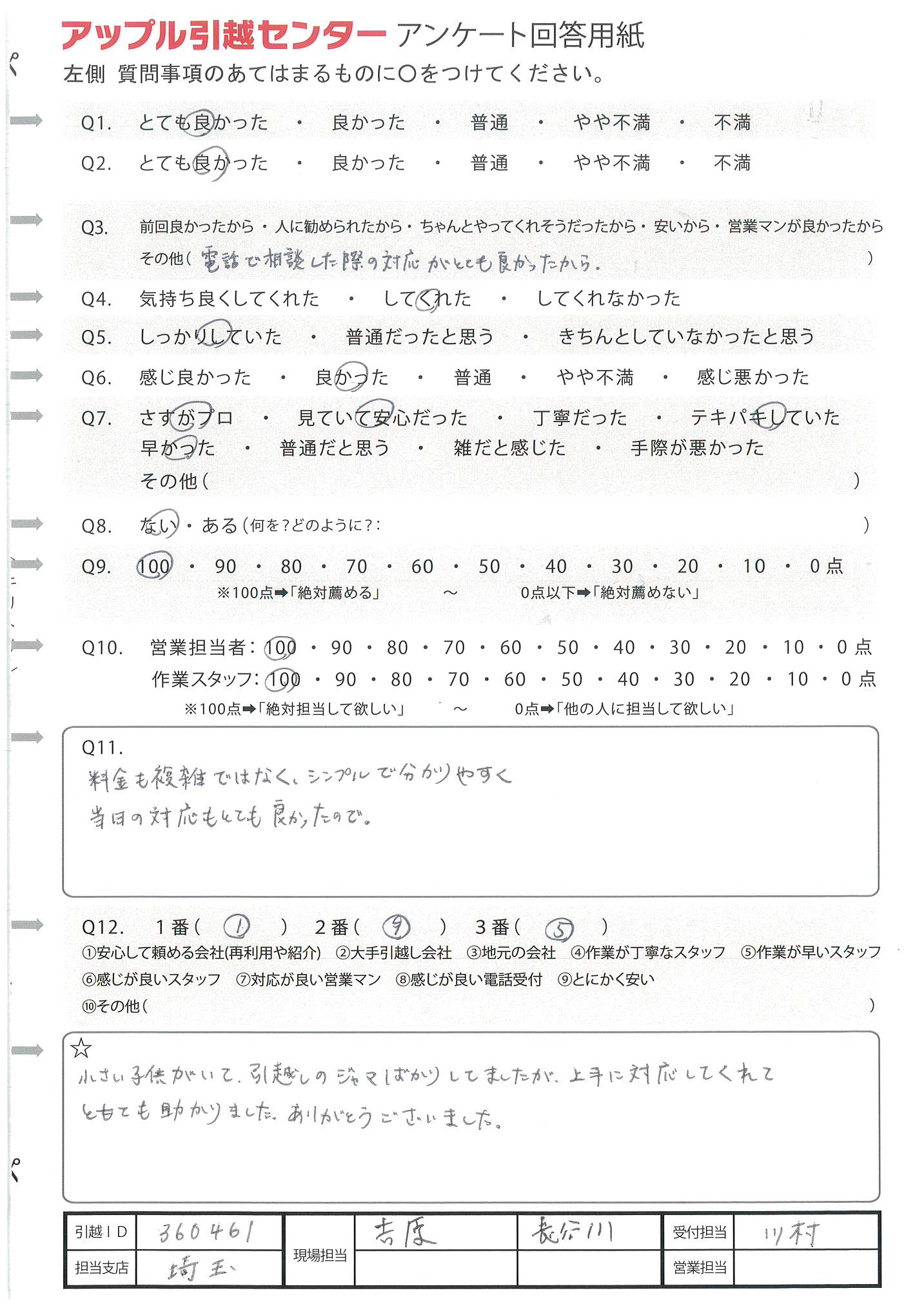 A.アンケートを失念しておりました。 この間、家族の引っ越しがありましたが、貴社を紹介した所、実際にお願いしたとこでした。