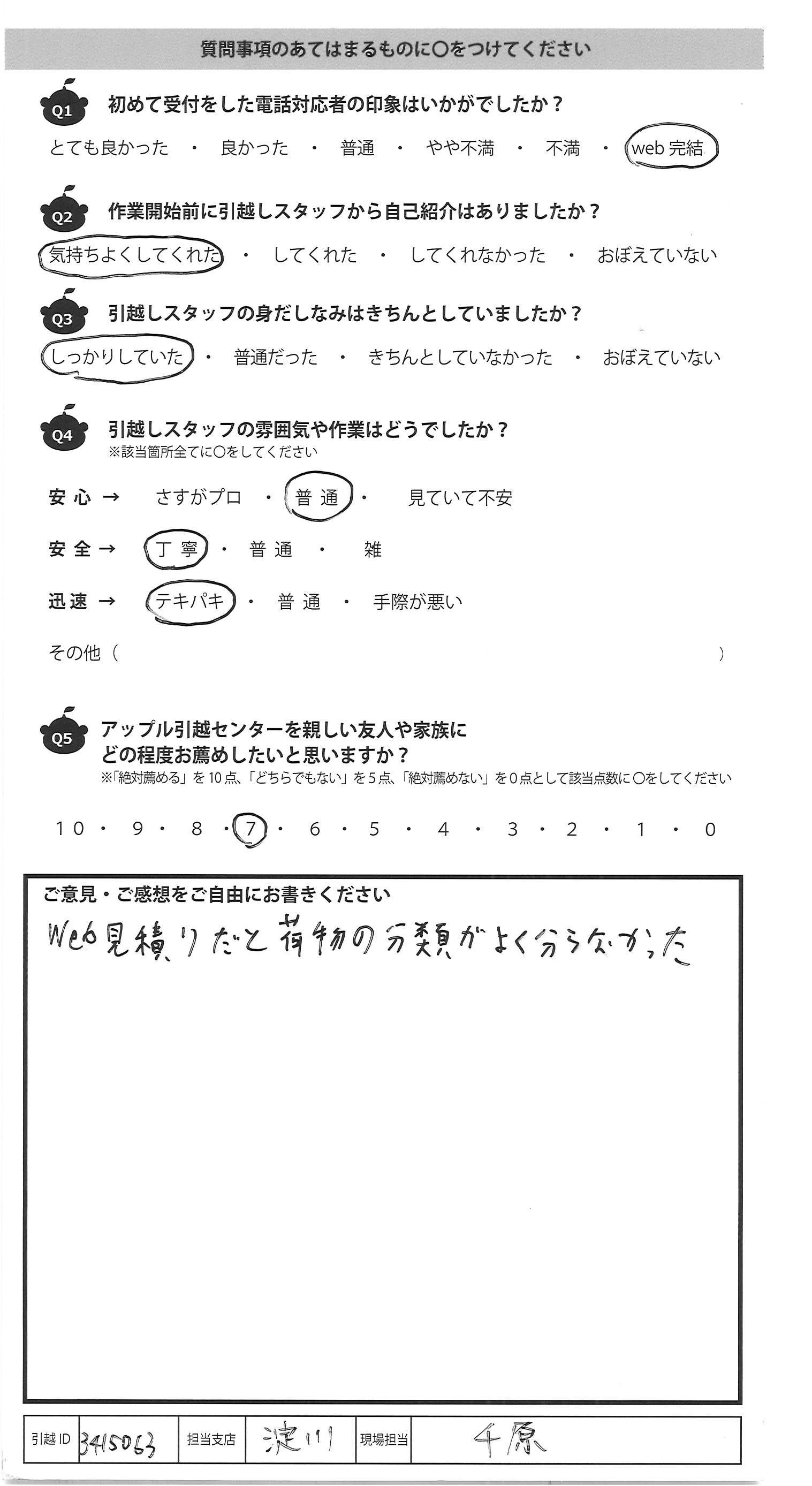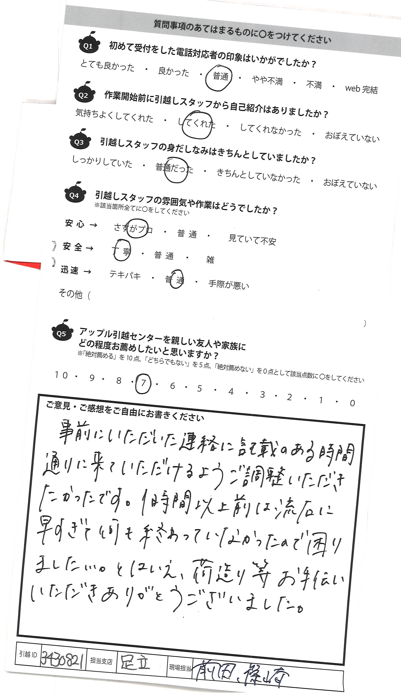 A.事前にいただいた連絡に記載のある時間 通りに来ていただけるようご調整いただき たかったです。1時間以上前は流石に 早すぎて何も終わっていなかったので困り ました…。とはいえ、荷造り等お手伝い いただきありがとうございました。