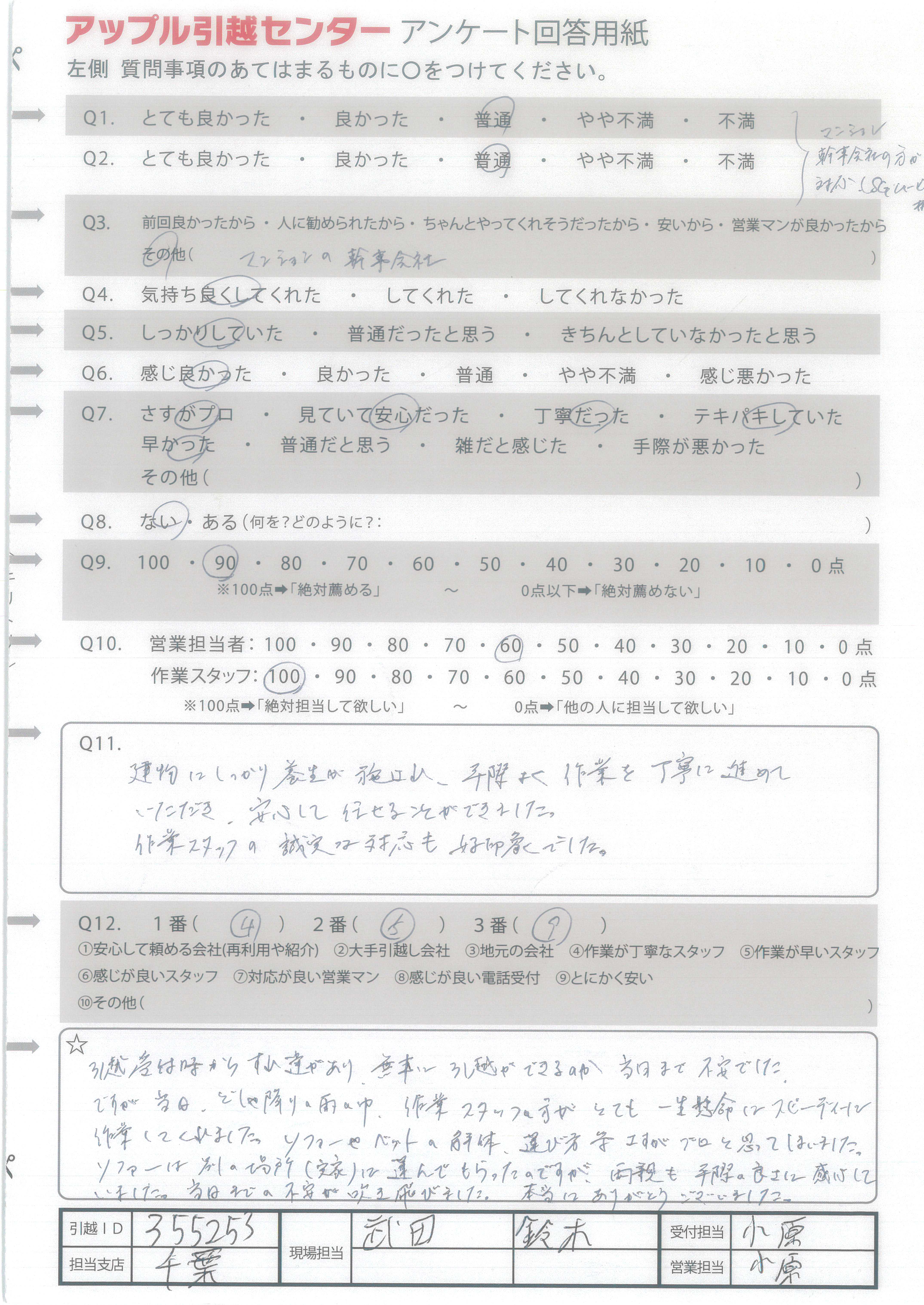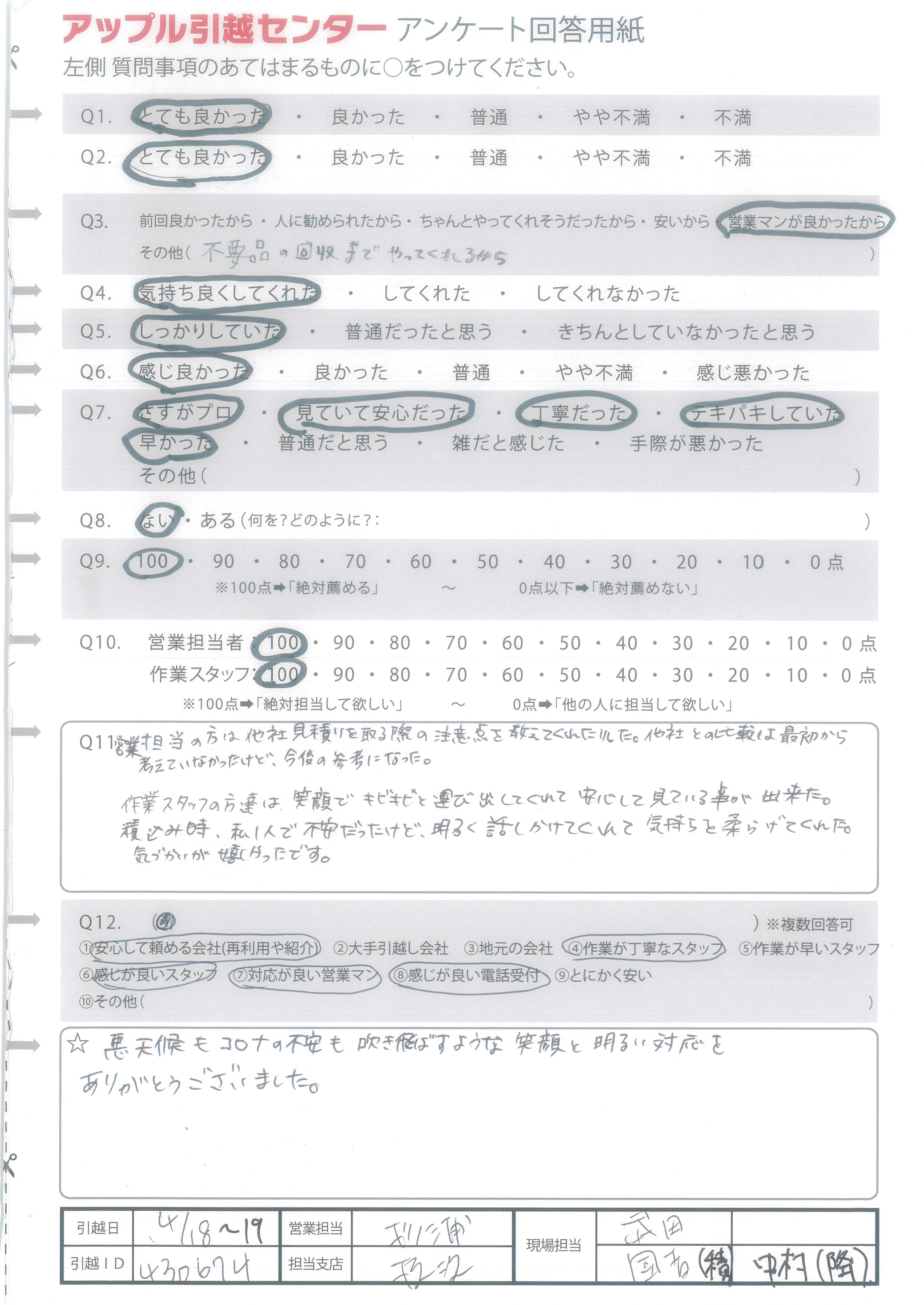 A.てきぱきした対応でよかったです。 段ボールが足りないまま引越日を迎えてしまいましたが、予備の段ボールで補充して下さり助かりました。 後日の引越日の変更で連絡がとりにくかった(遅かった)のと引越当日はコロナに気をつけてマスクを着用頂きたかったので100点ではないです。